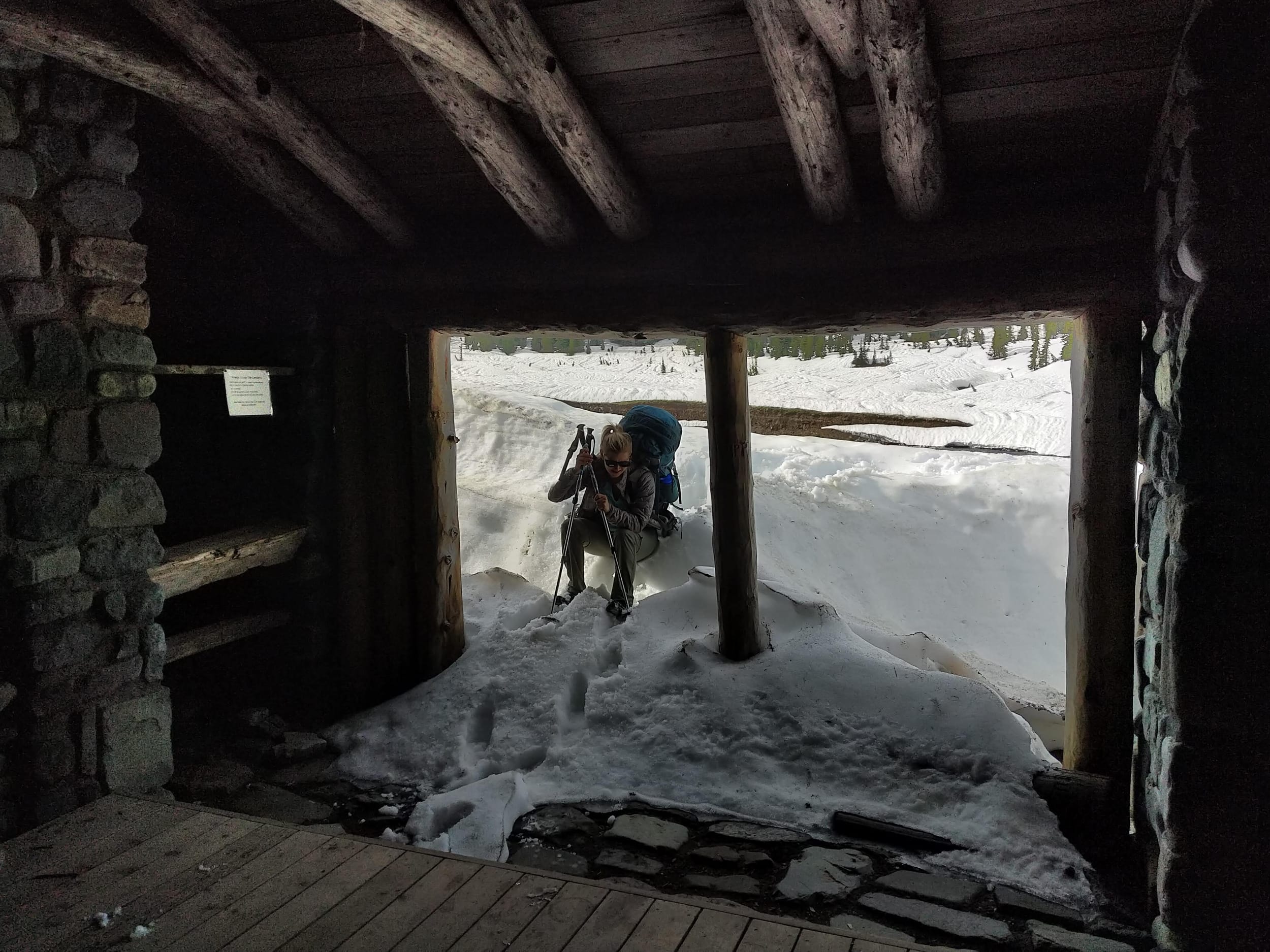 I was fully expecting us to sleep on the snow that night, but we lucked out and found a small hikers shelter that we could just barely get into (sliding through a tunnel in the snow). Definitely lifted our spirits after a hard day’s hike. We set our tent up inside and had a wonderful night.