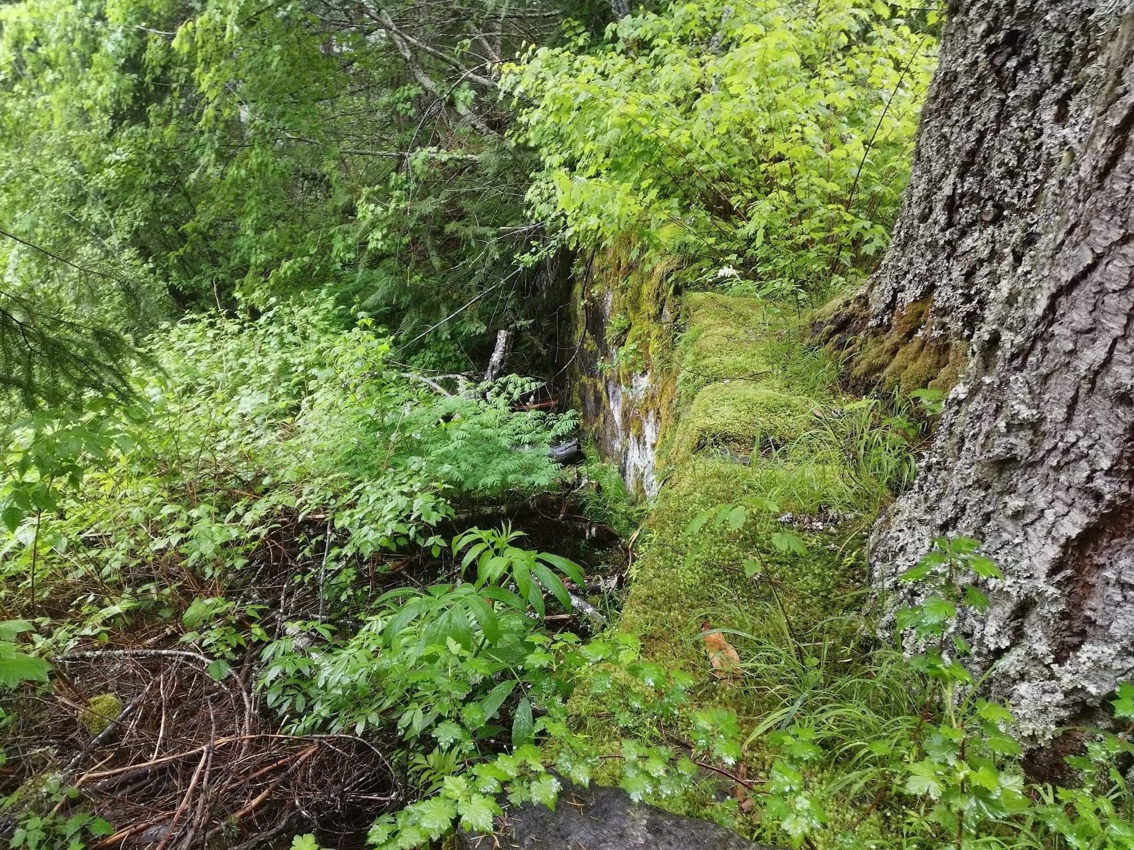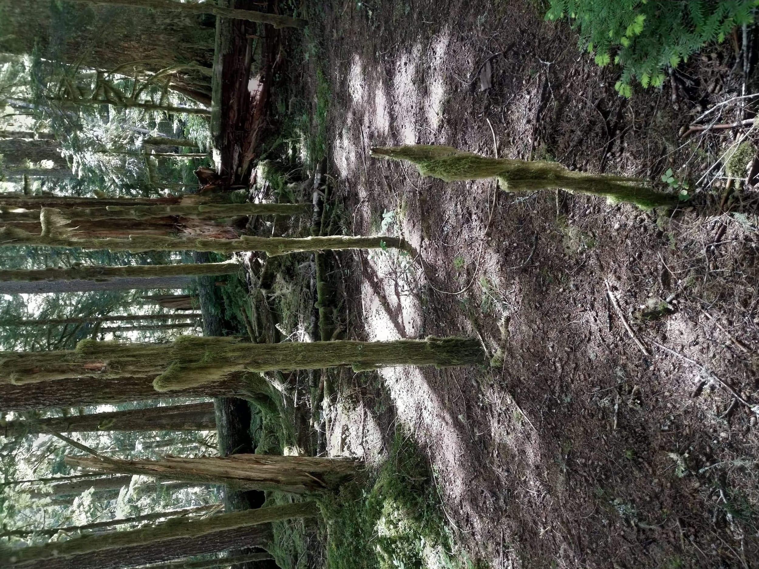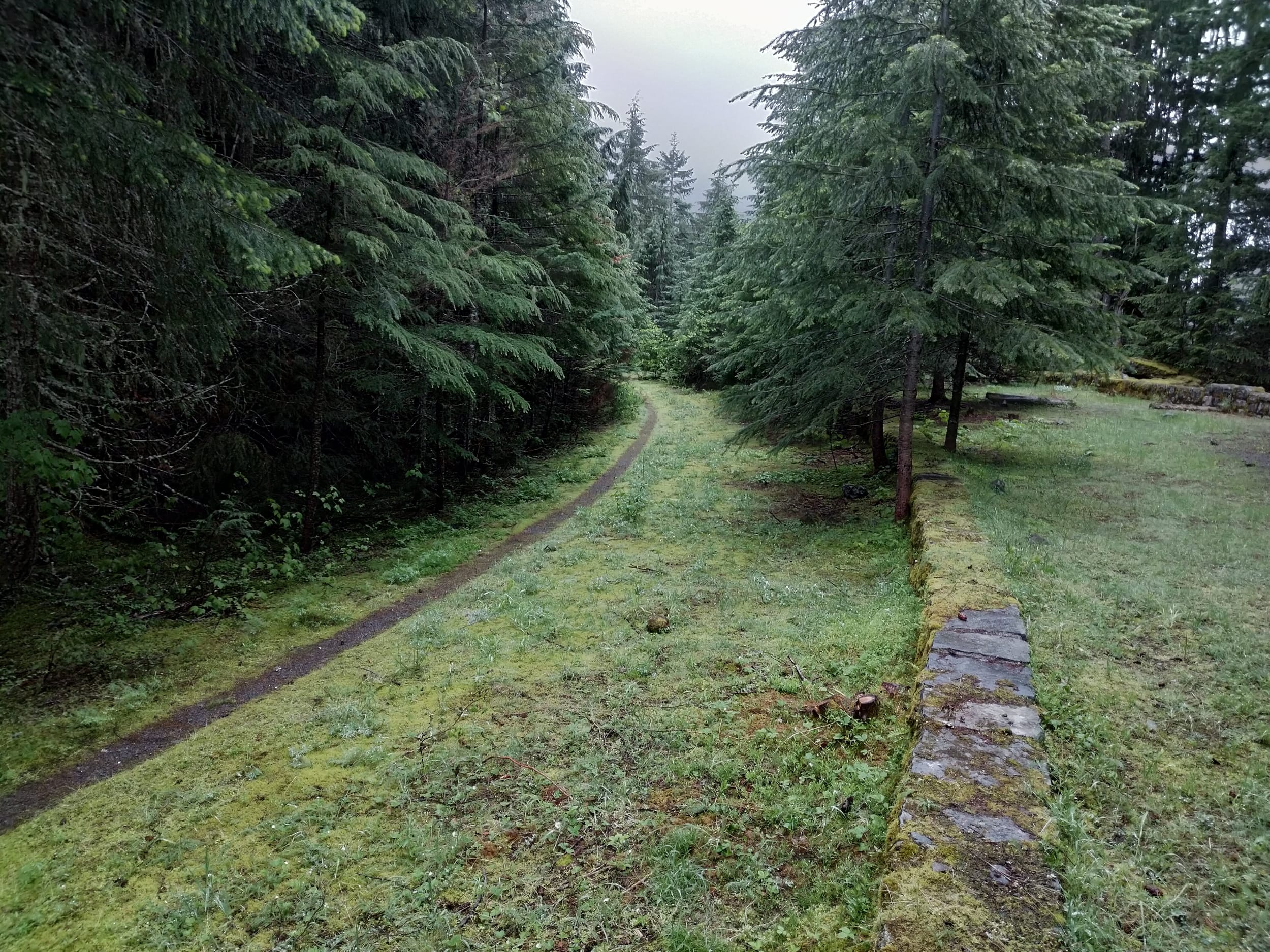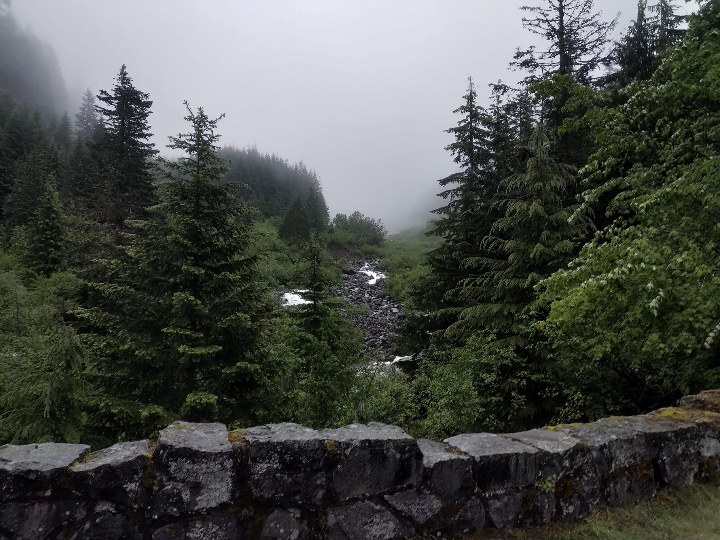 Popping out of the thick forest, we saw a small stone wall that made up the end of the Westside road. Apparently, the original plan was for Westside Road to reach all the way to Mowiich Lake (two days from now on our trail) but construction was stopped in the 1930’s after reaching Klapache Point because the road kept washing out at Tahoma Creek. You can still see where the road once went - leveled terrain, stone borders, etc with forest growth still encroaching into the old road bed. Another fun little moment of history…