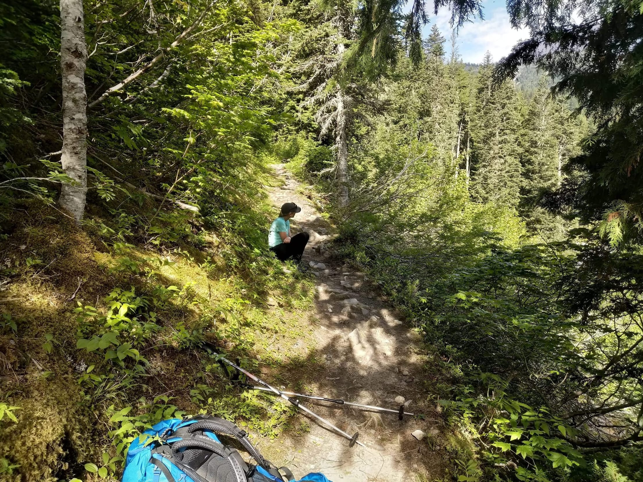 The boulder field we had to climb up, where we emerged, and taking a quick break after the scramble. It’s hard to see from the pictures, but this was about 1000 feet of elevation gain up the bolder field to get back on to the trail (plus pushing our way through bushes to get to the top).