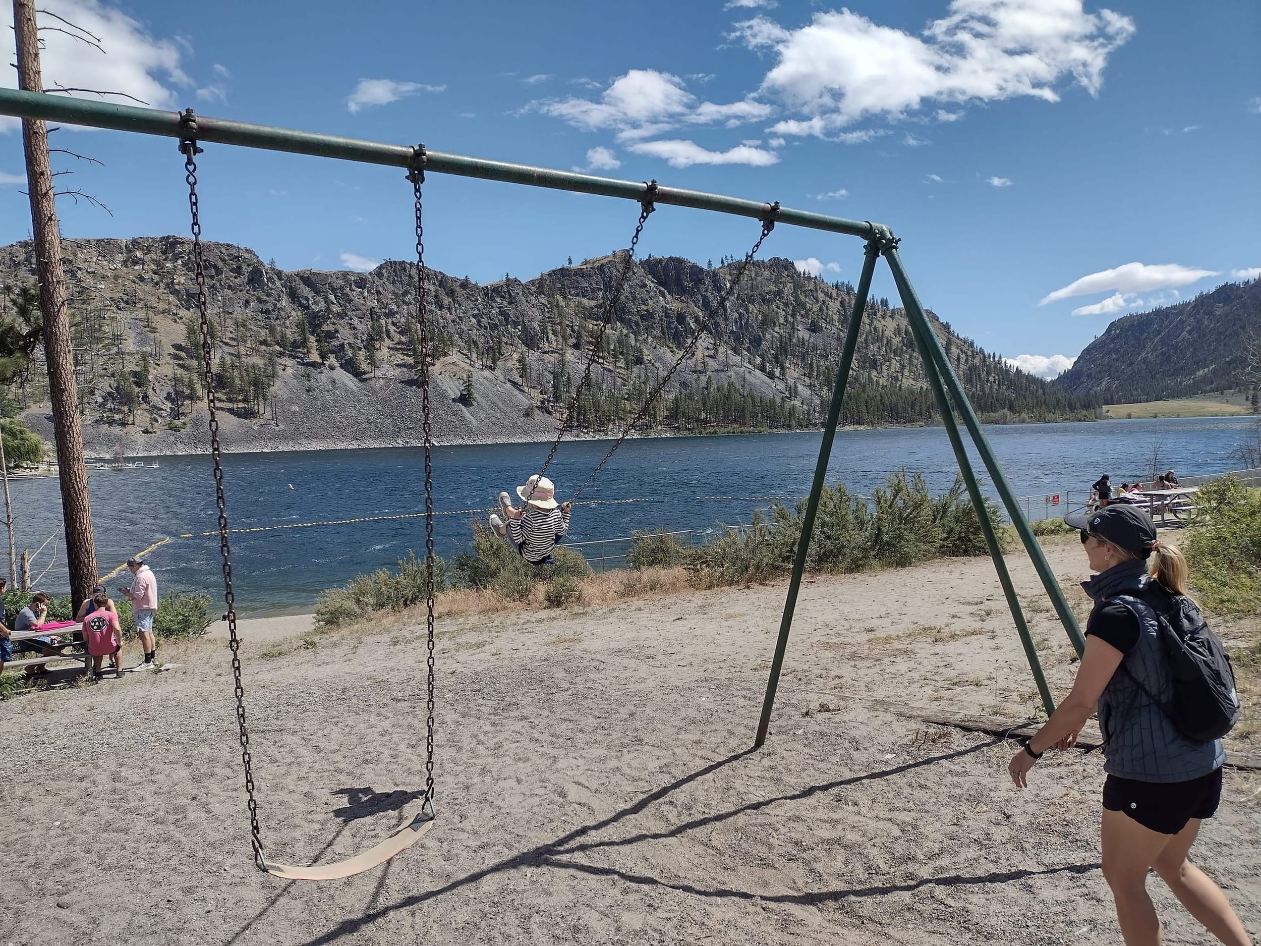 When we arrived on Saturday, it was just a bit after noon. We started exploring round the lake and found swings and some beach area and a small shack with snacks/ice cream. We had to go swinging first and then we decided to take off on a hike. It was a beautiful trail, but it quickly started going straight up… It got pretty steap near the end with pretty big drop offs, we had to keep a close eye on Sara and hold her hand the whole second half. But it was worth it for the views at the end… :)