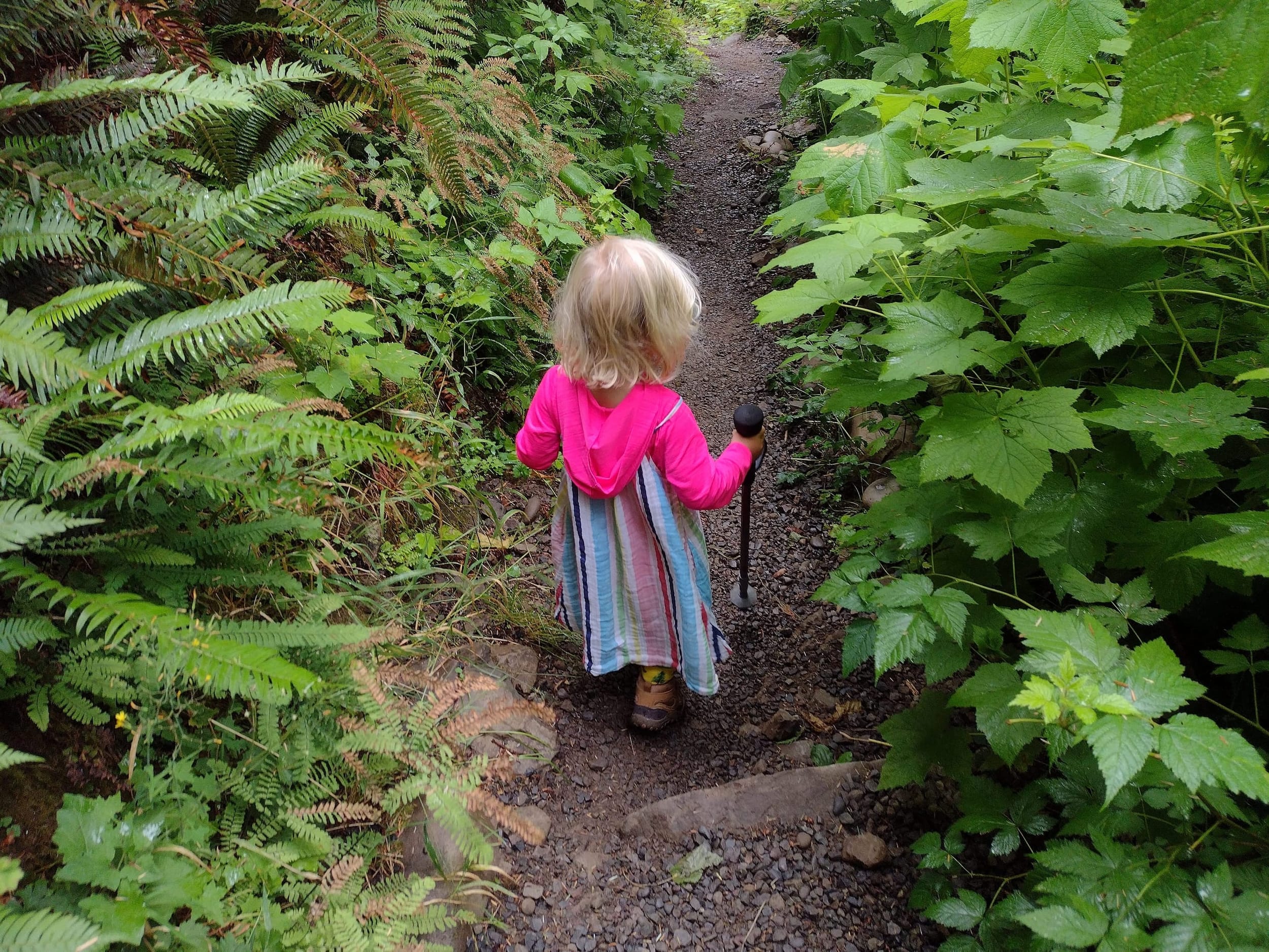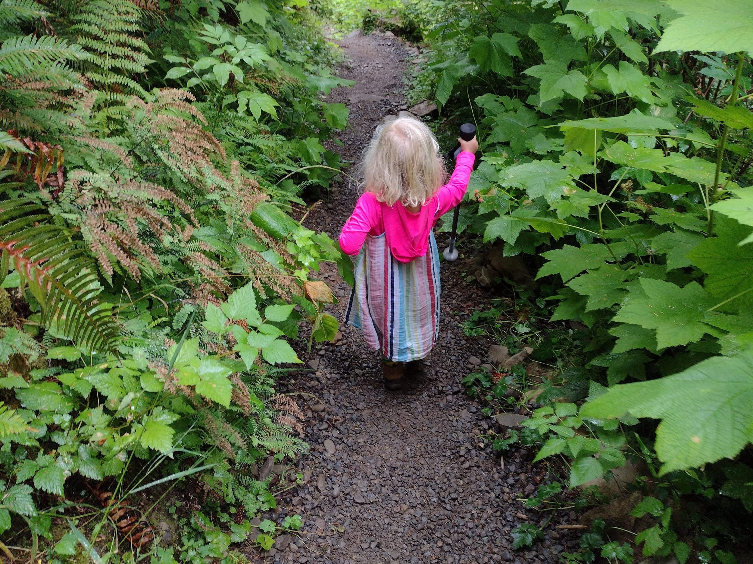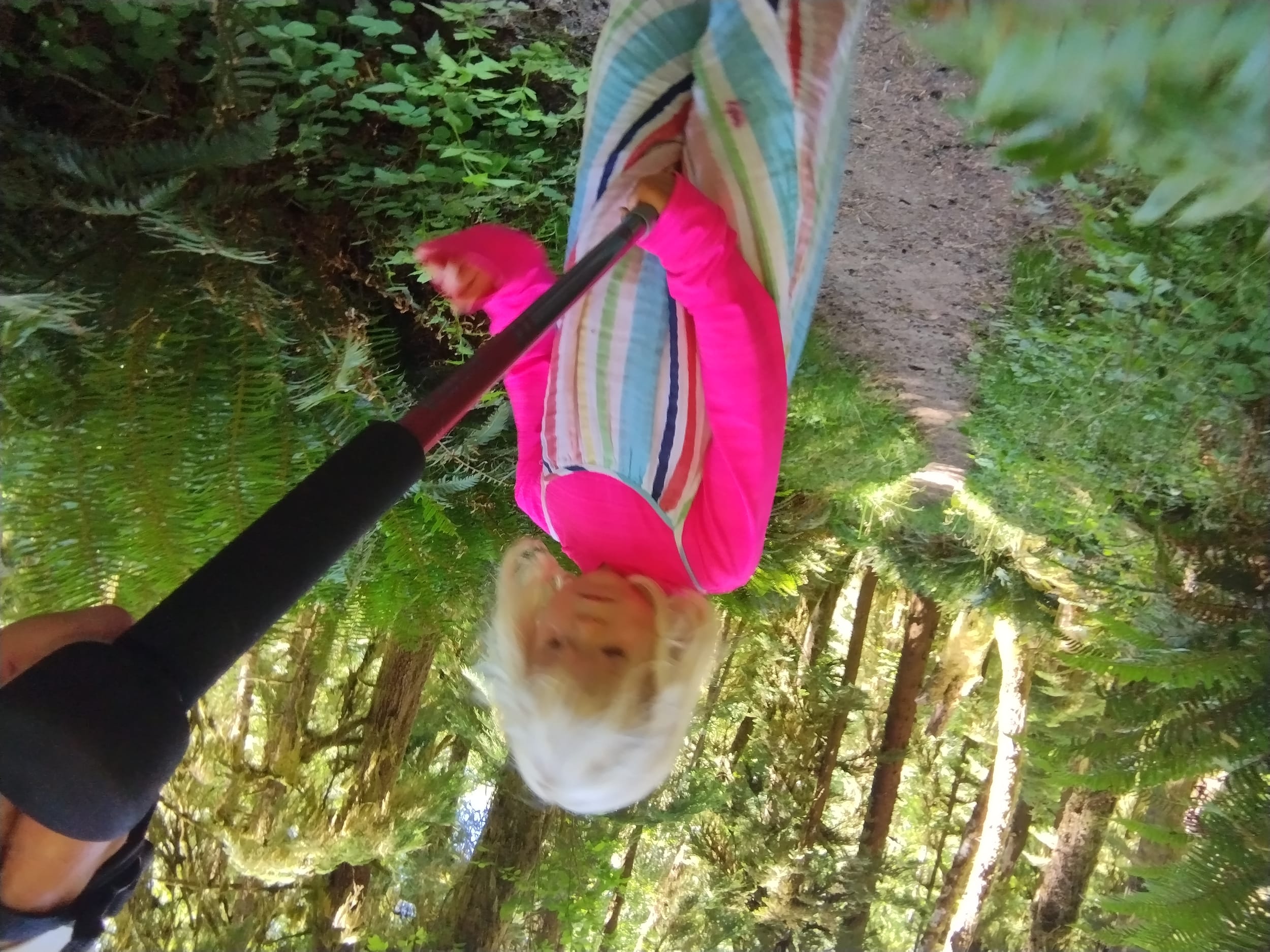 As we started to get near the end of the trail (last 1.5 miles or so), Sara started to find some creative ways to hike (and make things easier for herself). She wanted to ride the hiking pole while I pulled it. It couldn’t have been that comfortable, but she did it for over a mile…