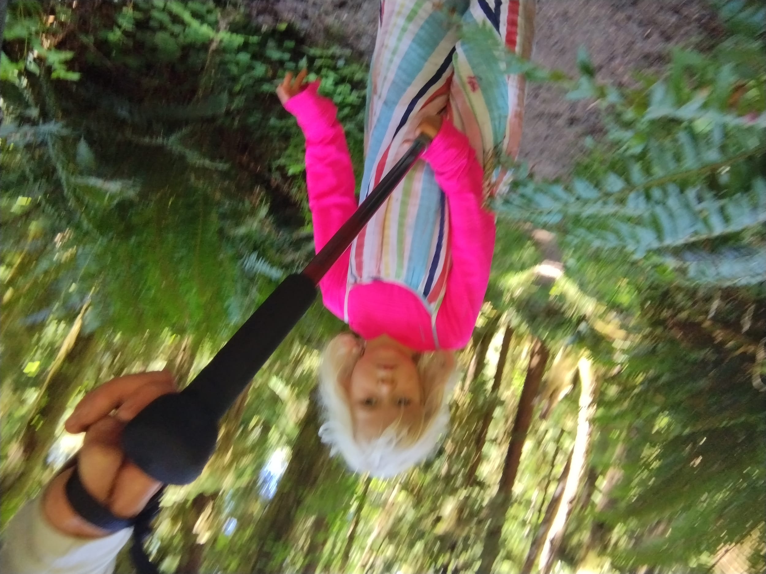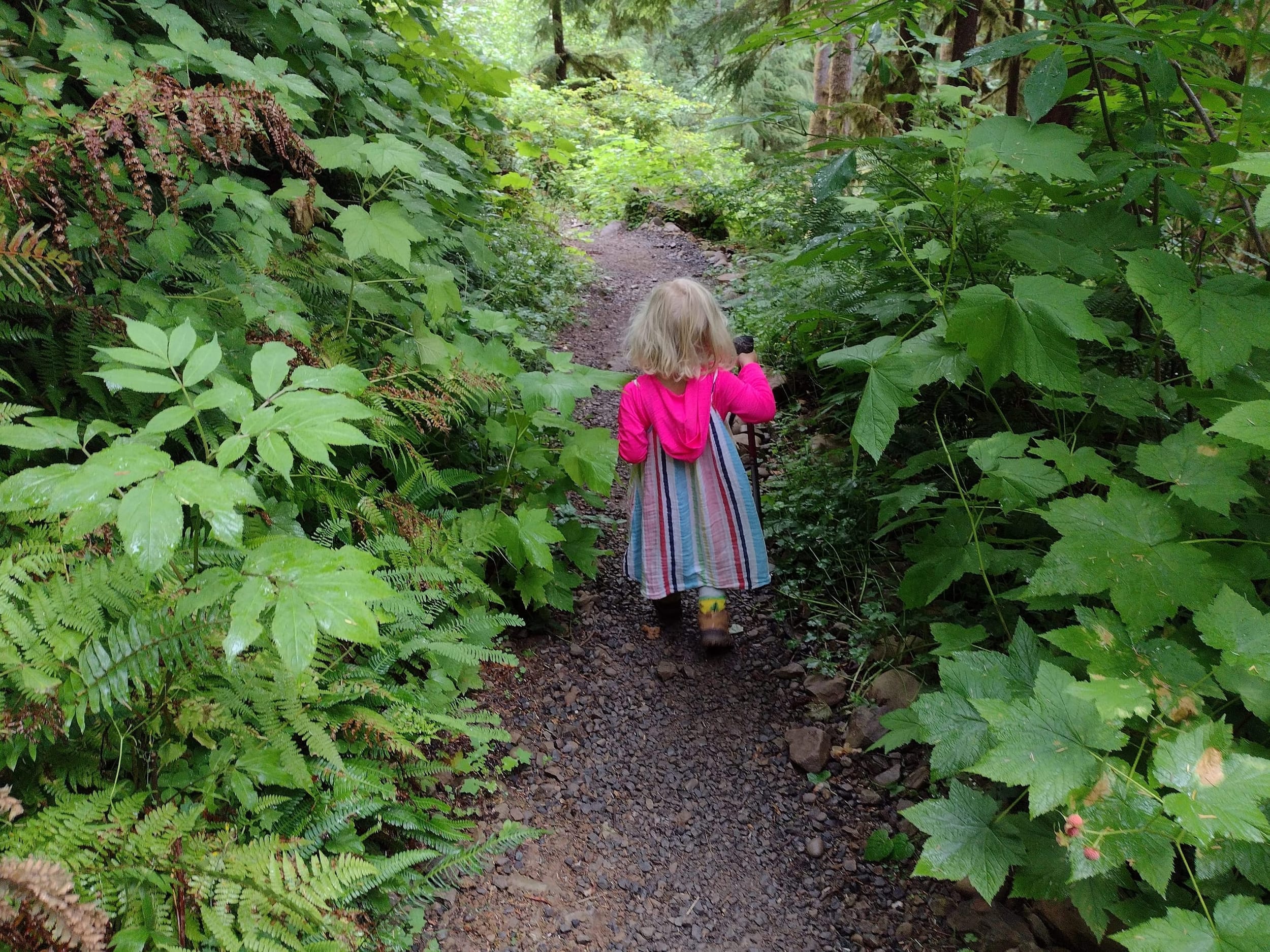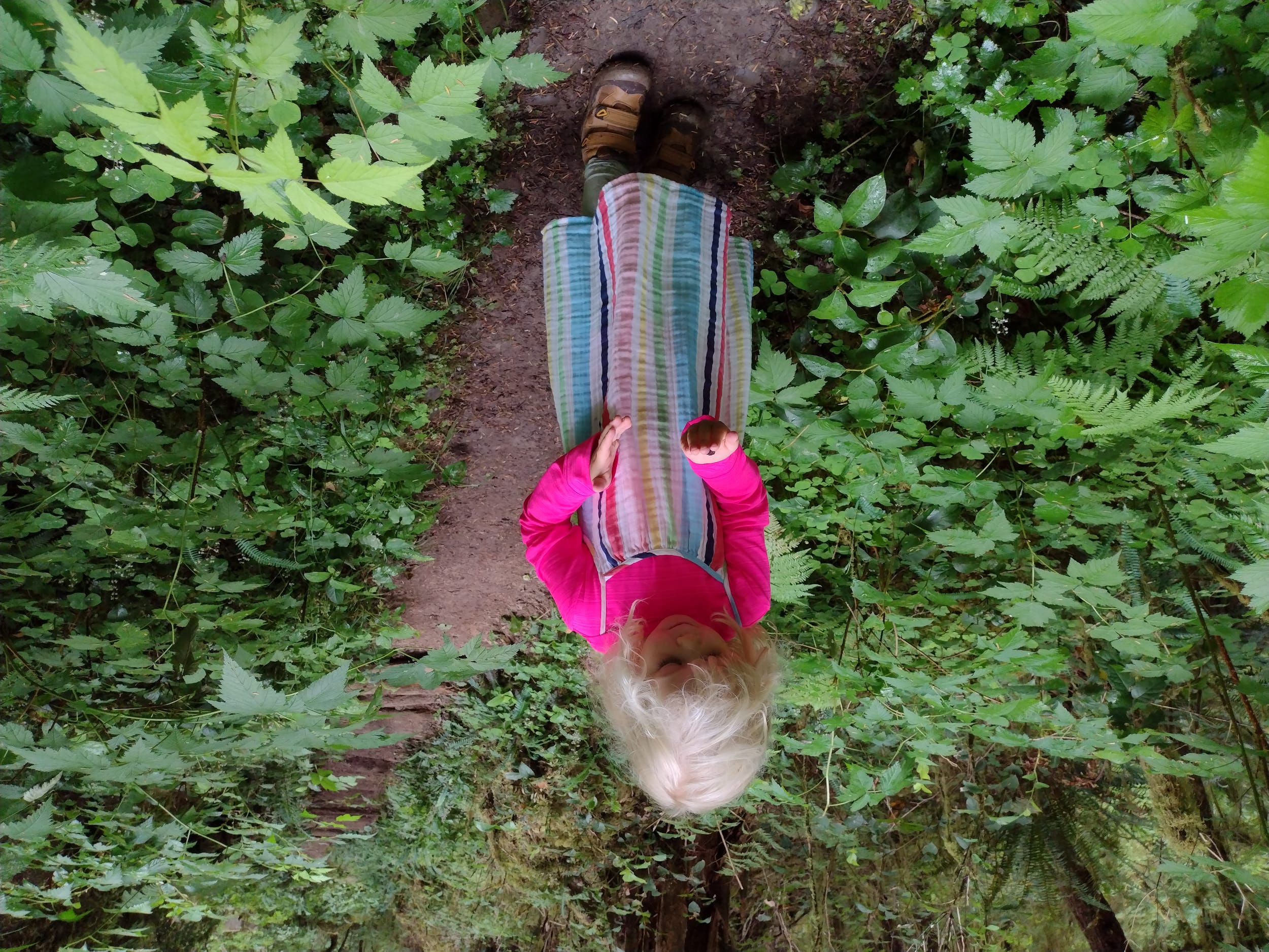 As we started to get near the end of the trail (last 1.5 miles or so), Sara started to find some creative ways to hike (and make things easier for herself). She wanted to ride the hiking pole while I pulled it. It couldn’t have been that comfortable, but she did it for over a mile…