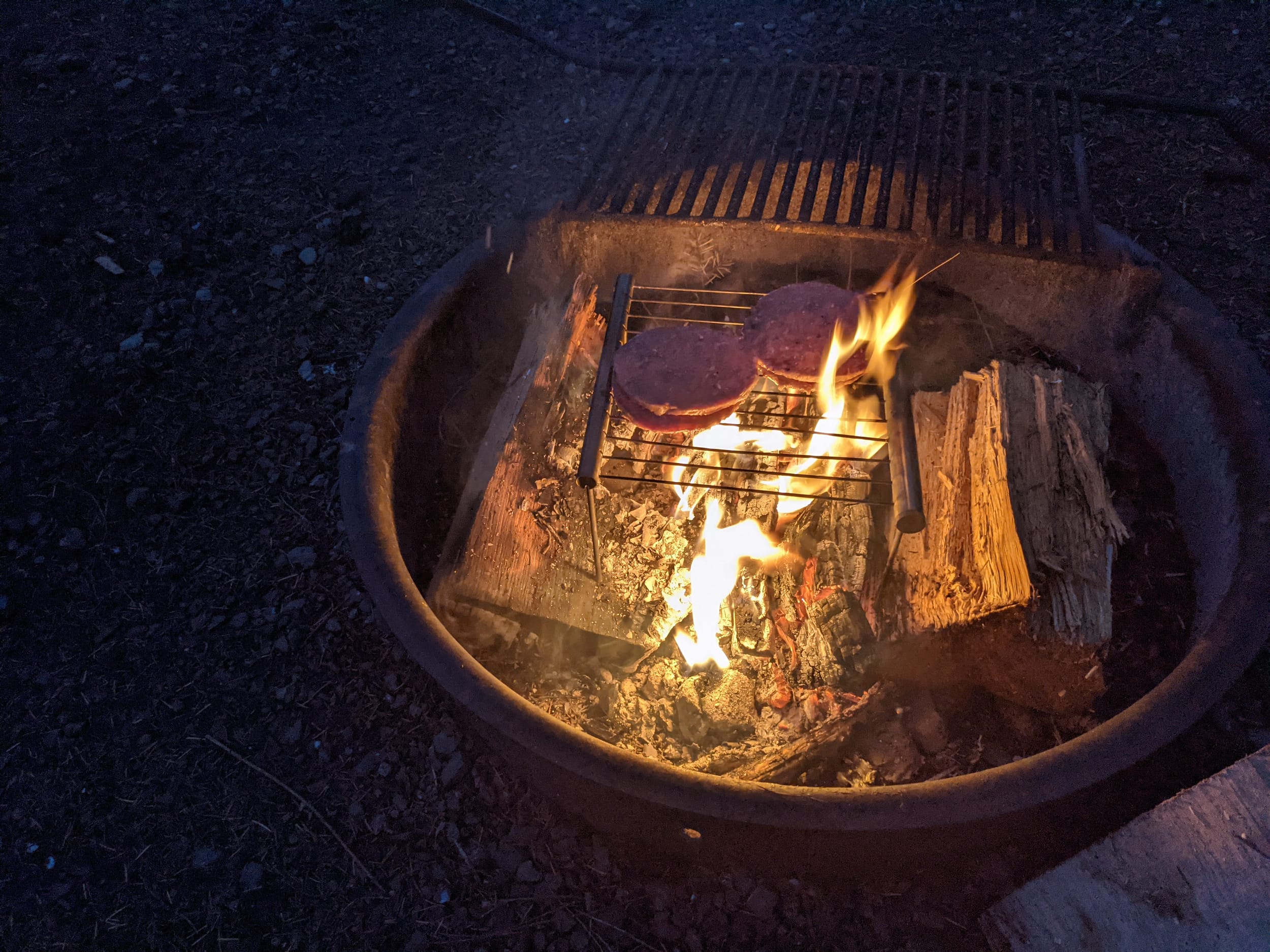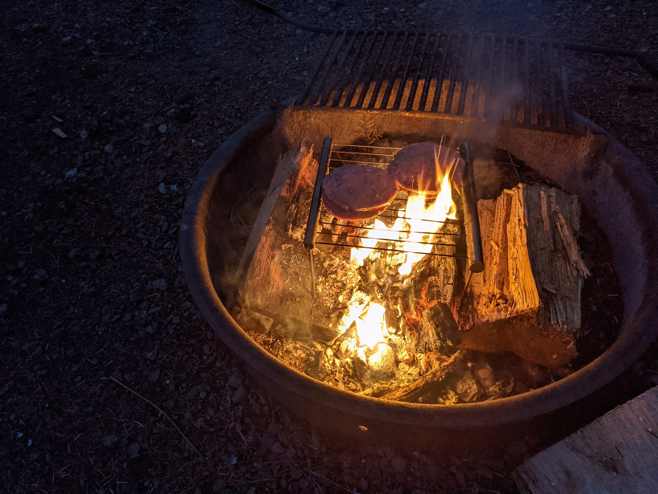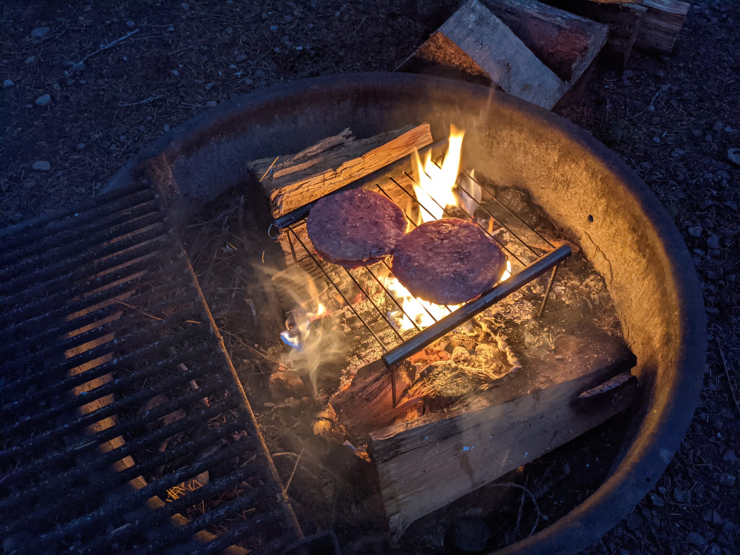 I was planning to do steaks or chicken on the fire ever since I found my grill a couple of weeks ago, but the “grocery” in Quilcene had very few options. They did have burgers and buns though, so we did that.