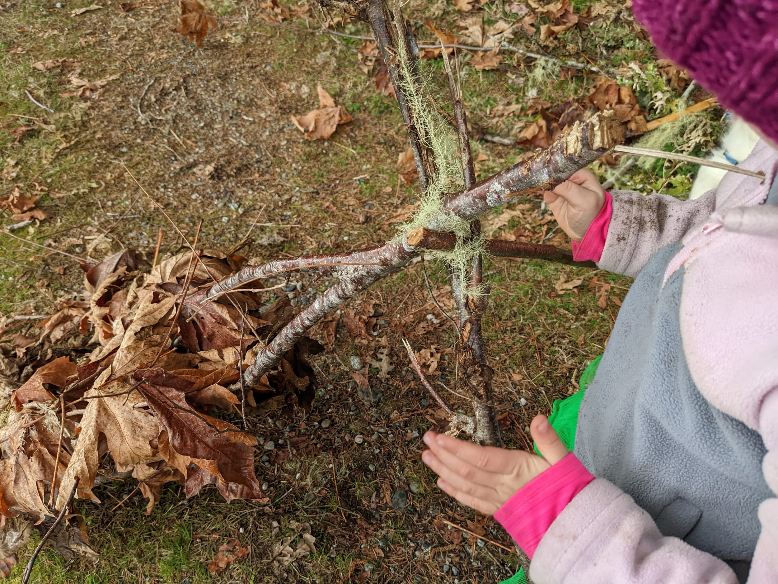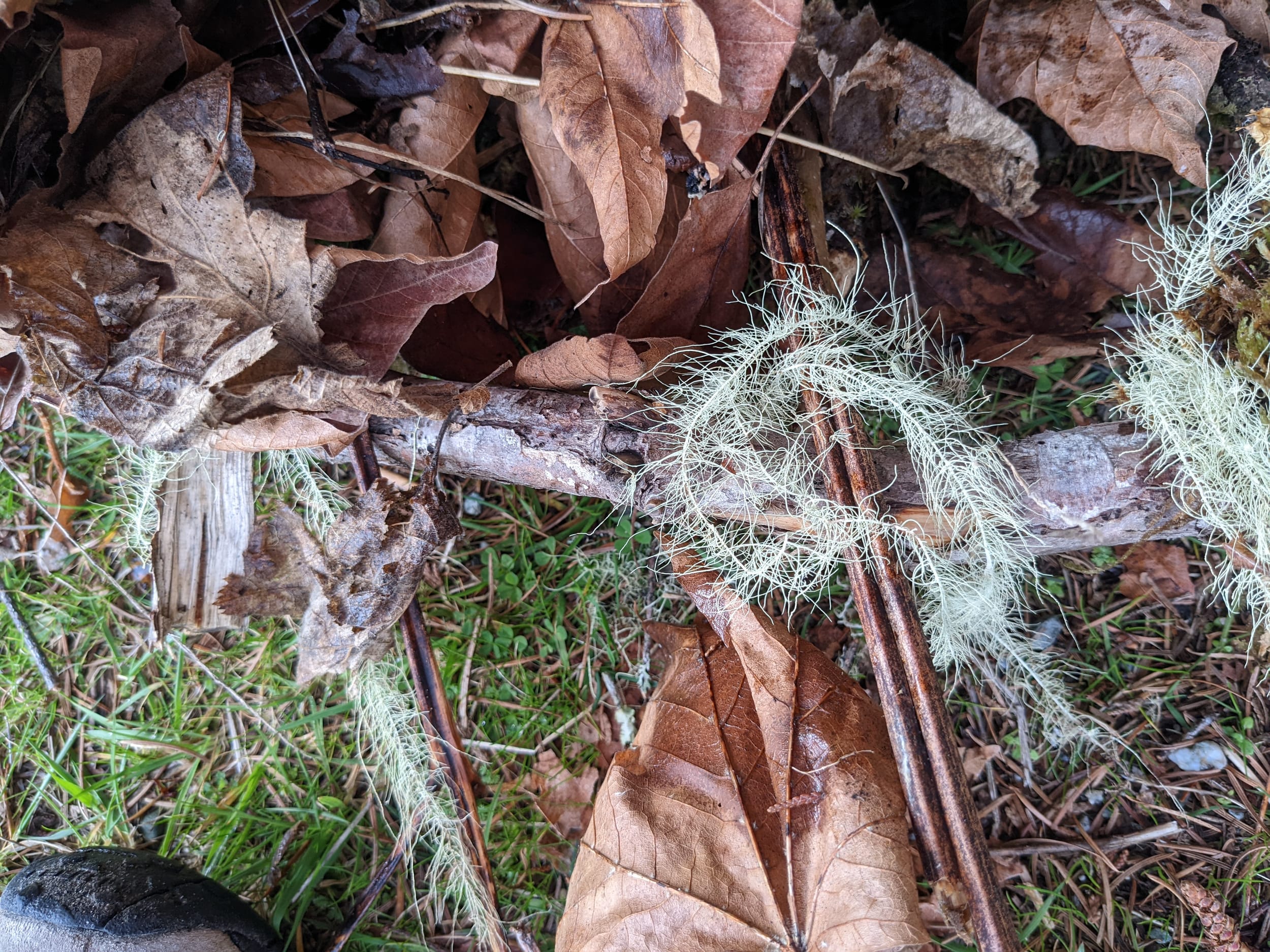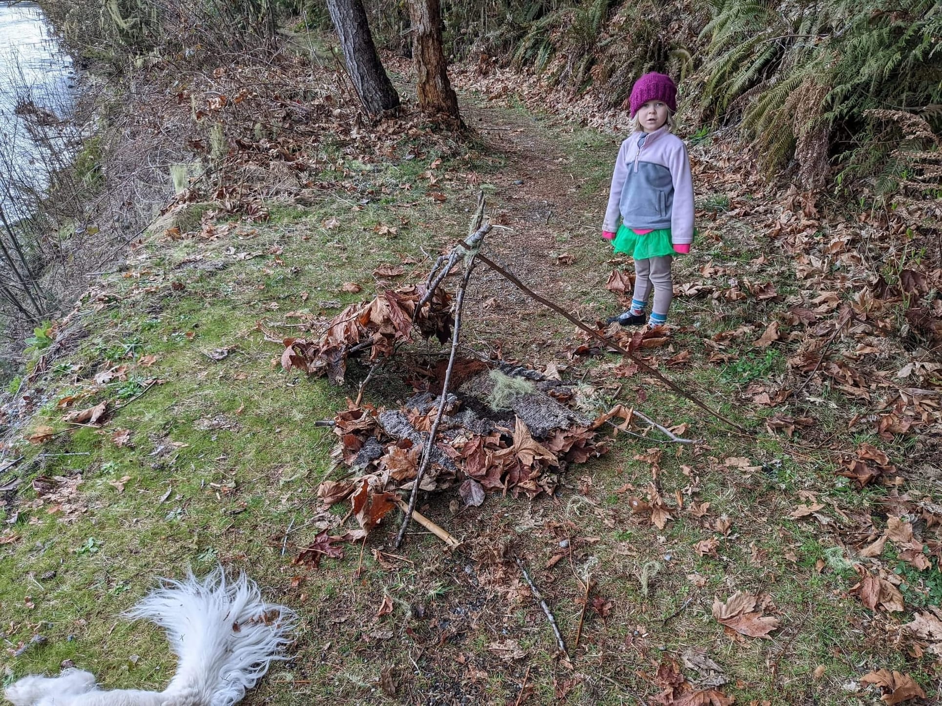 We stopped for a break at our turnaround point and Sara wanted to make a boat - which ended up becoming more of a tent than a boat per-say. It has sails, which ended up being a tripod and Sara did a great job of lashing the poles together with some moss she found. Pretty impressive hull as well, with large pieces of bark sandwhiched with leaves/moss for “waterproofing”.