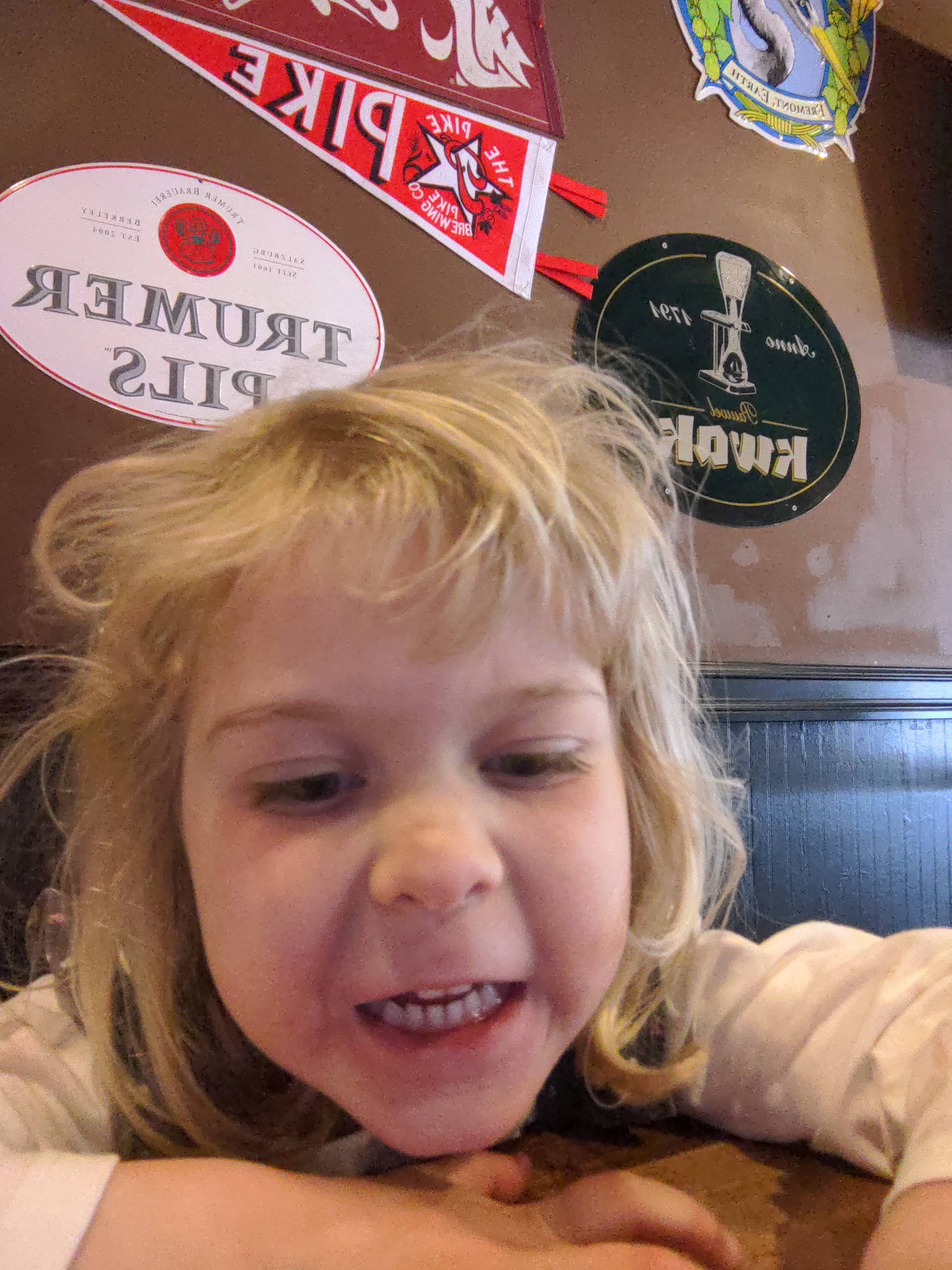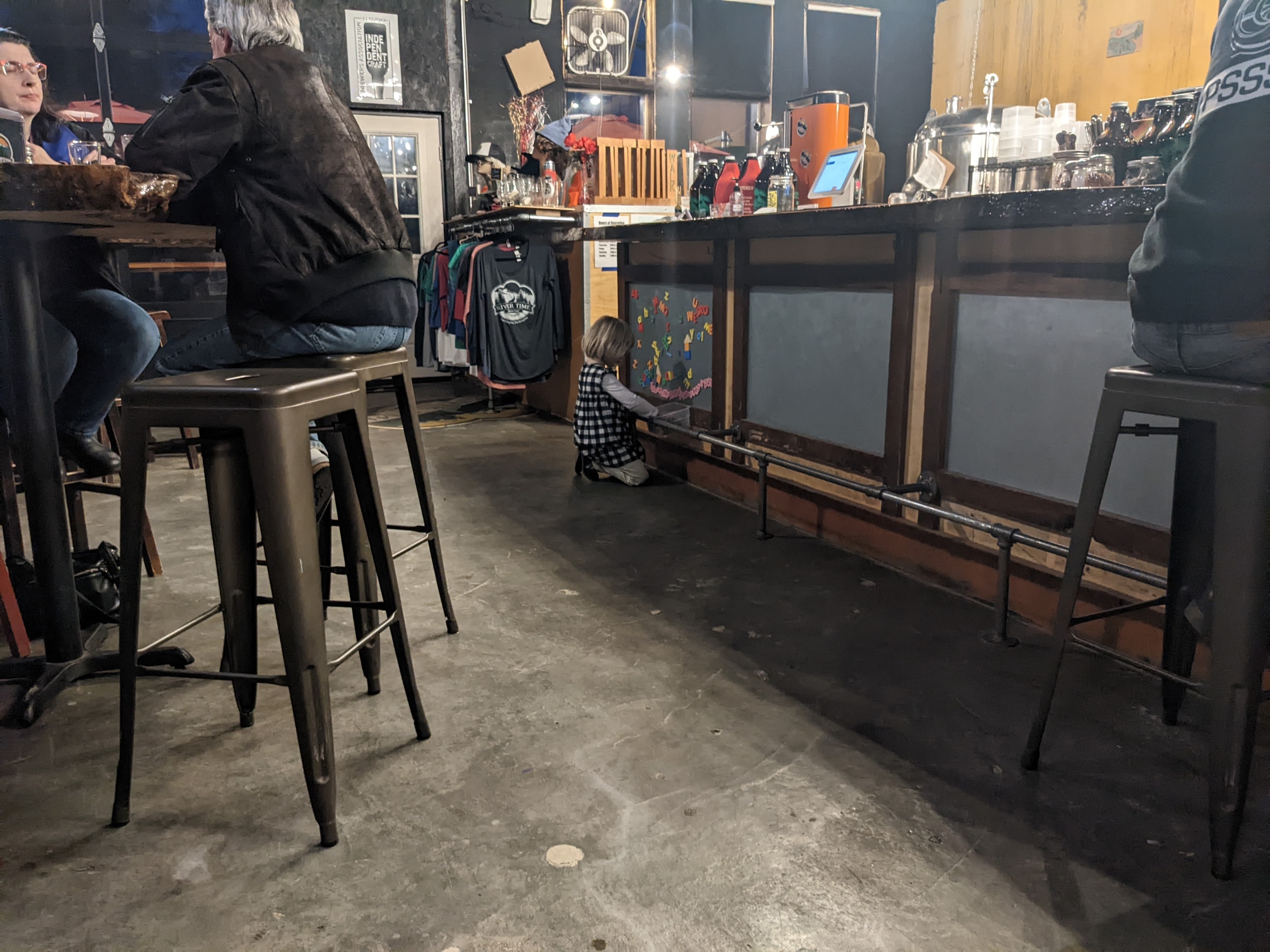 The first order of business was to drive up to the North Cascades. We left late on Friday so we stopped of in our standard rockport for dinner at the brewery there. This is a really fun place, and Sara played and played on the chaulkboards and markerboards they had on the walls.