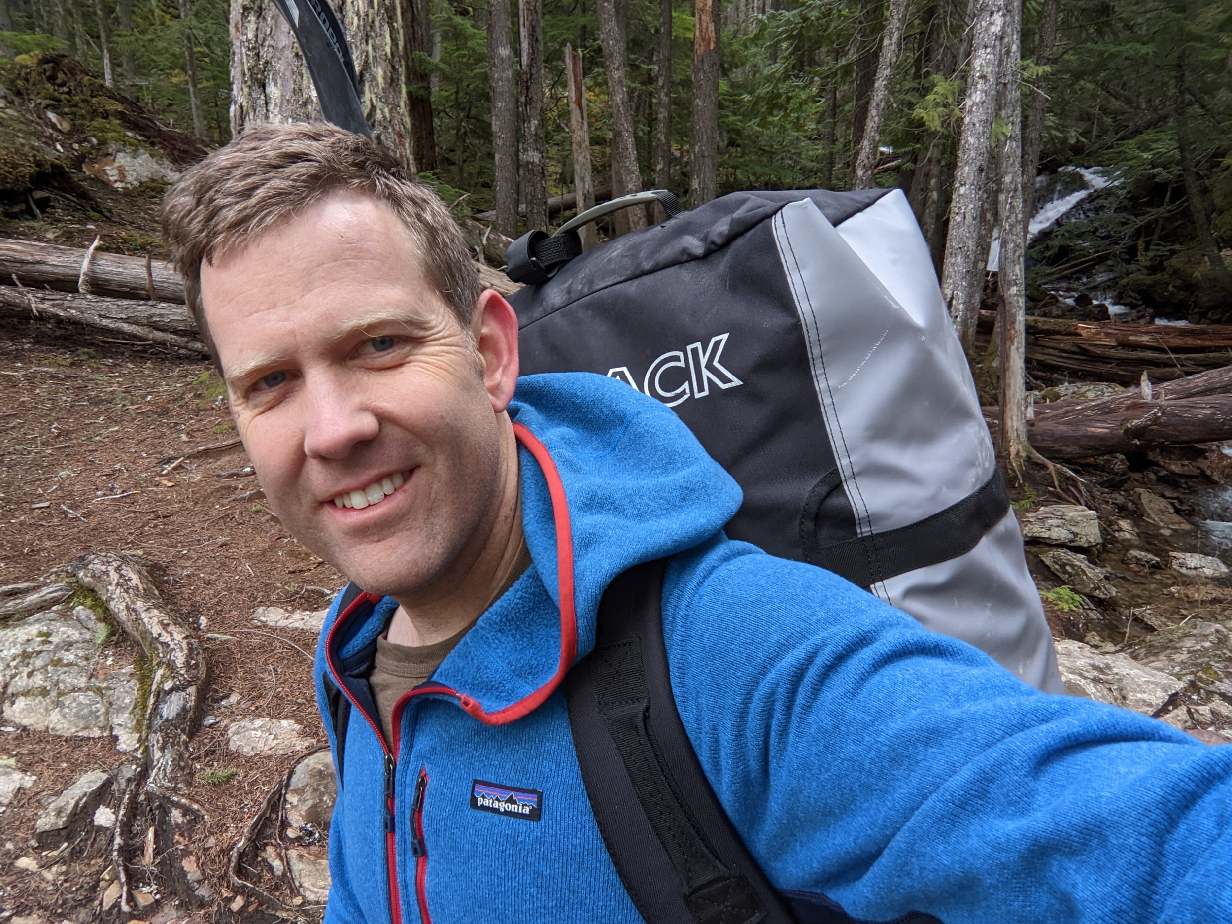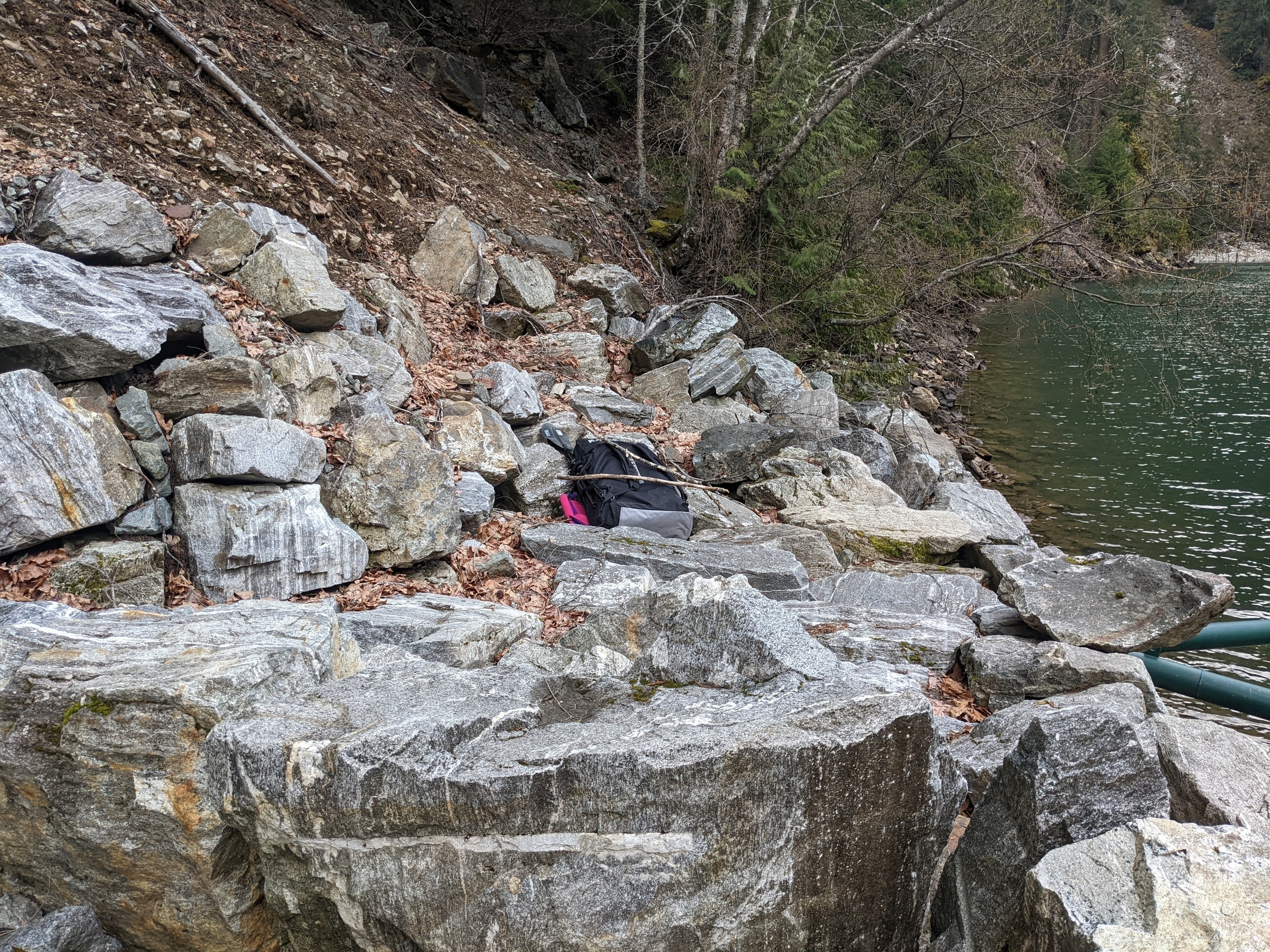 Then we were off - the short morning hike was just down to the lake and back to drop off the kayaks. Despite the short distance, hiking with that massive kayak on my back was no joke!