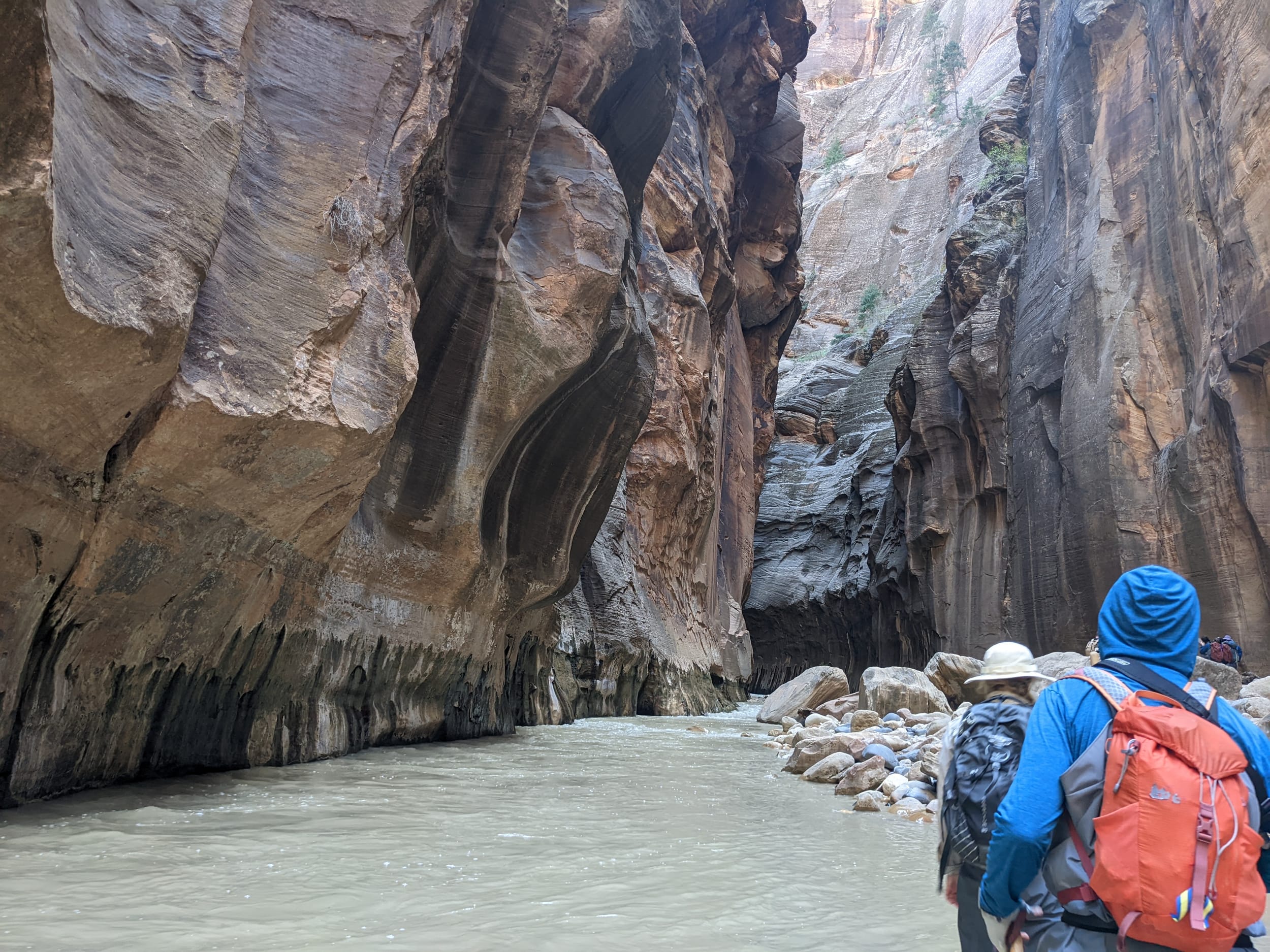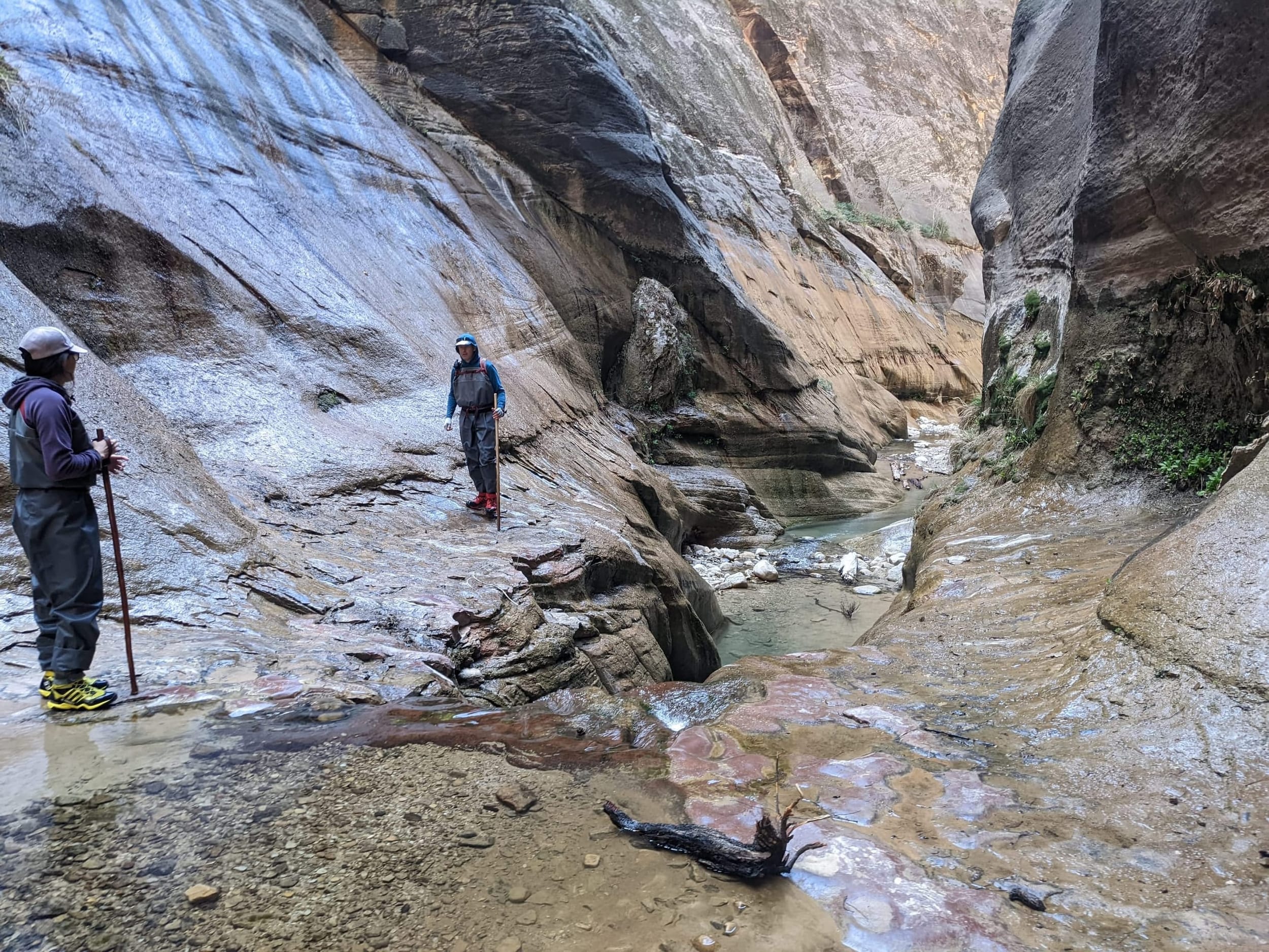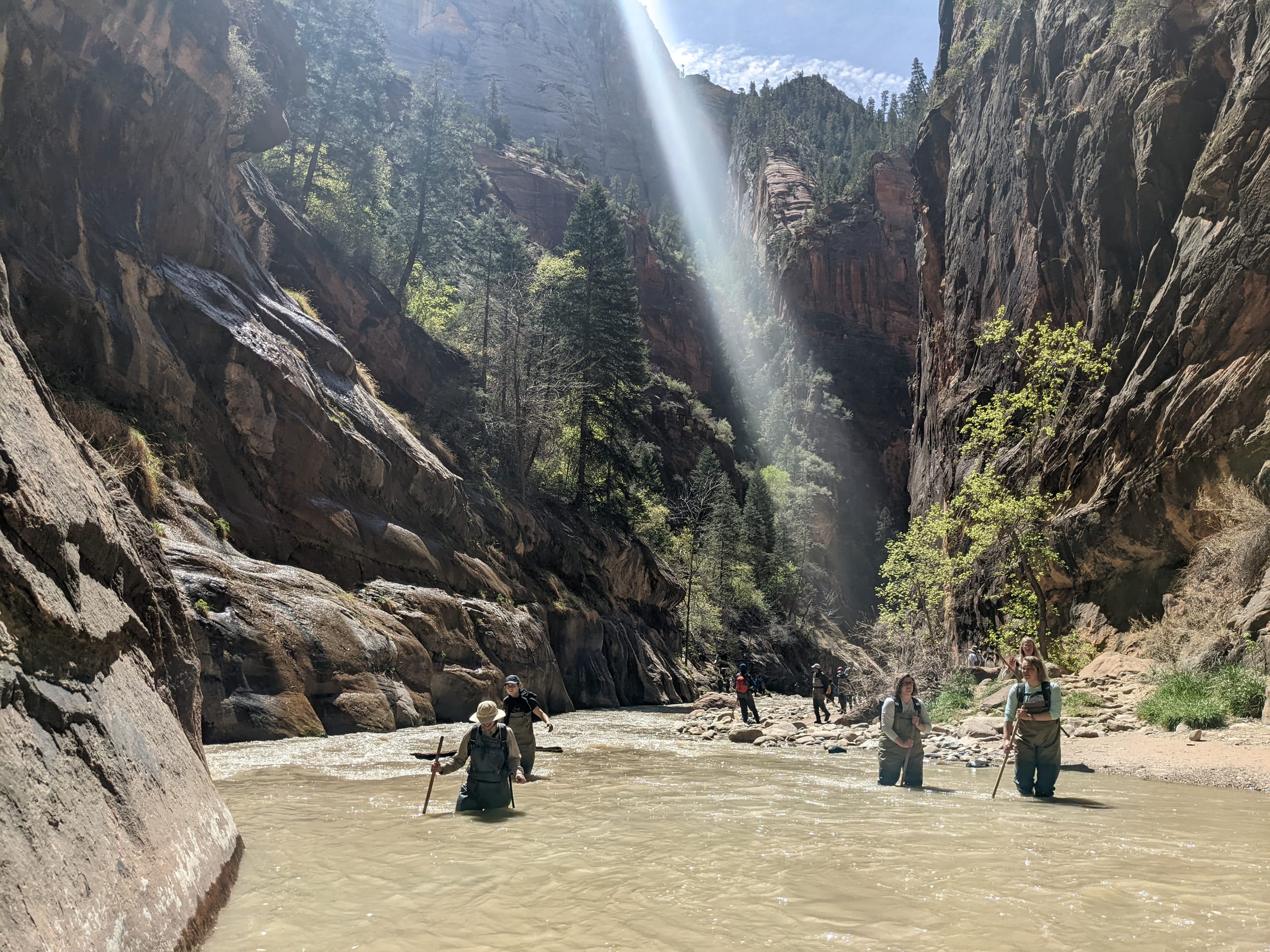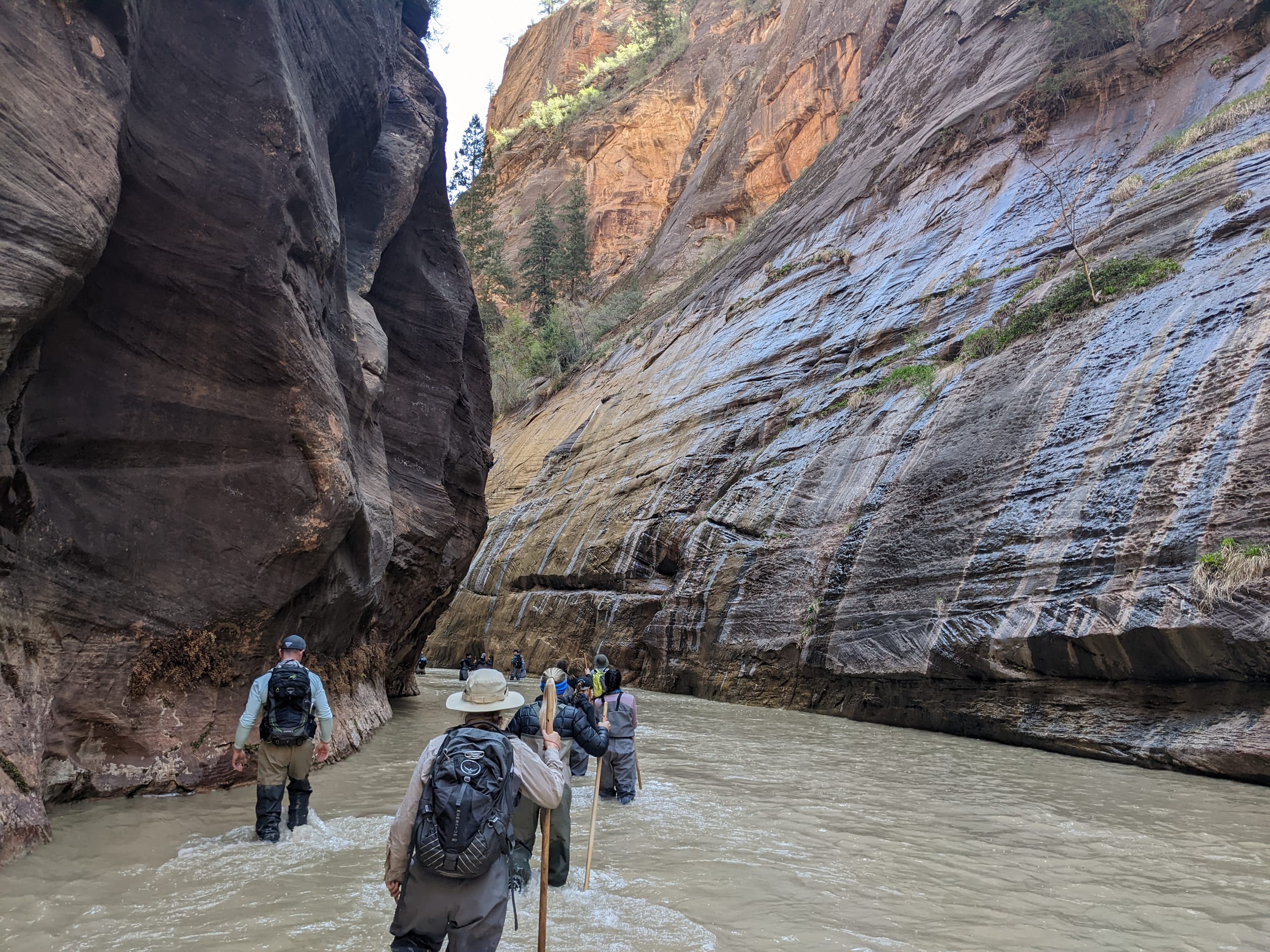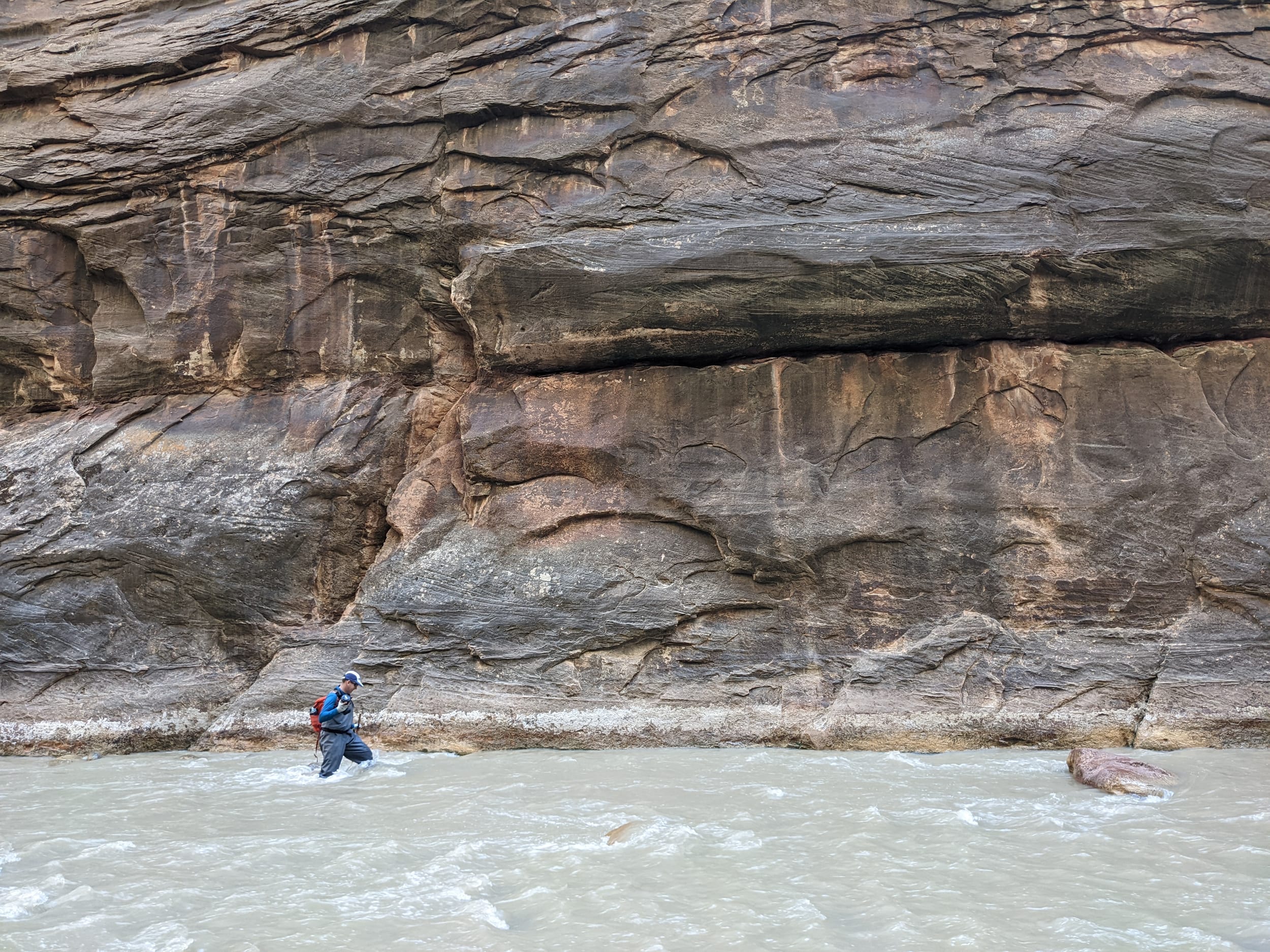 About 4(ish) miles miles in, we took a side canyon that we later discovered was called Orderville canyon. The canyon was much narrower and very impressive to walk through given the very steep sidewalls. We though it would be a quick sidetrip, but we kept going for at least 2 miles before getting stuck under a set of cascading waterfalls where the water was too deep to proceed with just waders. We later found out that this canyon travels for another 20+ miles before it rises back to the surface & exits. The narrows itself is 22 miles… long ways to go in a canyon like this.