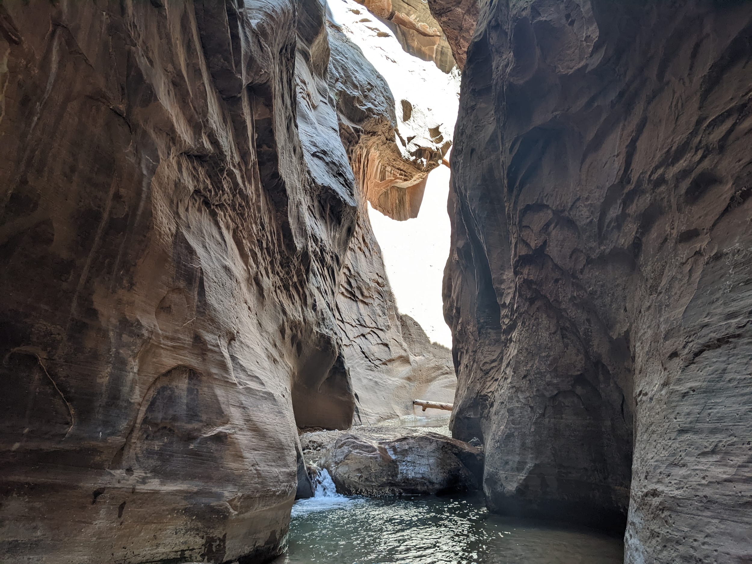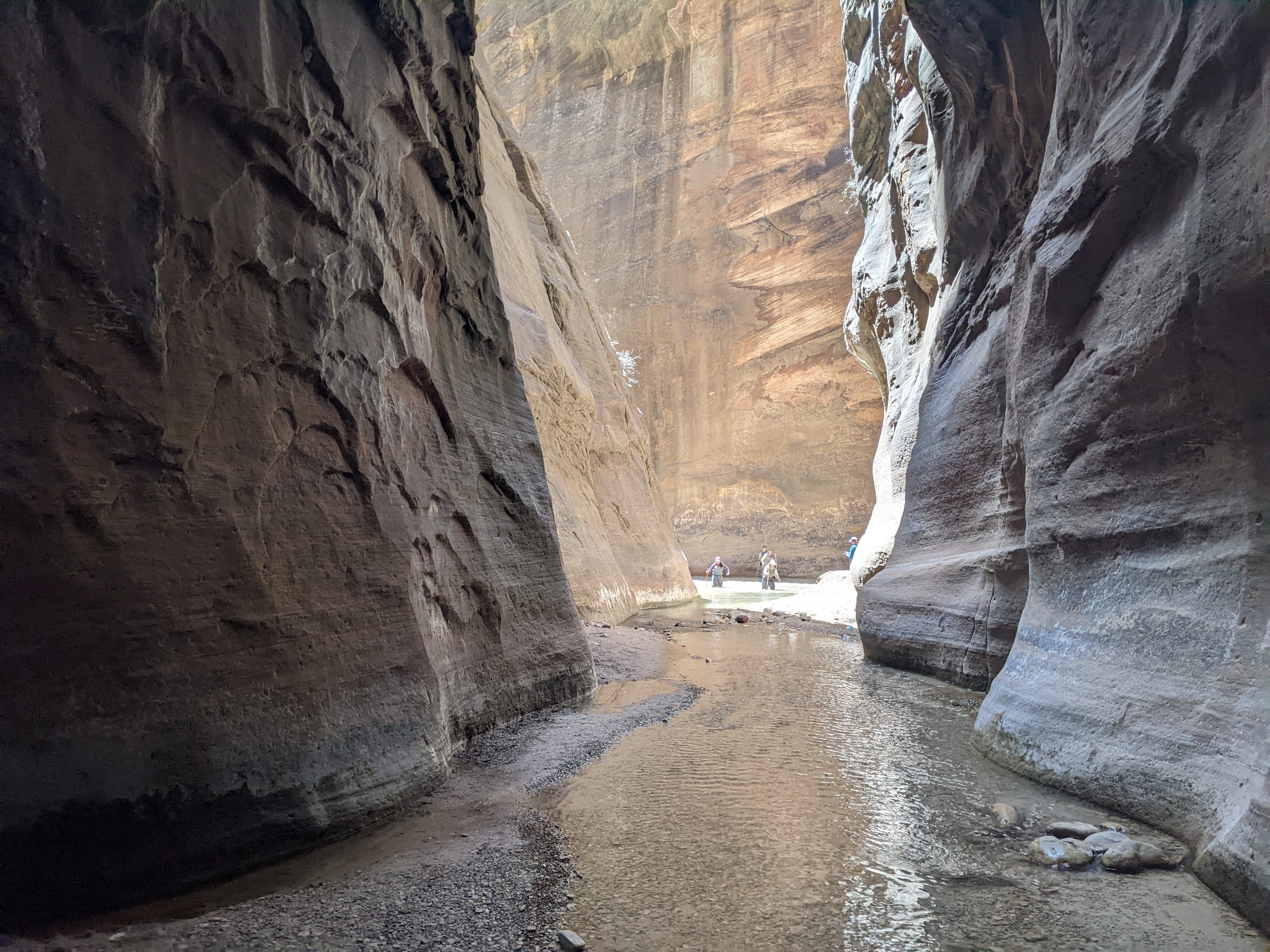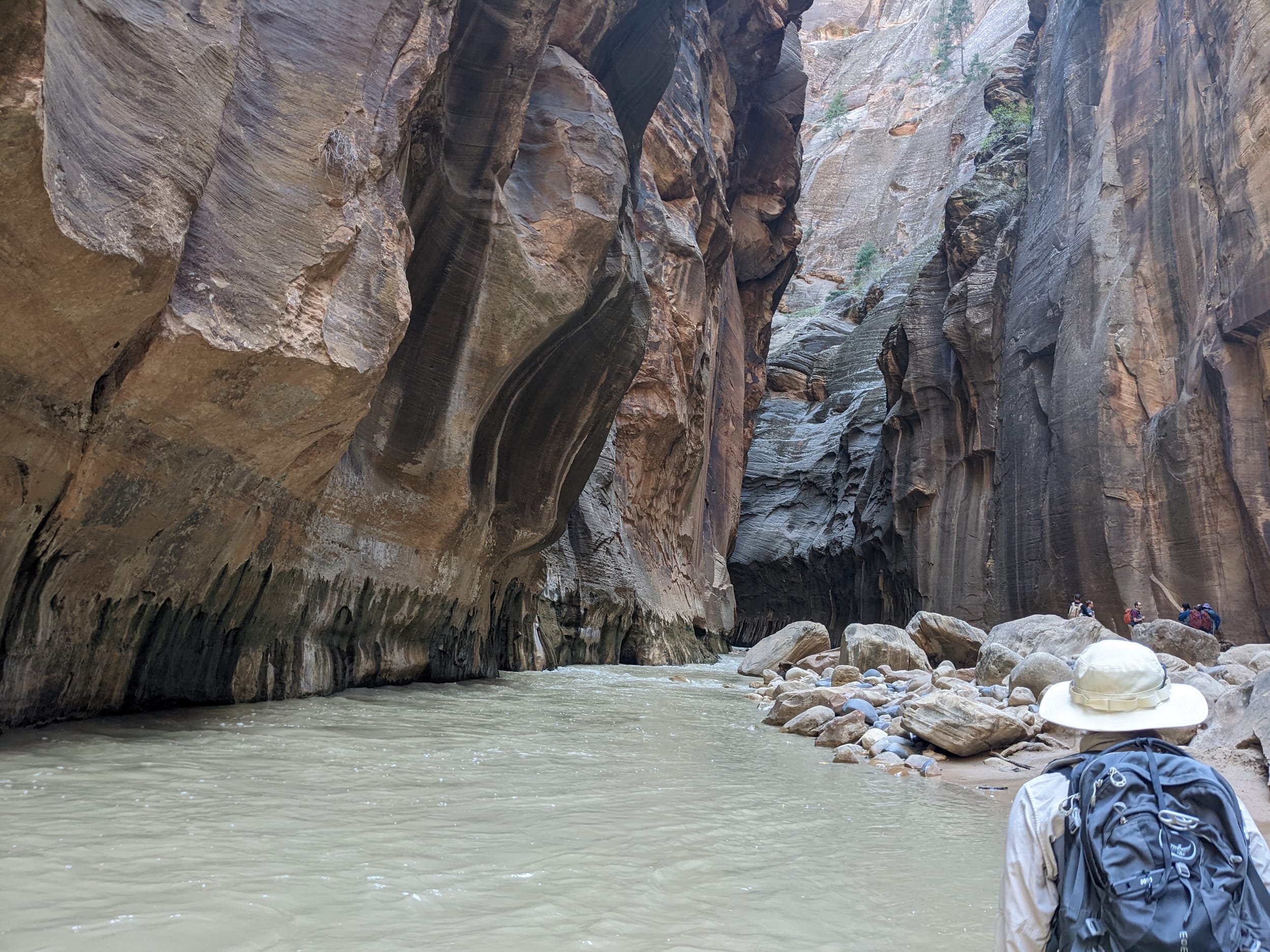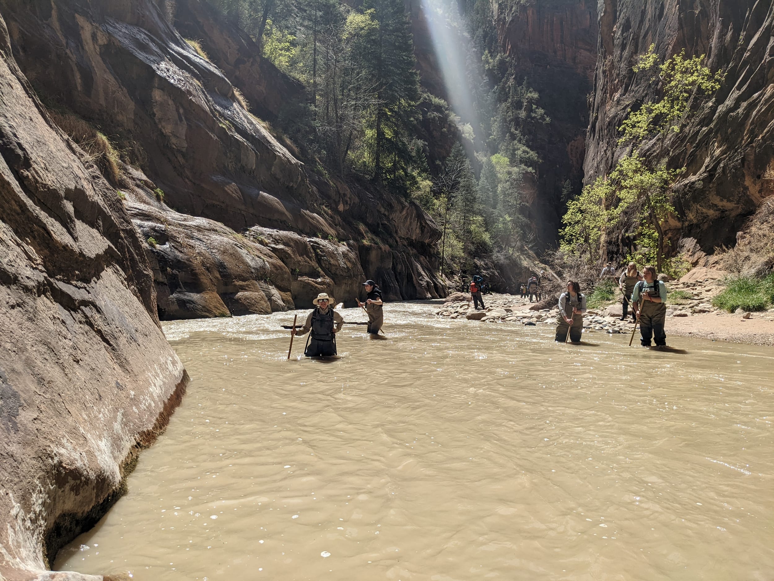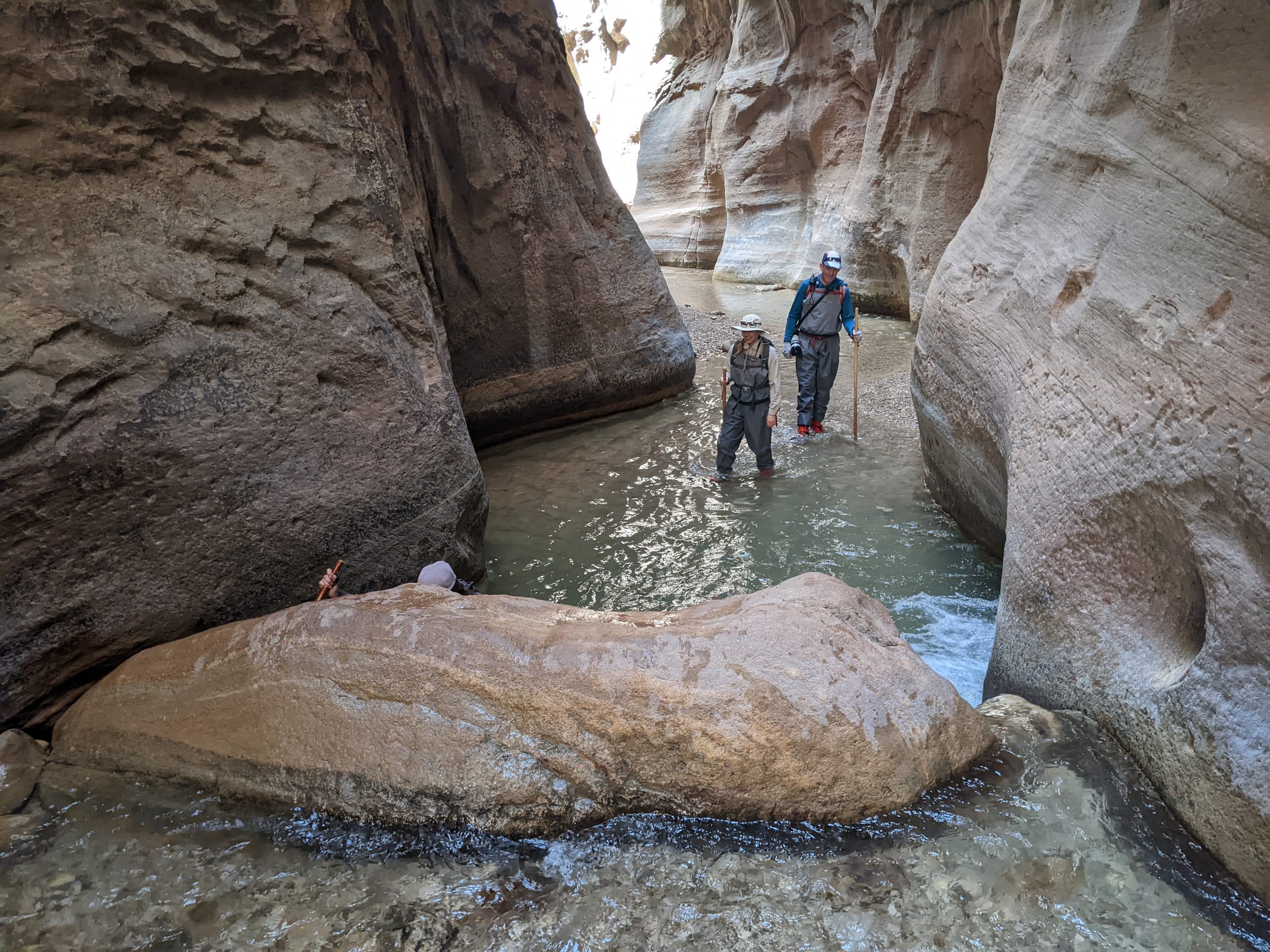 About 4(ish) miles miles in, we took a side canyon that we later discovered was called Orderville canyon. The canyon was much narrower and very impressive to walk through given the very steep sidewalls. We though it would be a quick sidetrip, but we kept going for at least 2 miles before getting stuck under a set of cascading waterfalls where the water was too deep to proceed with just waders. We later found out that this canyon travels for another 20+ miles before it rises back to the surface & exits. The narrows itself is 22 miles… long ways to go in a canyon like this.