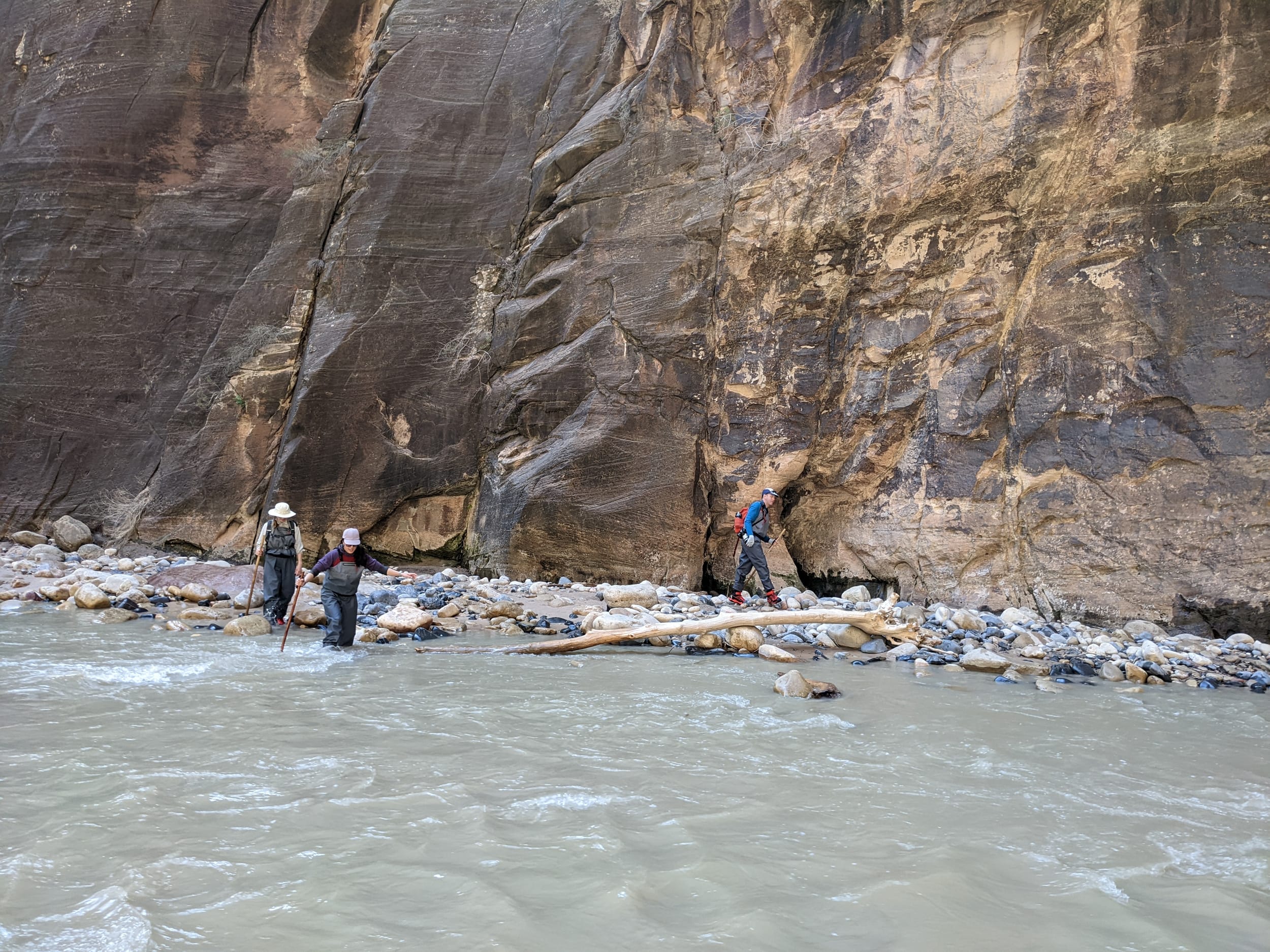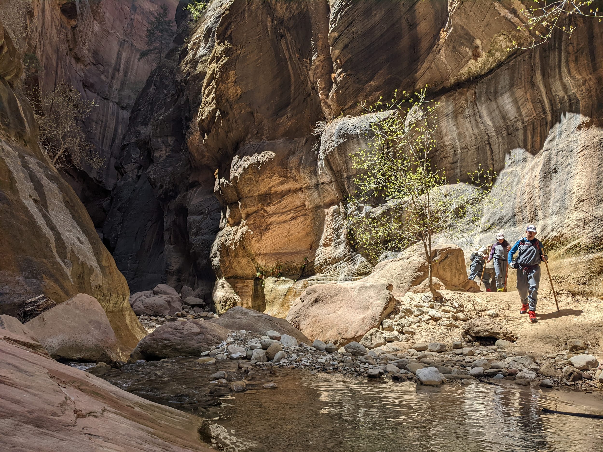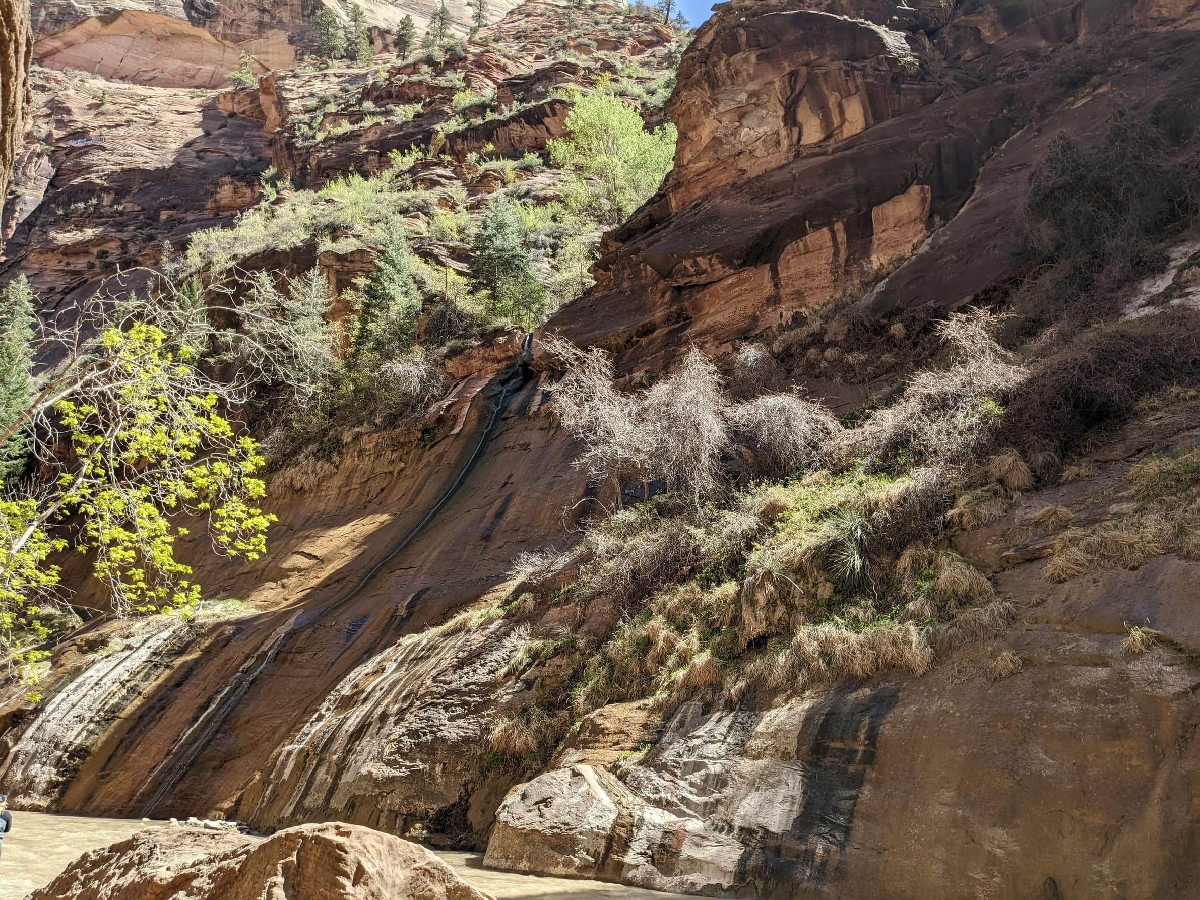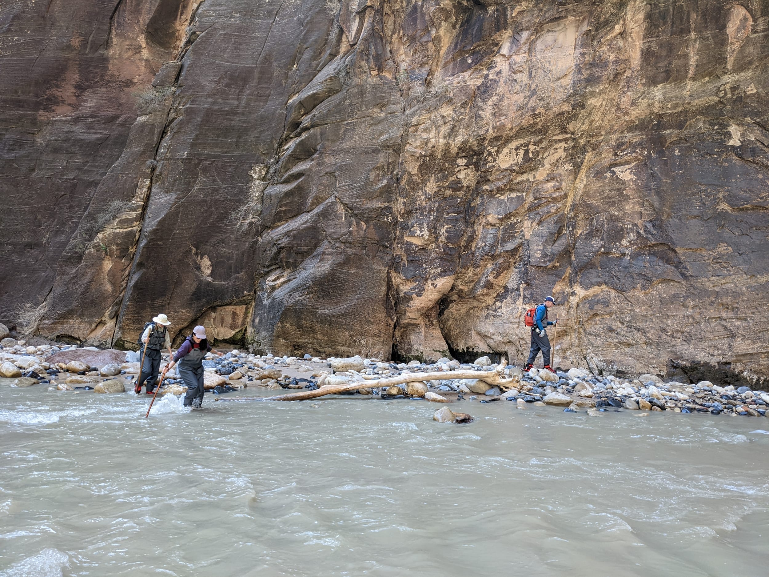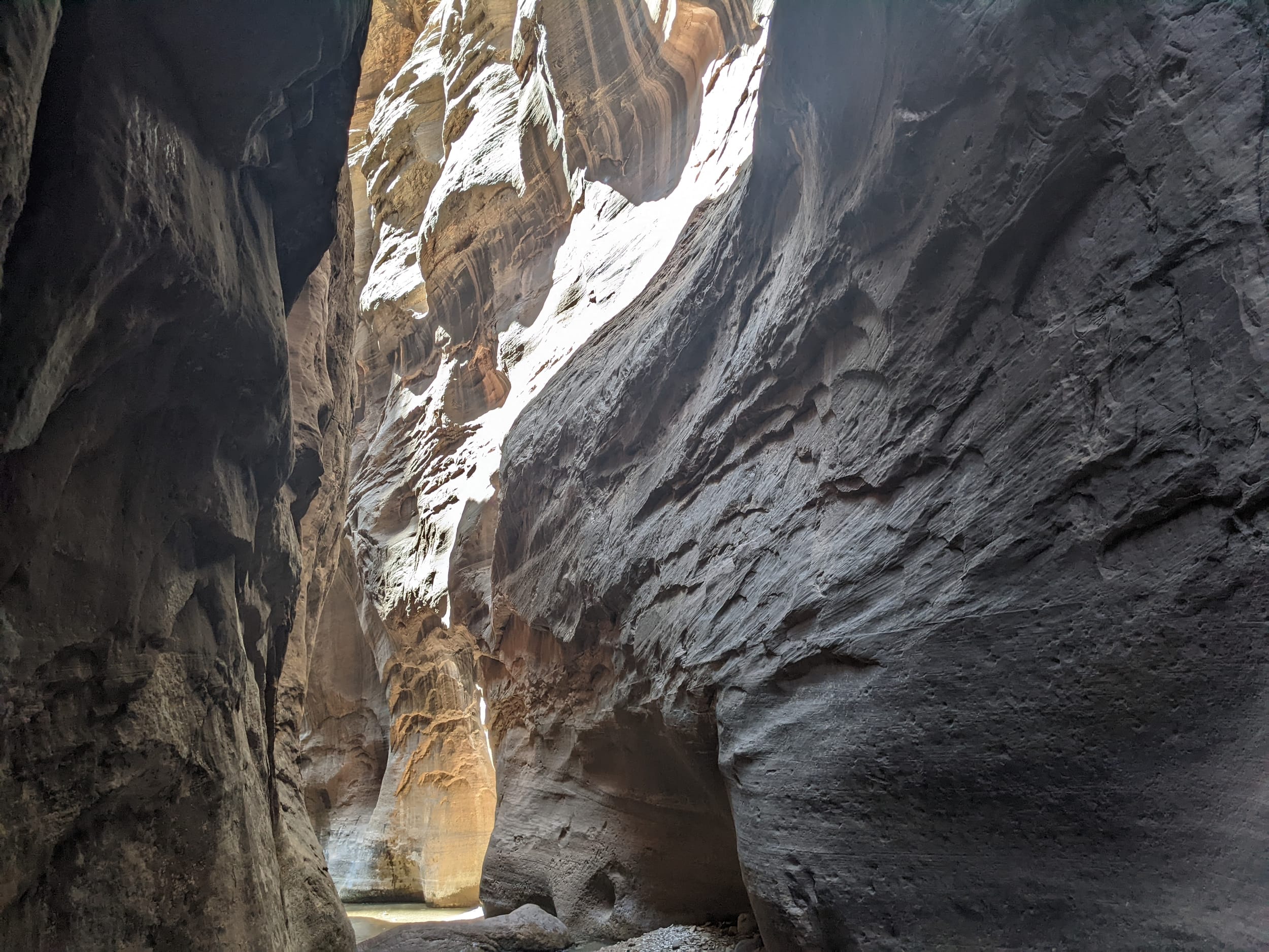 About 4(ish) miles miles in, we took a side canyon that we later discovered was called Orderville canyon. The canyon was much narrower and very impressive to walk through given the very steep sidewalls. We though it would be a quick sidetrip, but we kept going for at least 2 miles before getting stuck under a set of cascading waterfalls where the water was too deep to proceed with just waders. We later found out that this canyon travels for another 20+ miles before it rises back to the surface & exits. The narrows itself is 22 miles… long ways to go in a canyon like this.
