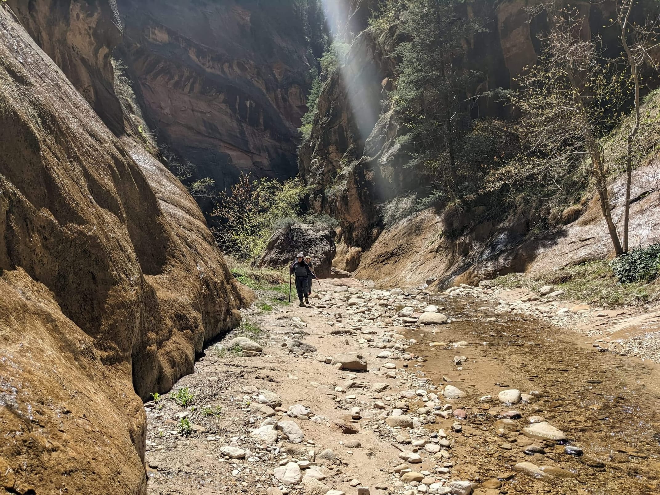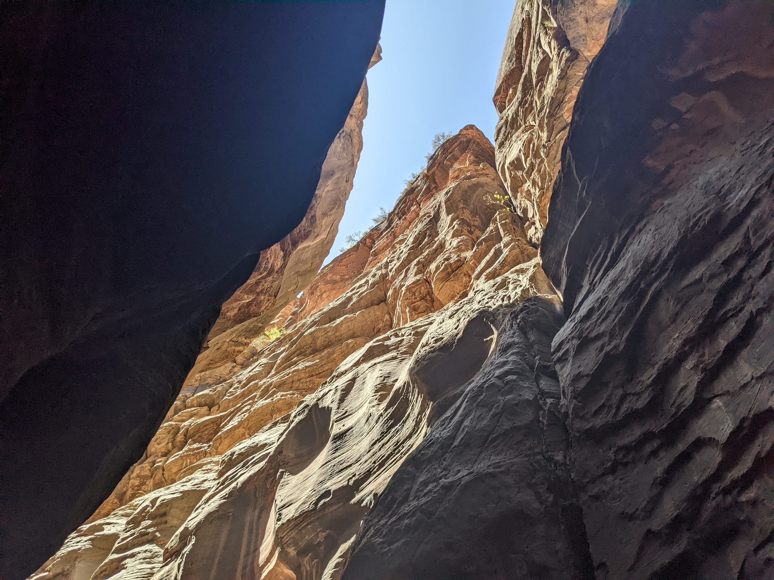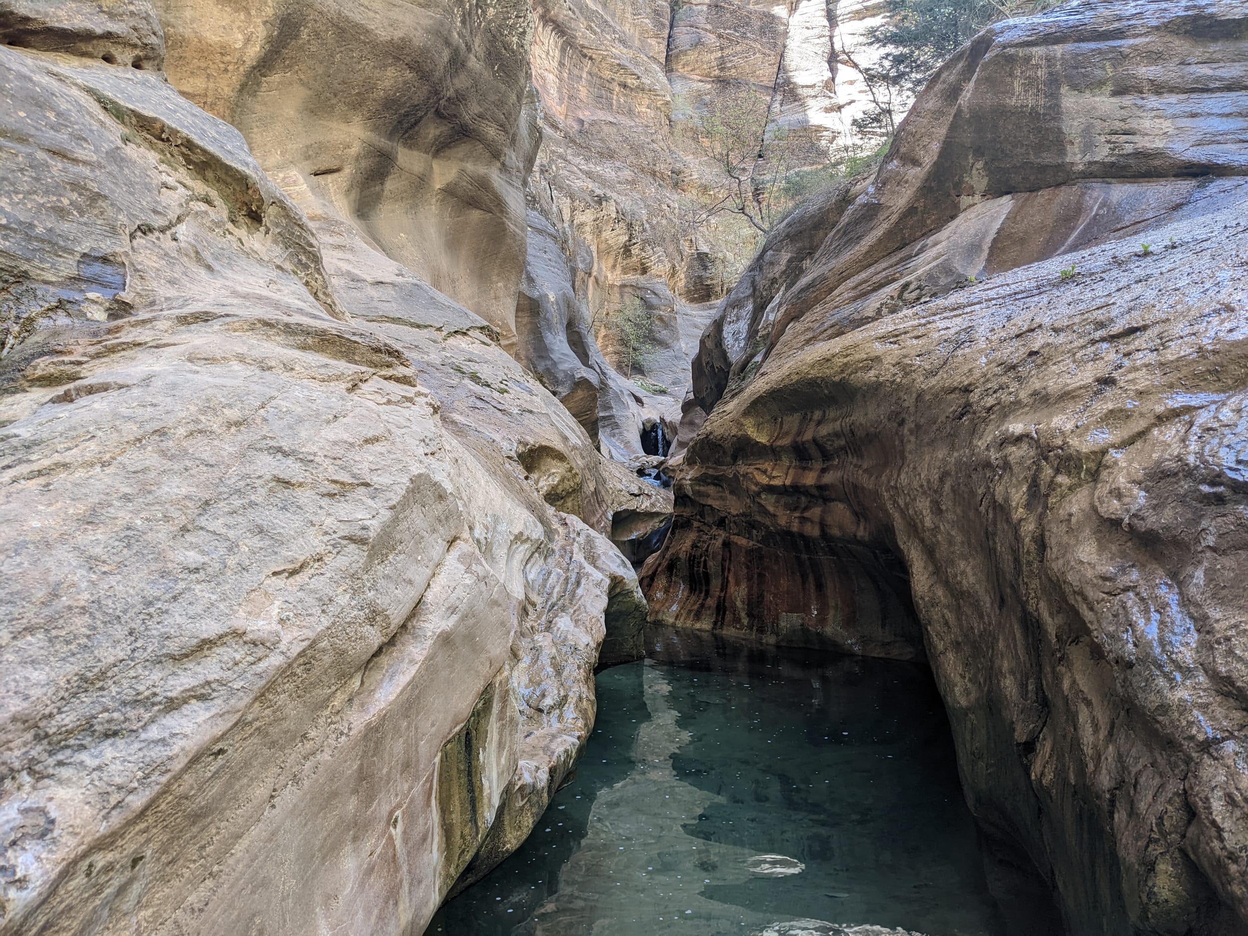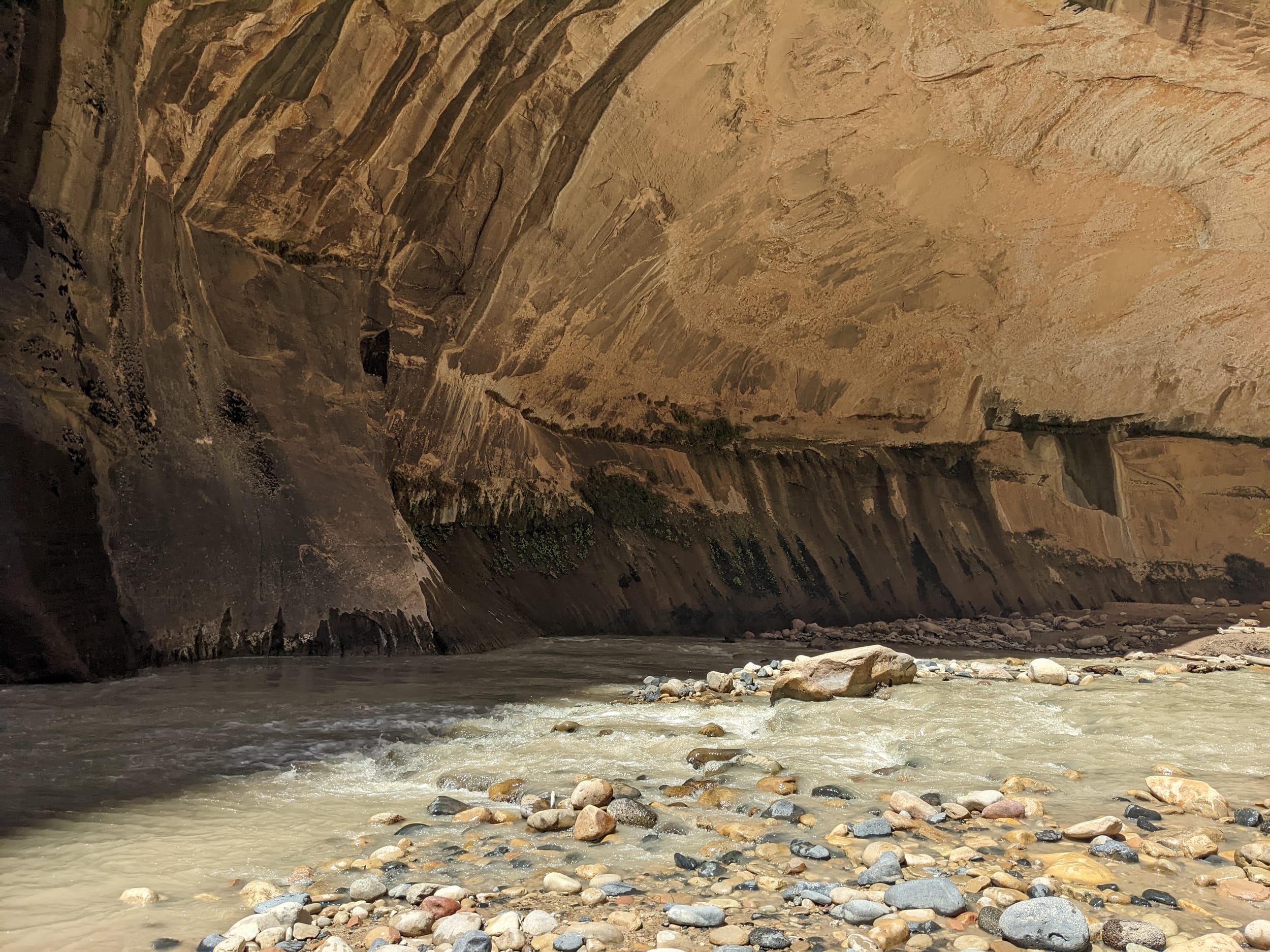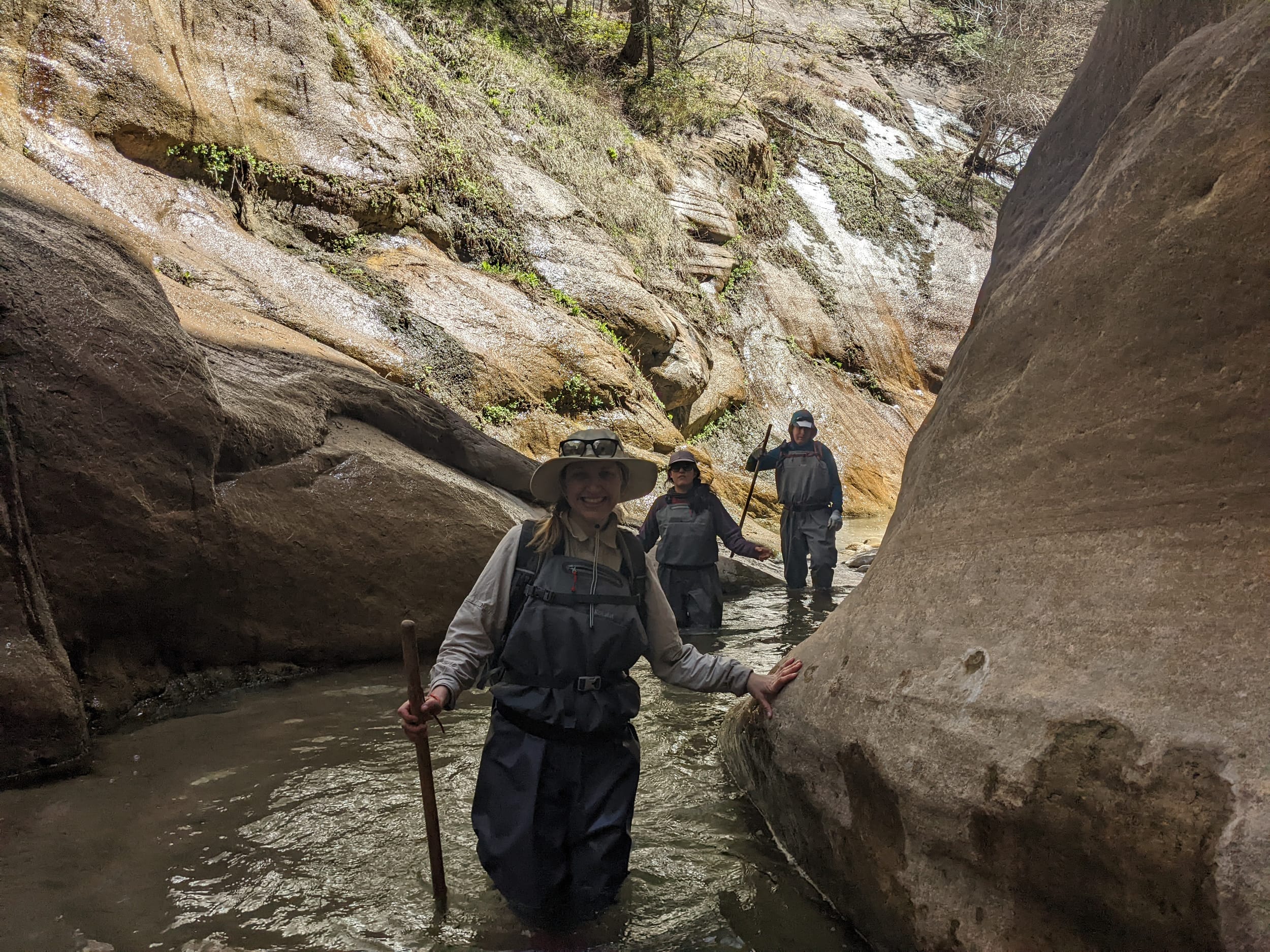 About 4(ish) miles miles in, we took a side canyon that we later discovered was called Orderville canyon. The canyon was much narrower and very impressive to walk through given the very steep sidewalls. We though it would be a quick sidetrip, but we kept going for at least 2 miles before getting stuck under a set of cascading waterfalls where the water was too deep to proceed with just waders. We later found out that this canyon travels for another 20+ miles before it rises back to the surface & exits. The narrows itself is 22 miles… long ways to go in a canyon like this.