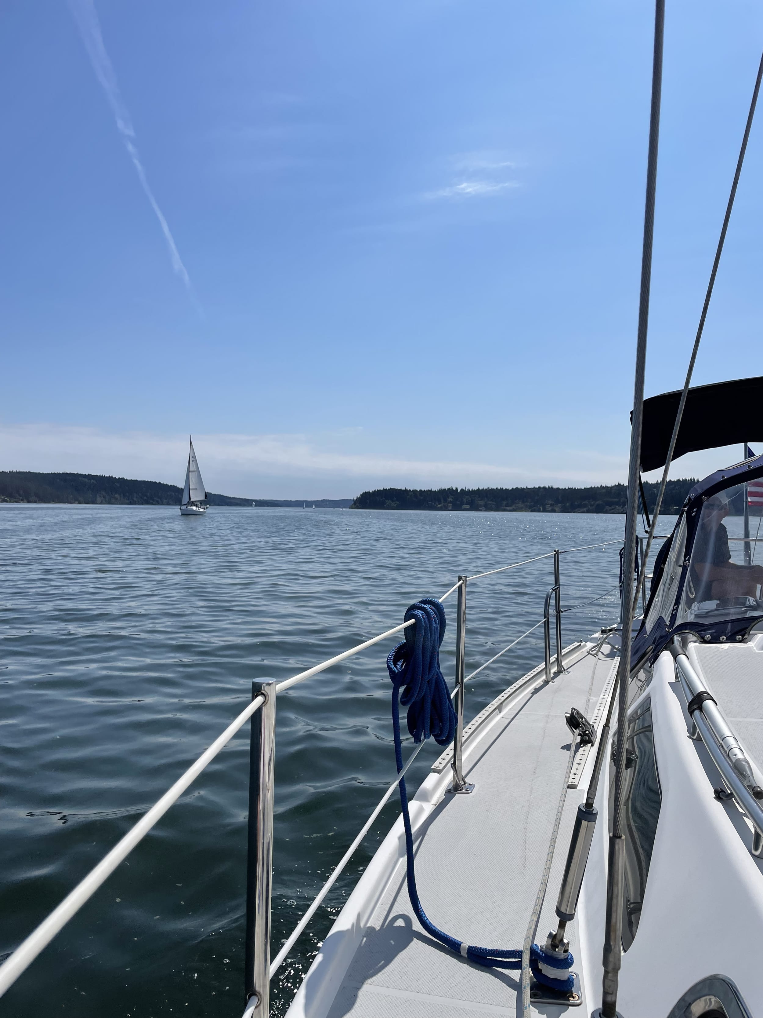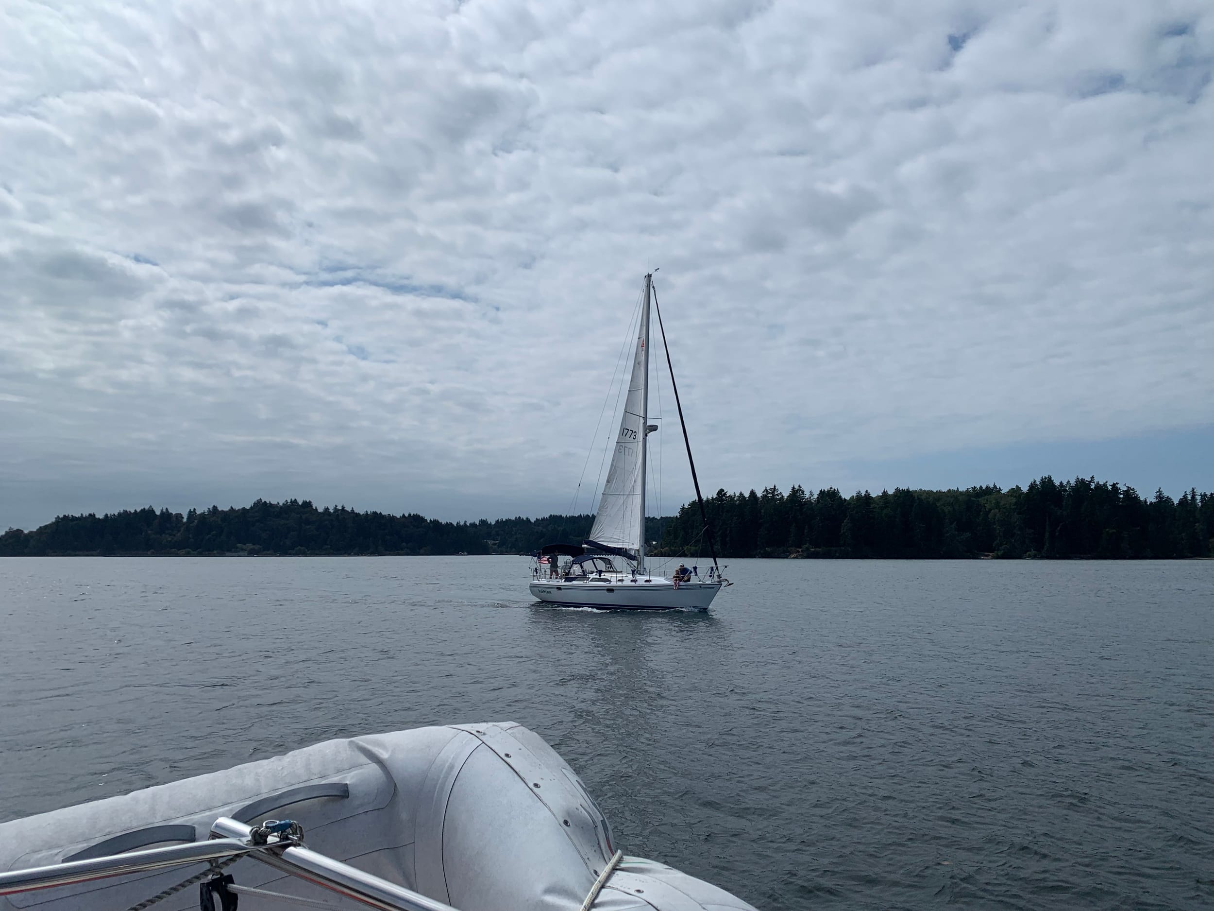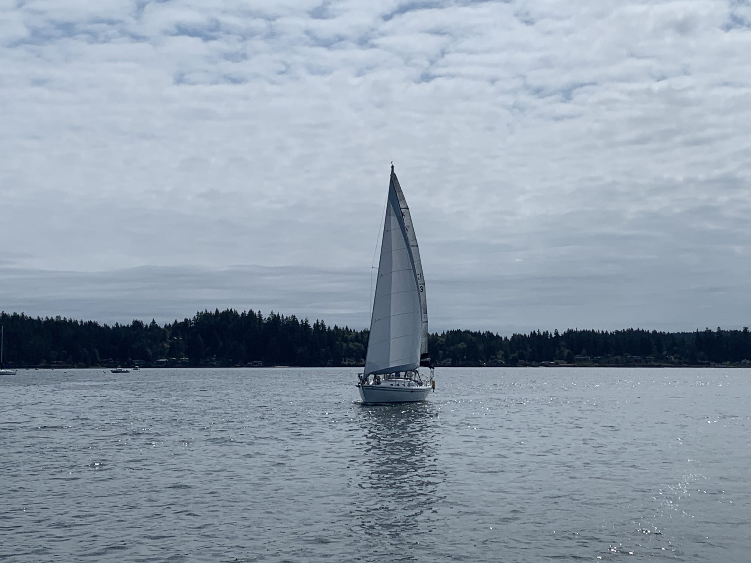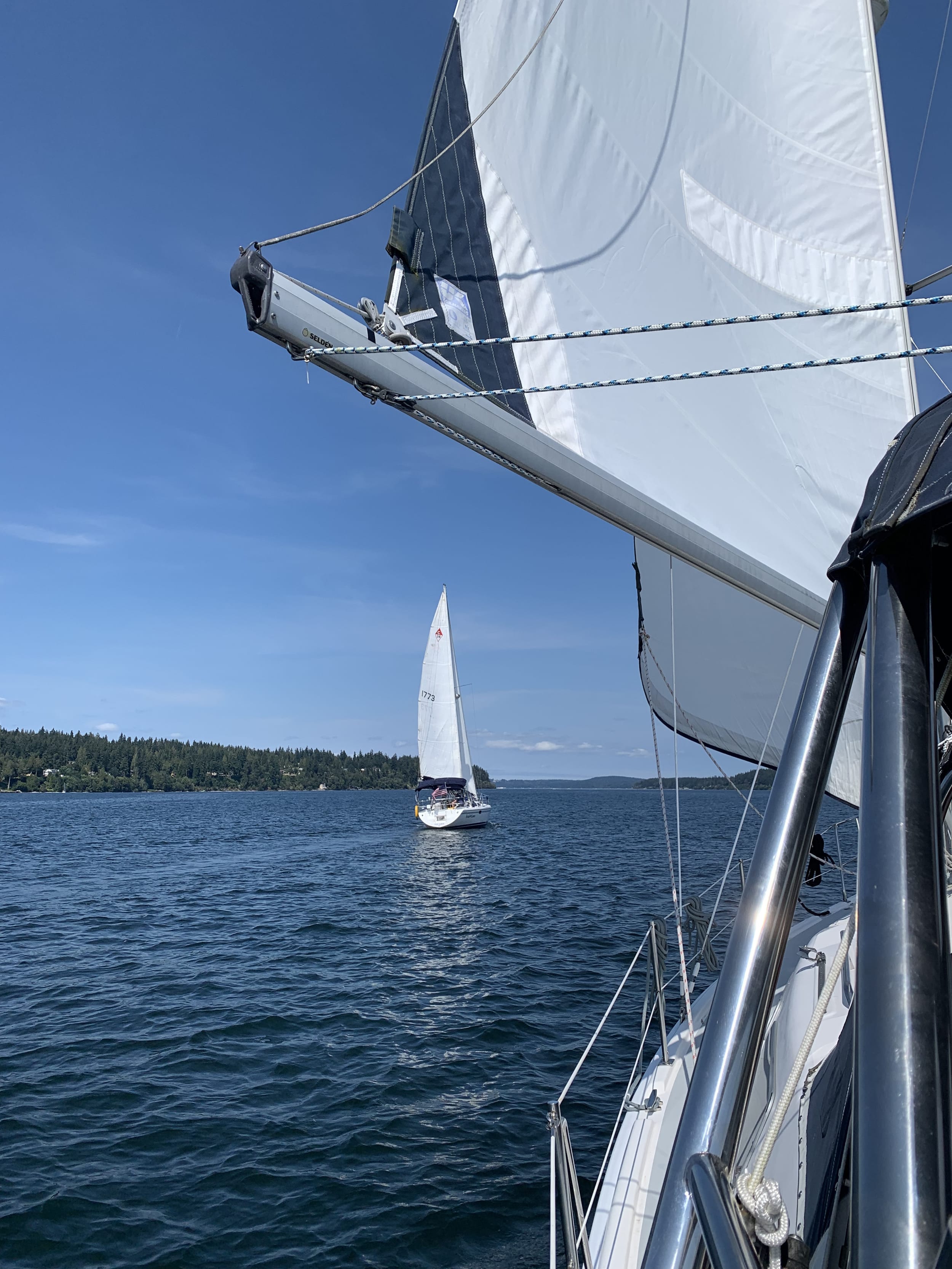 After rounding the southern end of Bainbridge, we started north at a broad reach (bordering on a run) in a much lighter winds - likely blocked by Bainbridge island. We took a small diversion to go further South and let Derek and Diane catch up - and the coolest part of this strech was that we sailed 50-100 ft apart the whole way up to Poulsbo. We got some great photos of Derek and Diane’s boat from our’s and vice versa. It’s like something out of a sailing magazine!