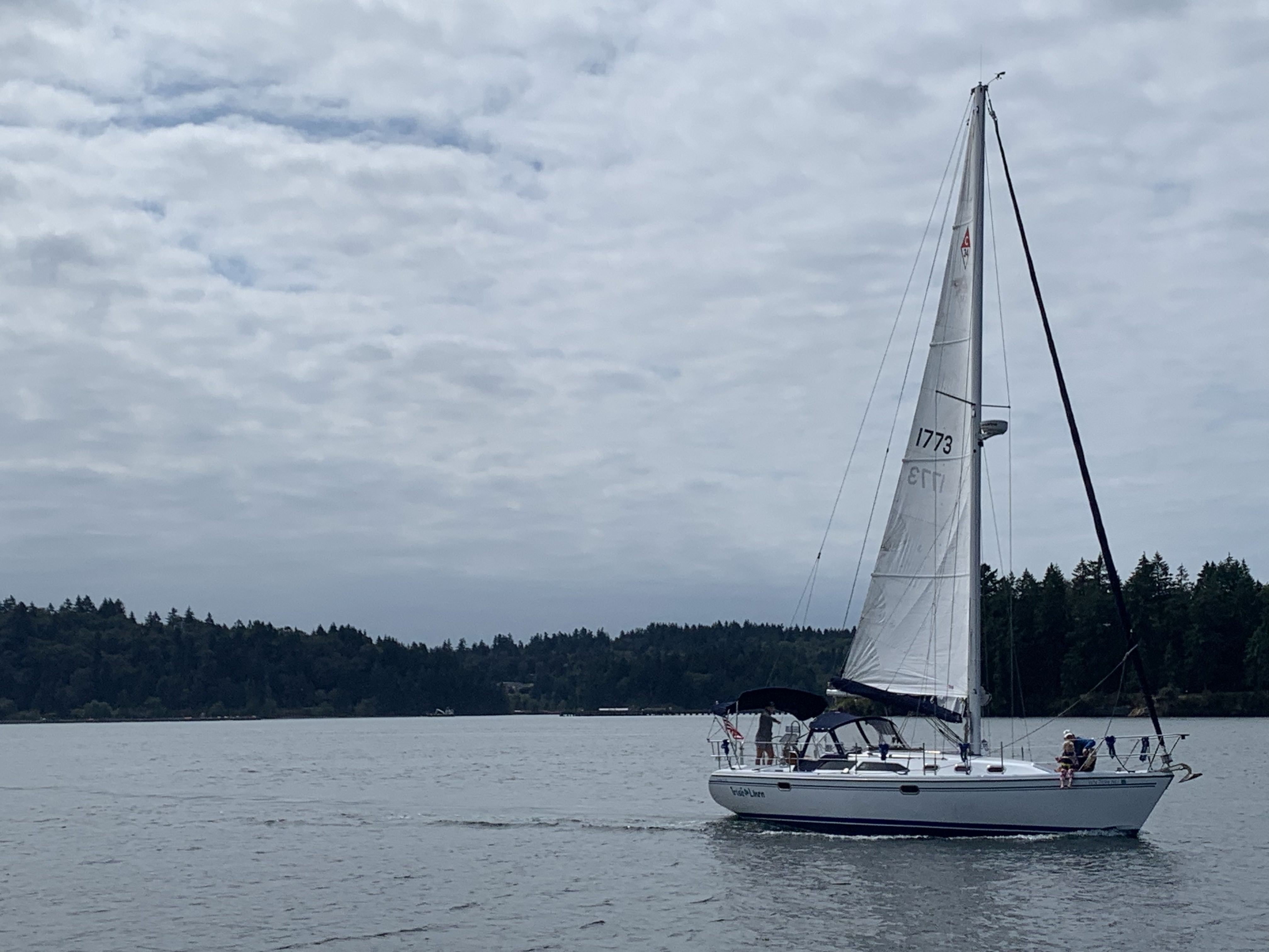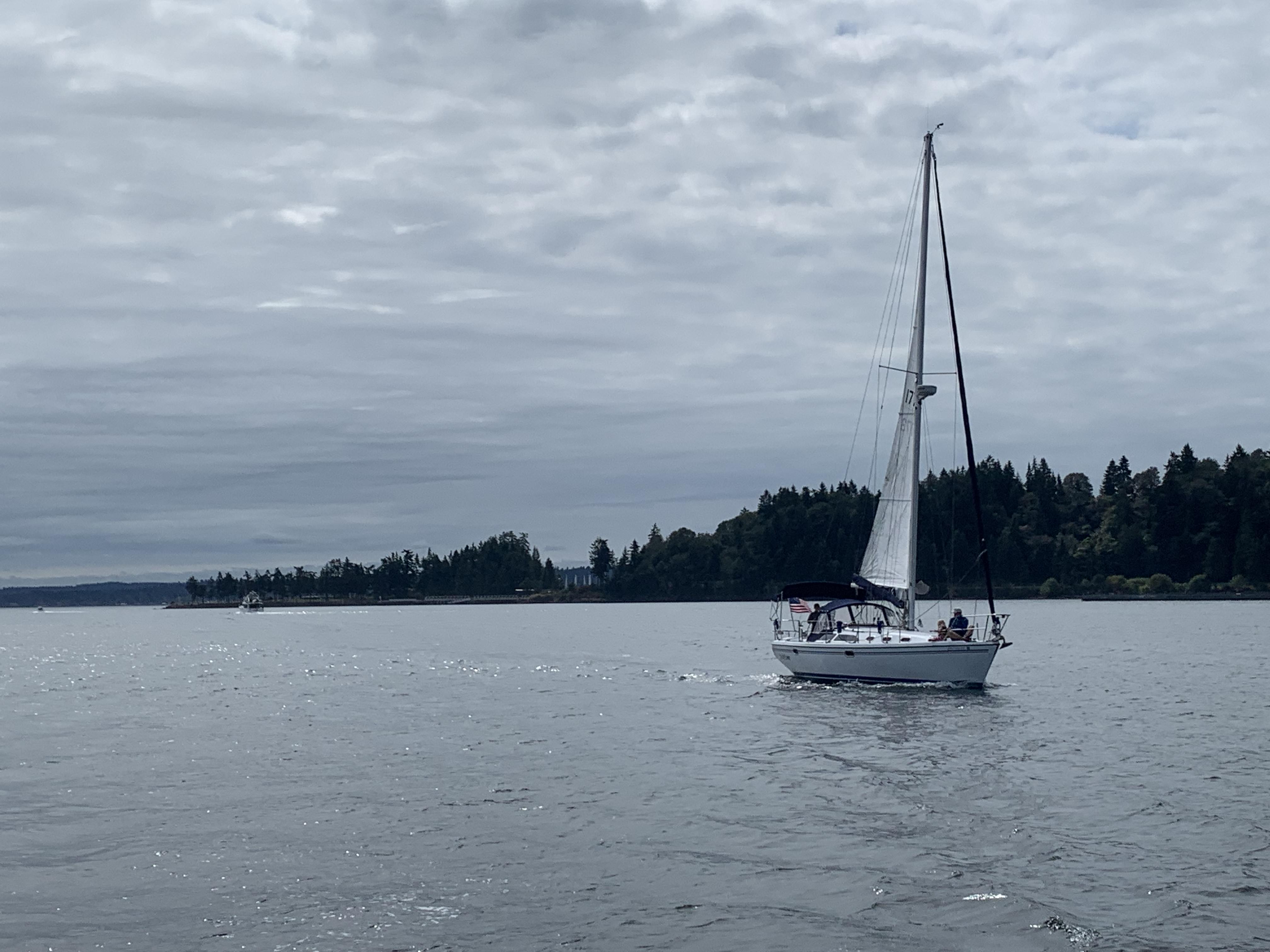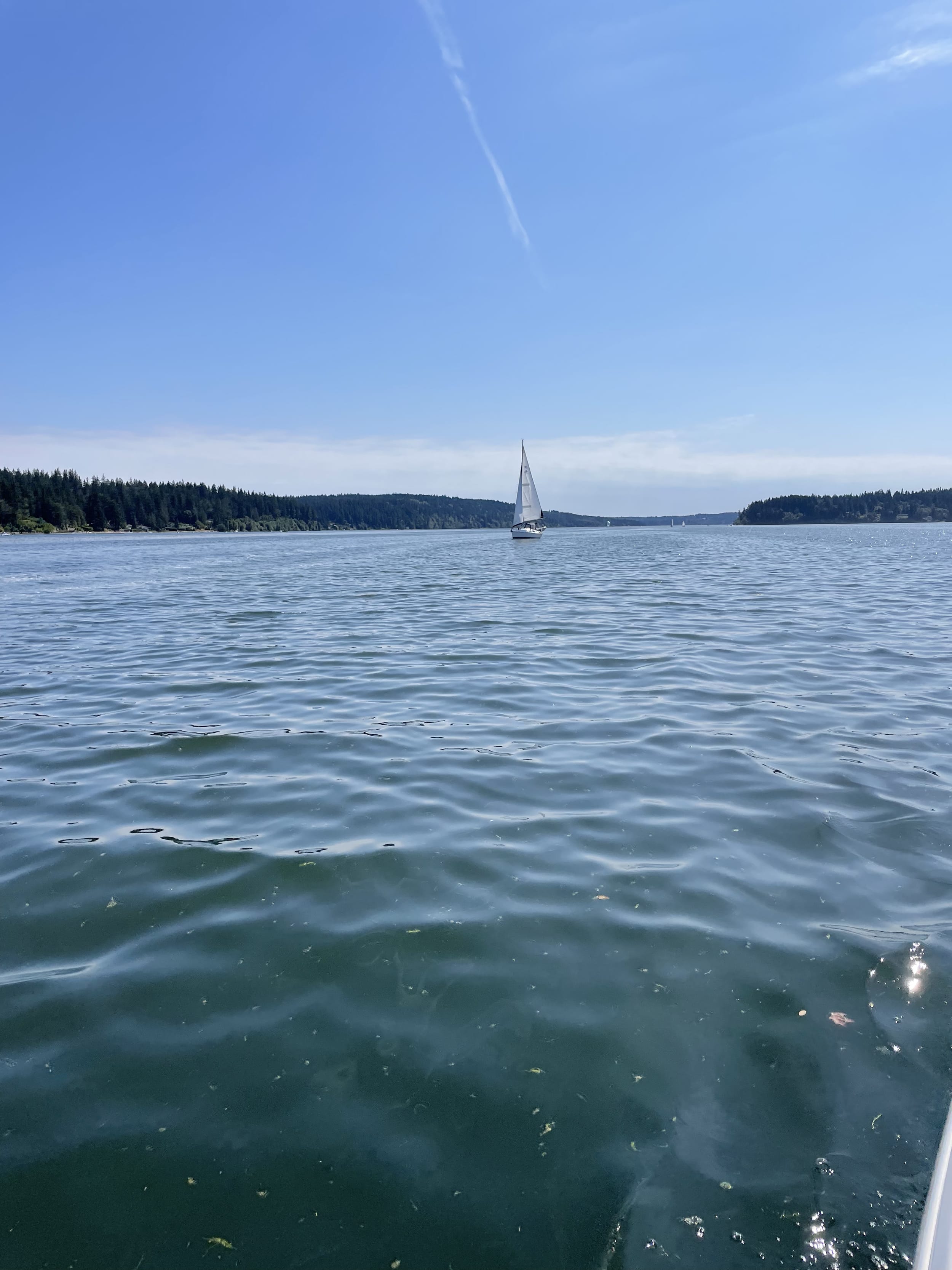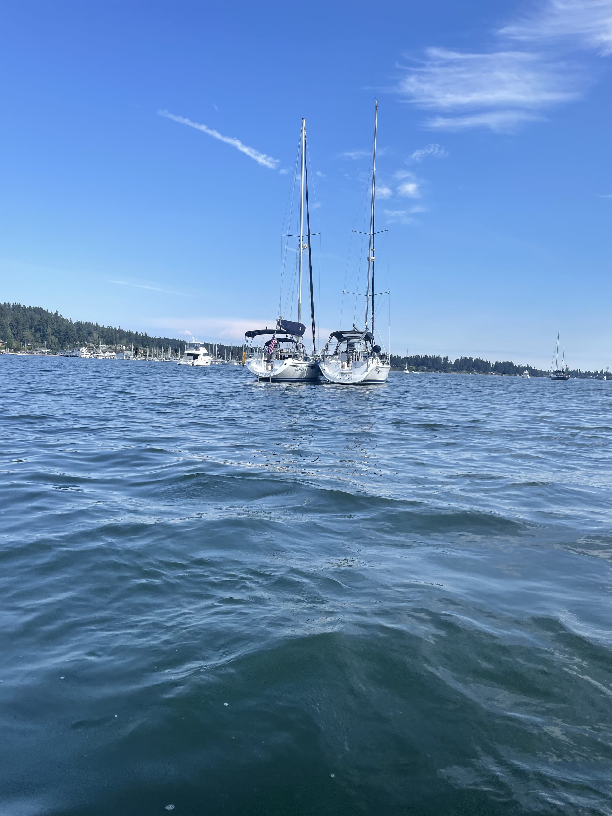 After rounding the southern end of Bainbridge, we started north at a broad reach (bordering on a run) in a much lighter winds - likely blocked by Bainbridge island. We took a small diversion to go further South and let Derek and Diane catch up - and the coolest part of this strech was that we sailed 50-100 ft apart the whole way up to Poulsbo. We got some great photos of Derek and Diane’s boat from our’s and vice versa. It’s like something out of a sailing magazine!