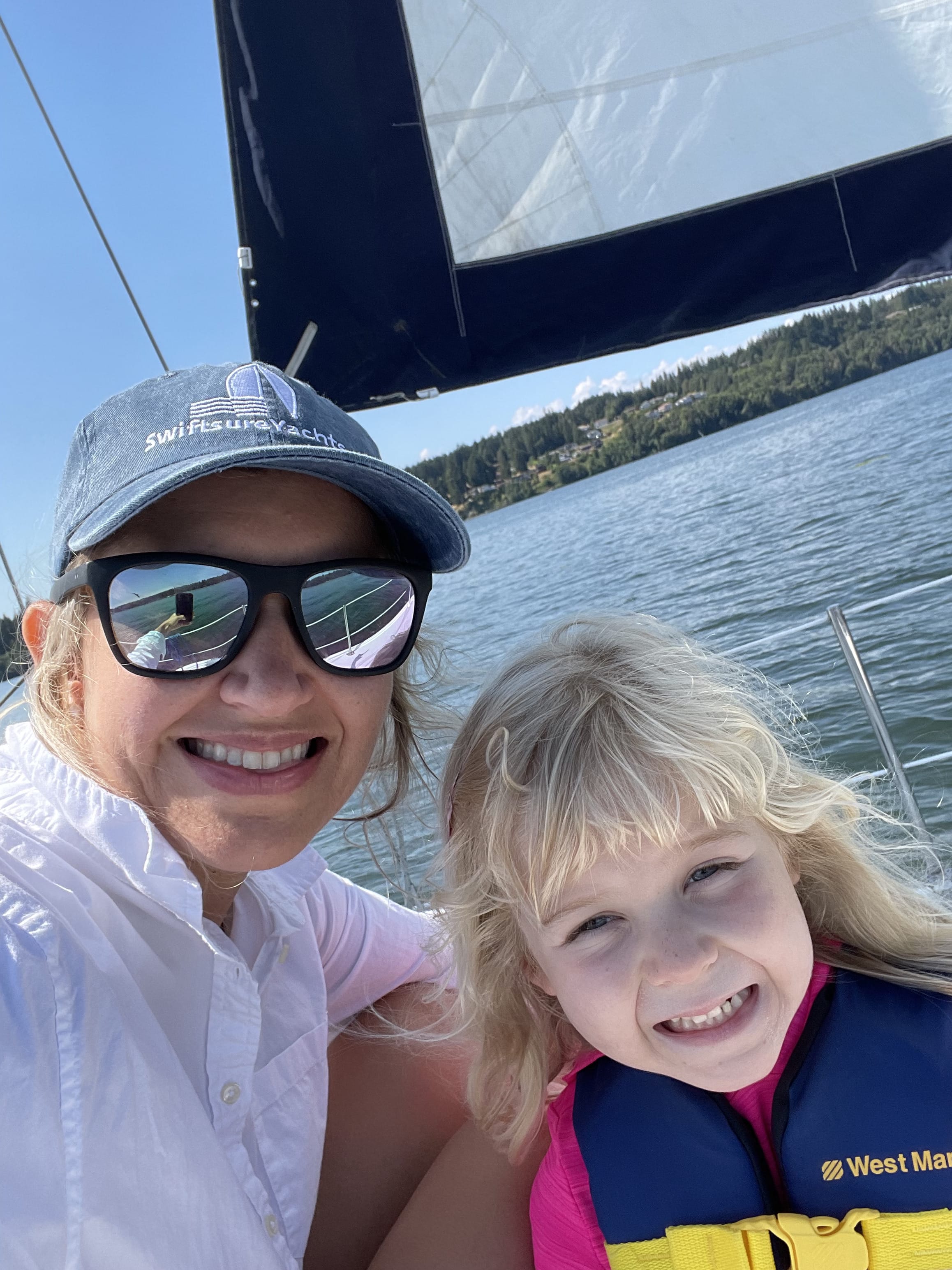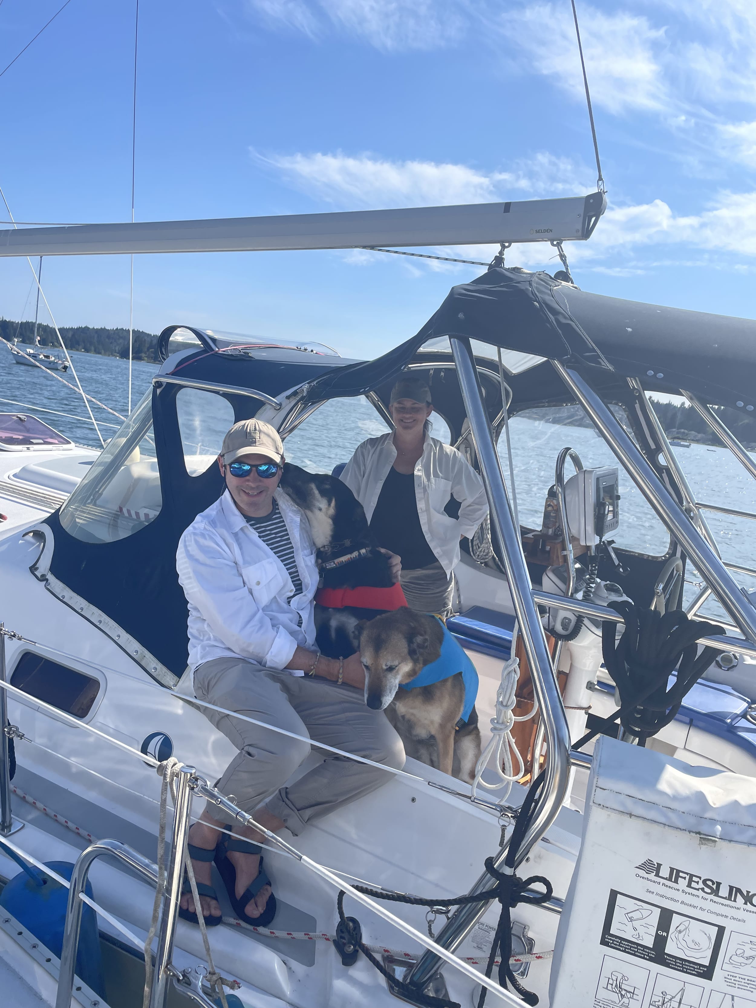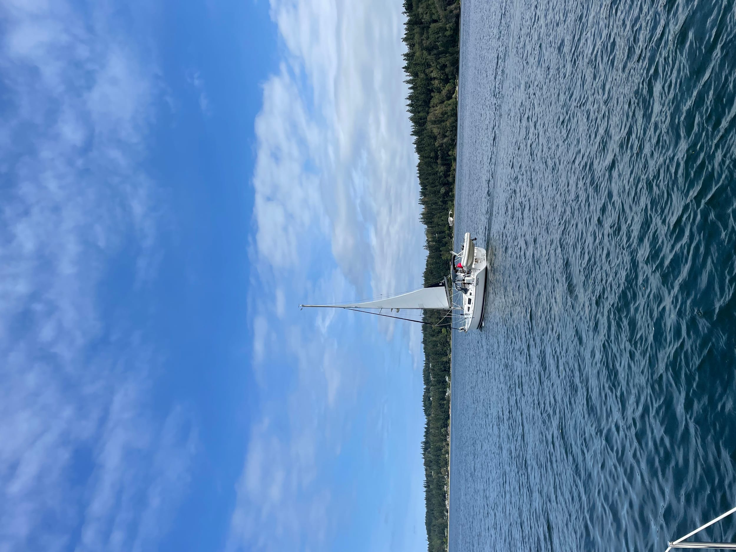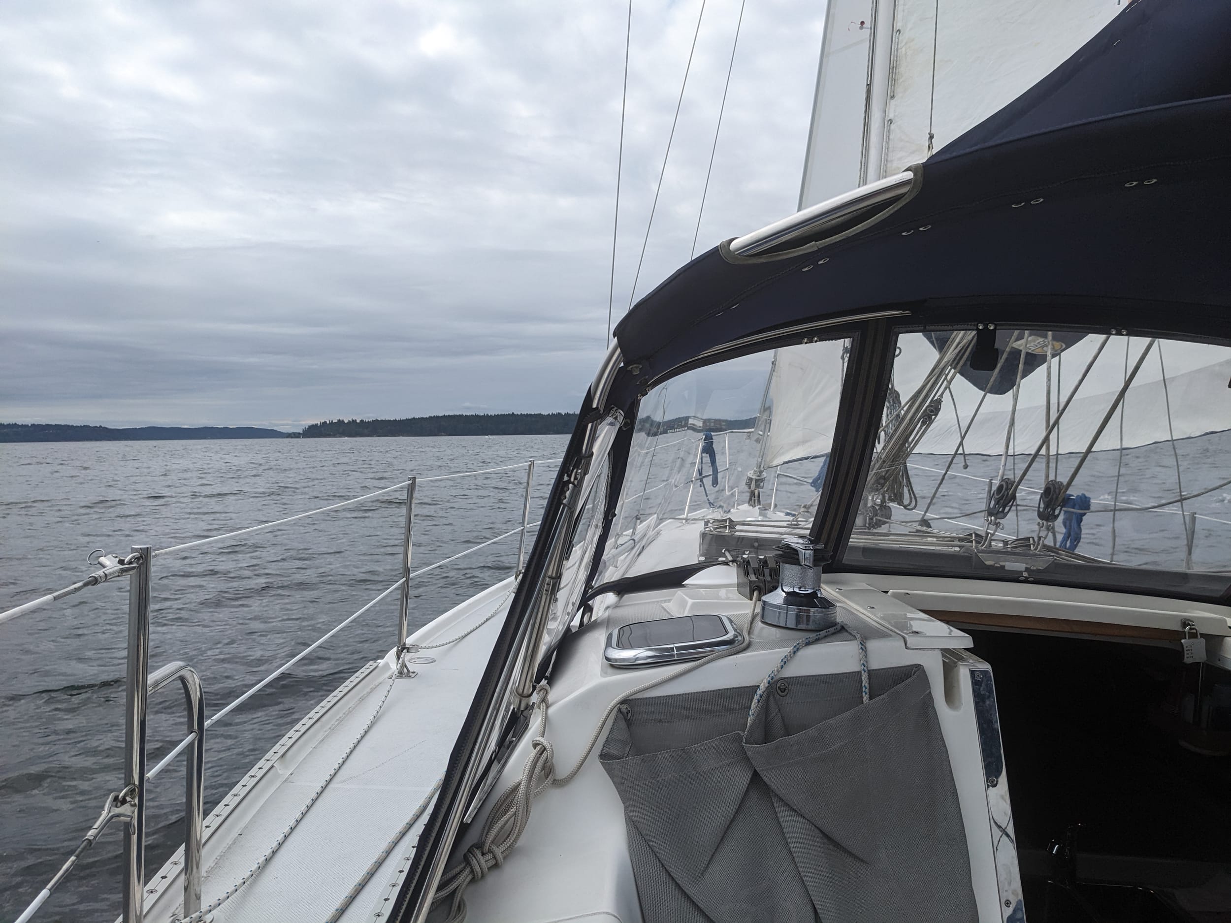 After rounding the southern end of Bainbridge, we started north at a broad reach (bordering on a run) in a much lighter winds - likely blocked by Bainbridge island. We took a small diversion to go further South and let Derek and Diane catch up - and the coolest part of this strech was that we sailed 50-100 ft apart the whole way up to Poulsbo. We got some great photos of Derek and Diane’s boat from our’s and vice versa. It’s like something out of a sailing magazine!