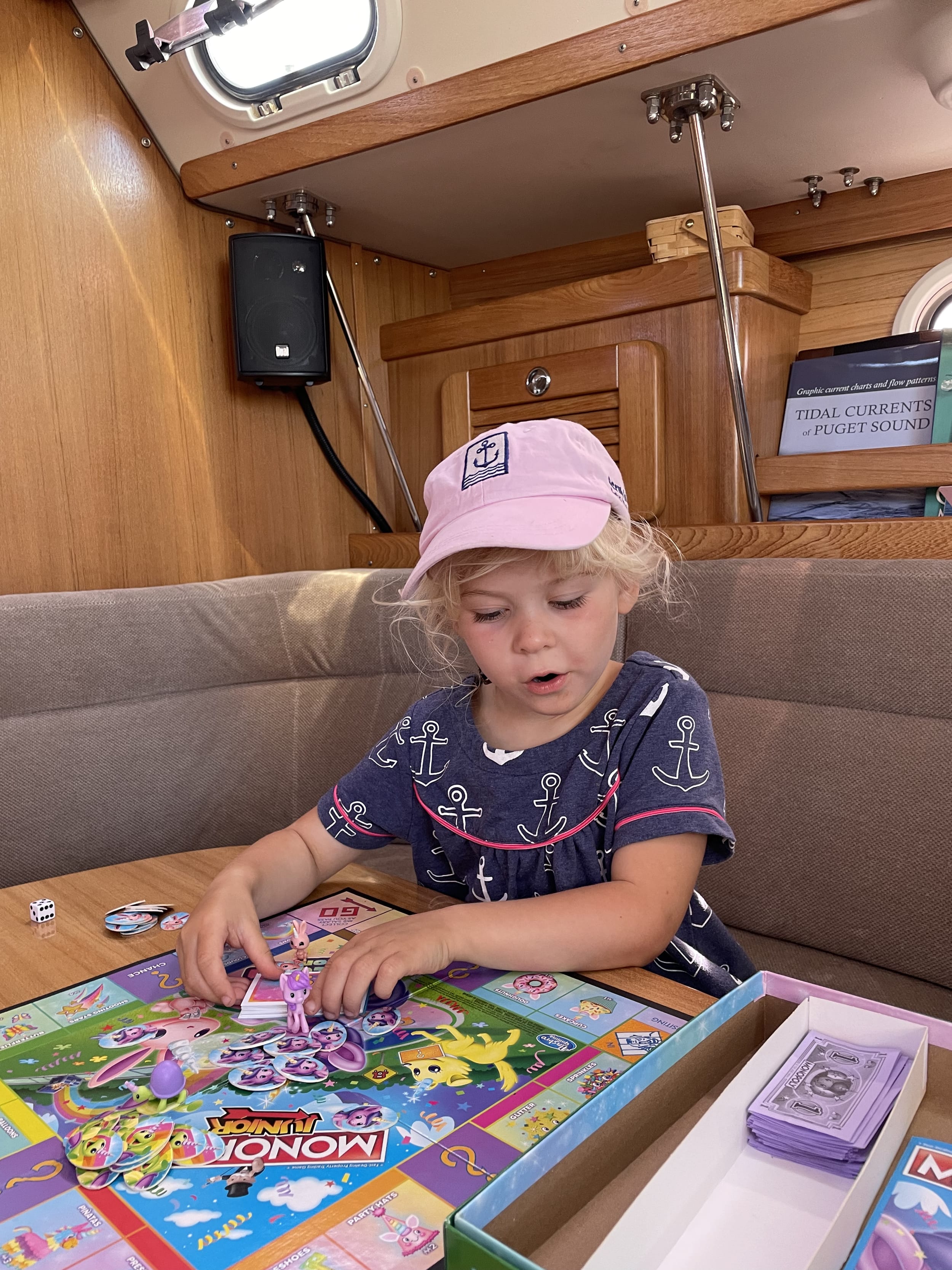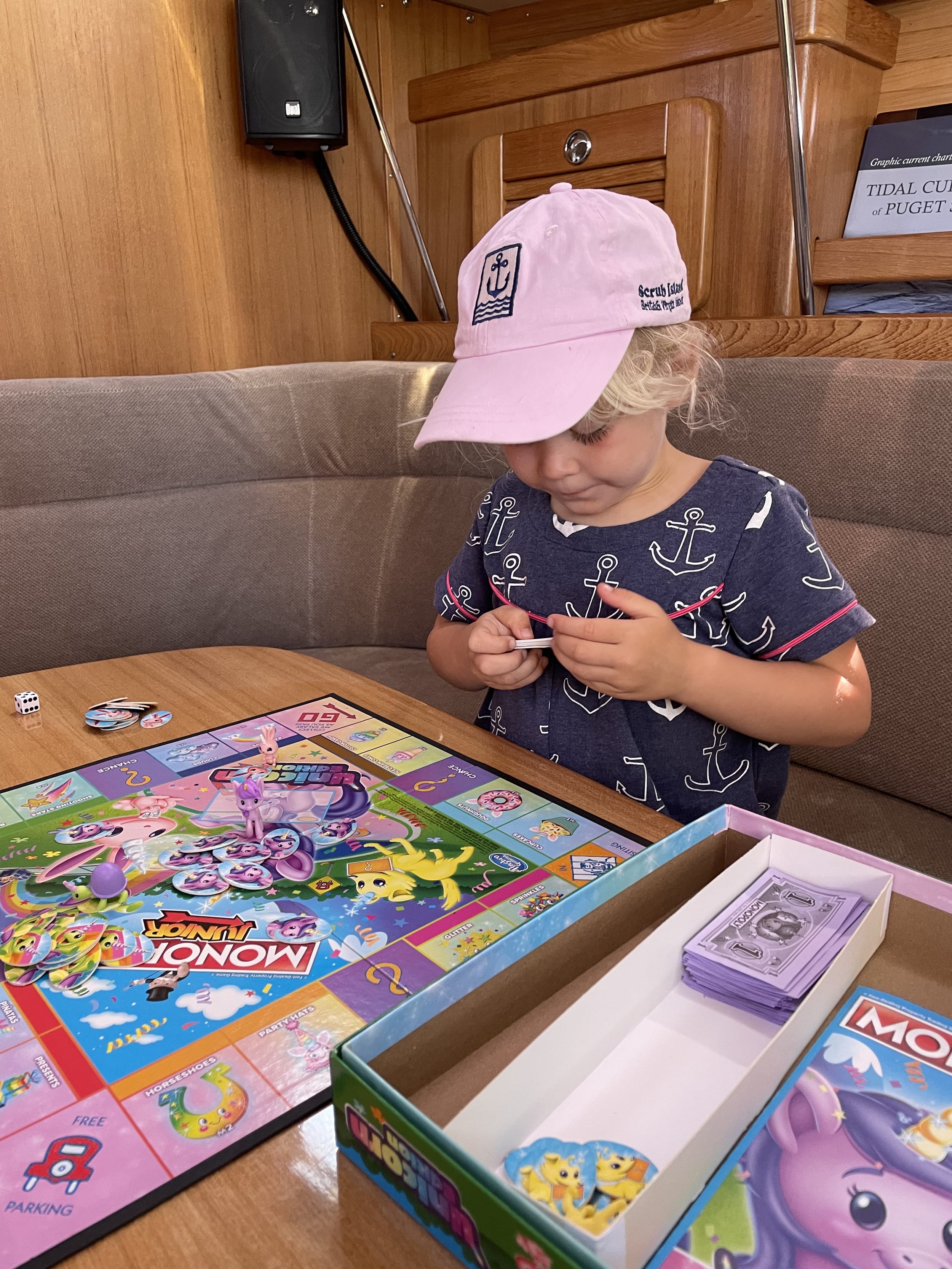 Sara has a hankering to play unicorn monopoly and convinced D&D to come over for a game - board games are super fun on the boat and, while unicorn monopoly was fun, I’m excited to try some more complex games as Sara gets older.
