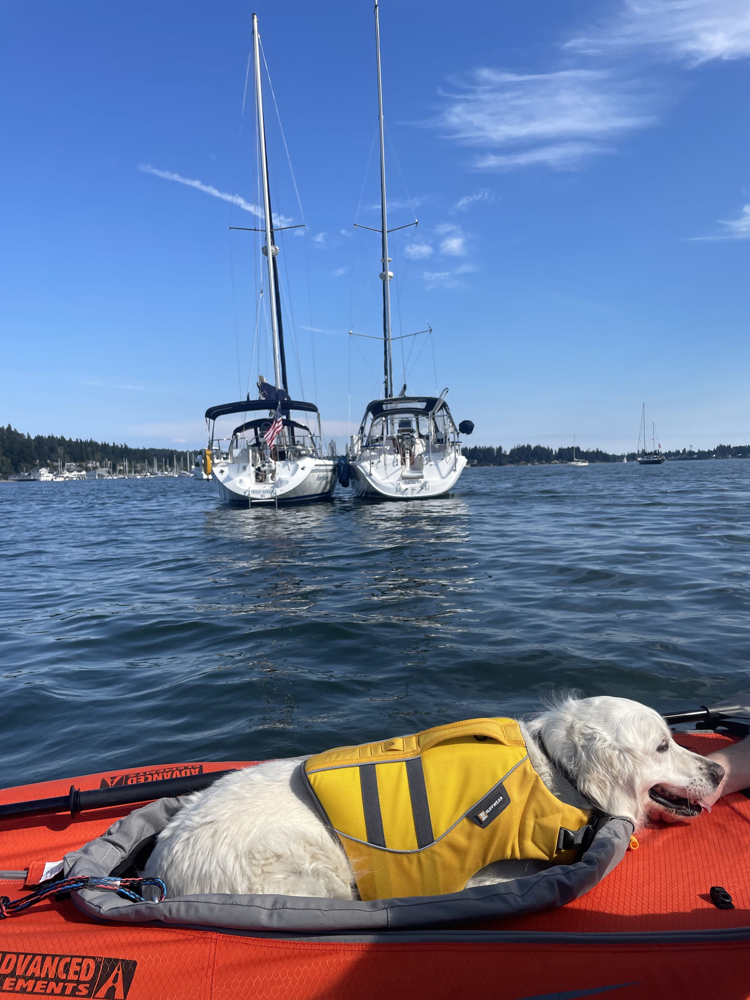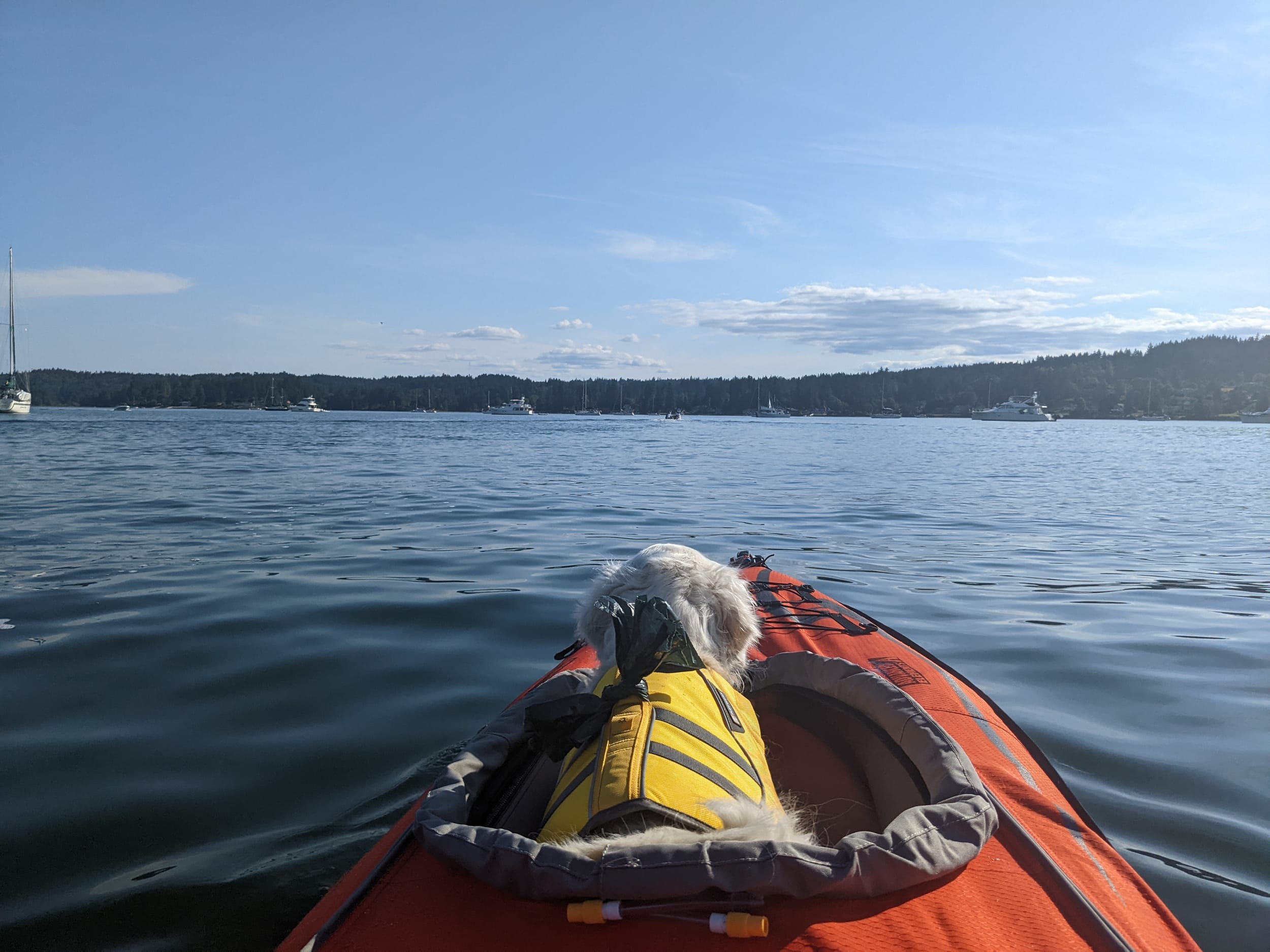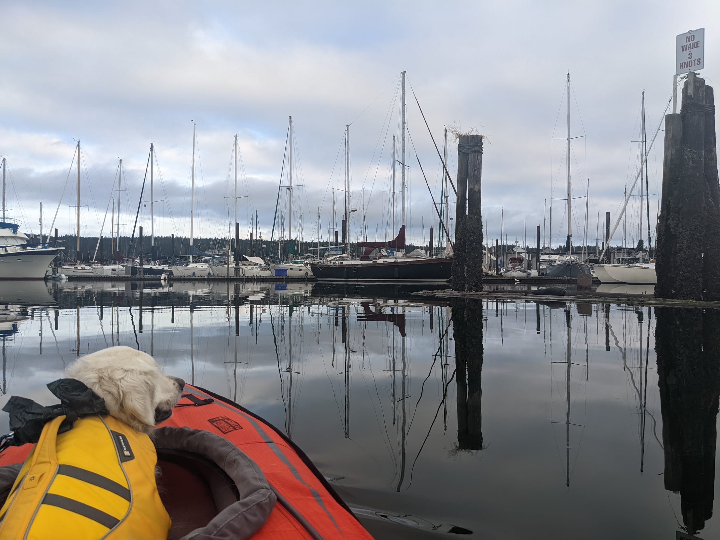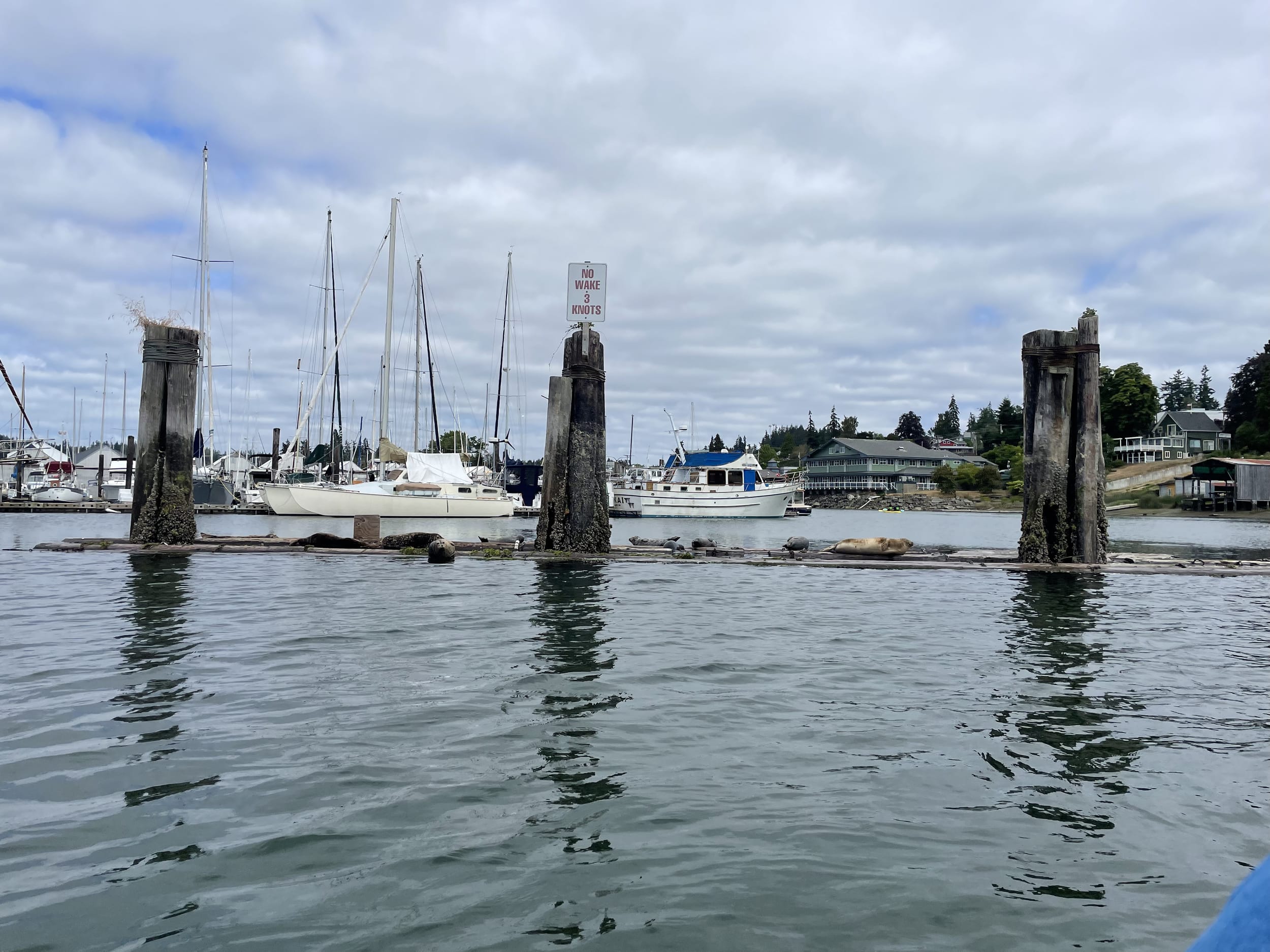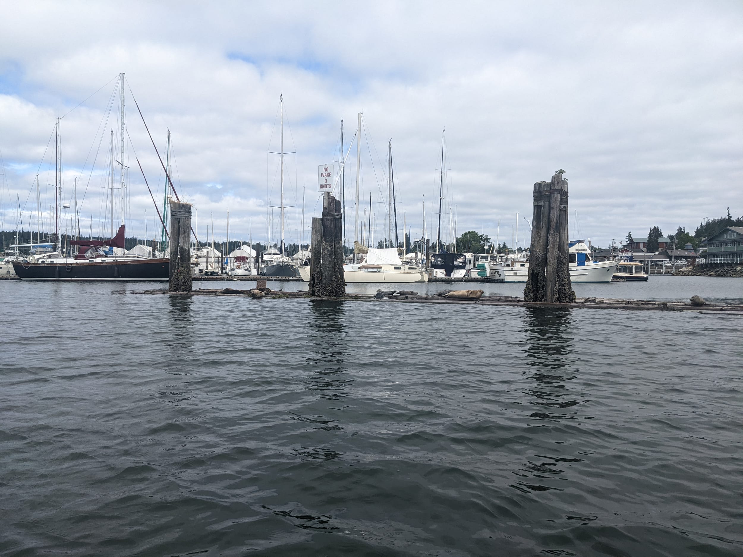 Right at the entrance to the marina, there was a log float that the seals seemed to love. They seemed un-interested in the dinghy’s or larger boats, but a kayak with a dog onboard spiked their curiousity. Two of them came up within a couple of feet of our kayak to catch a peek. I was a bit worried about Oakely, but she seemed to do just fine with it.
