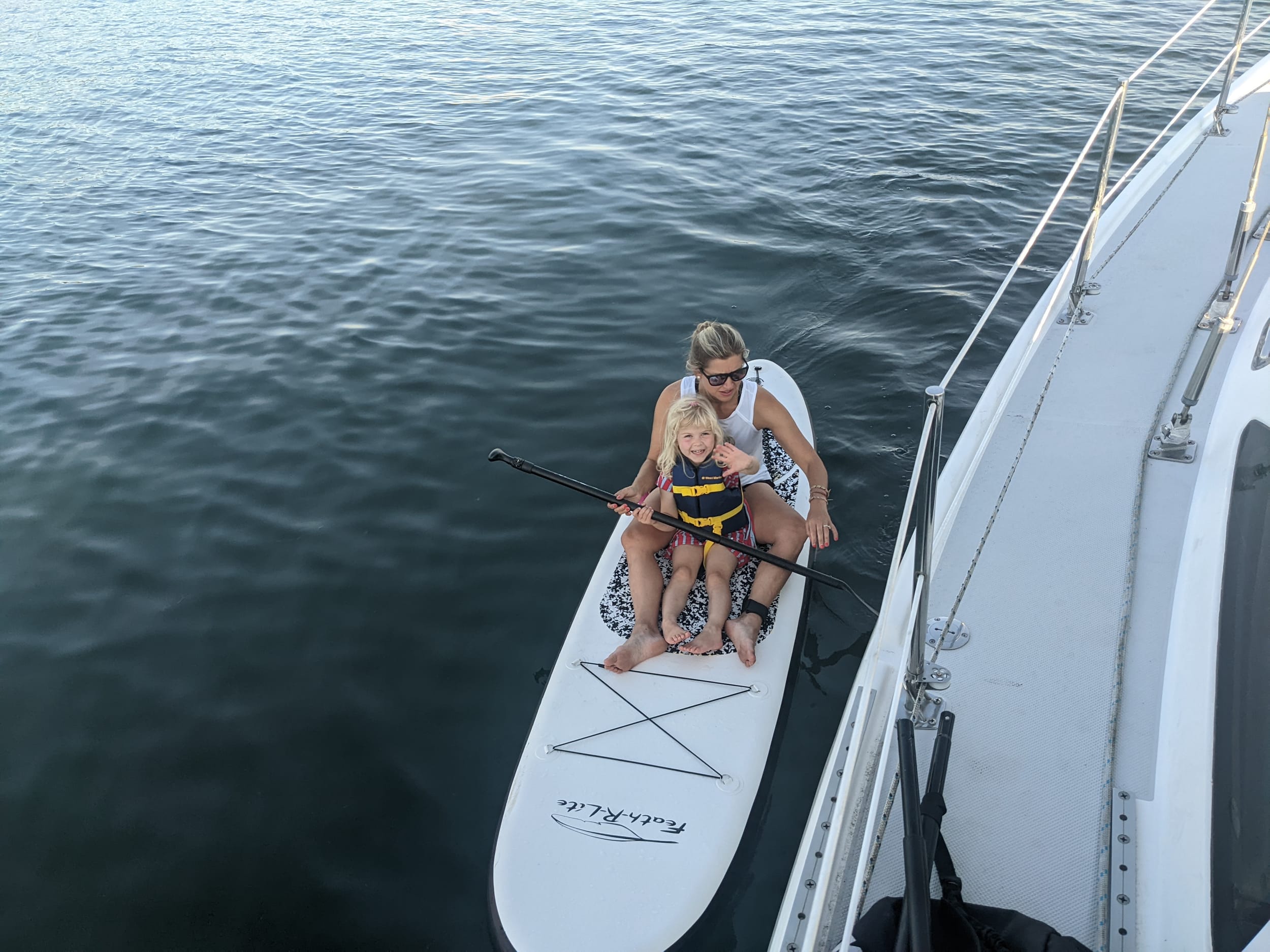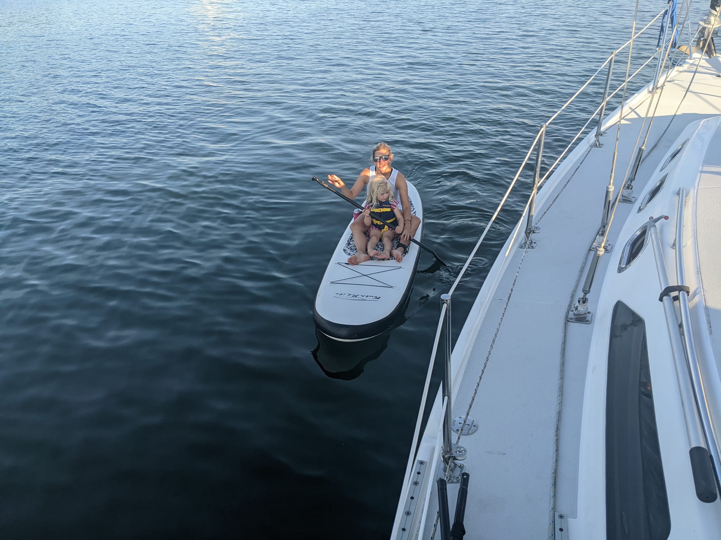 The next day, a coupe of us headed ashore to get breakfast and let the dogs use the grass. We had breakfast on the boat followed by some water toys - Angela and Sara got out the paddleboard and did a quick tour of the anchorage.