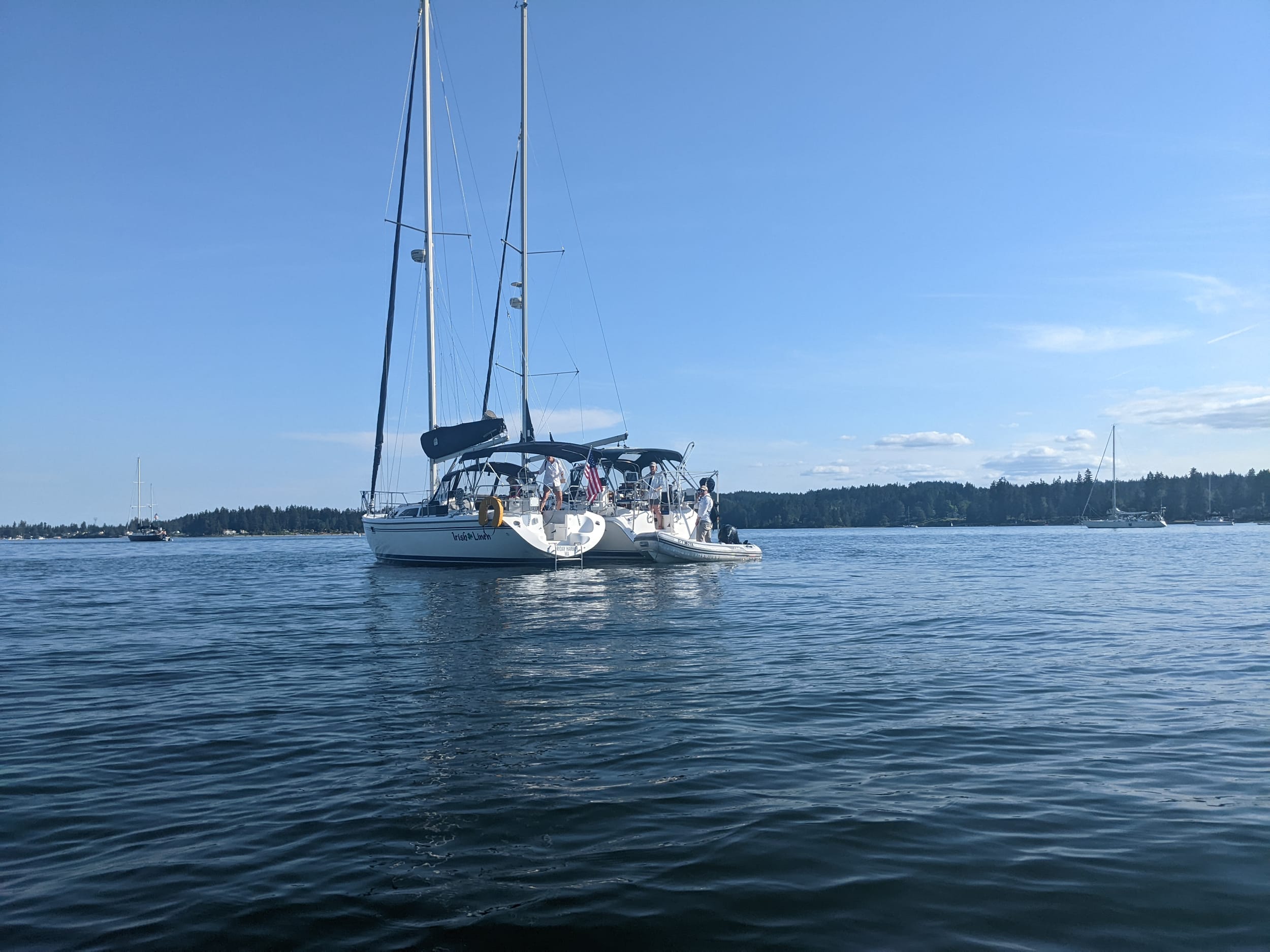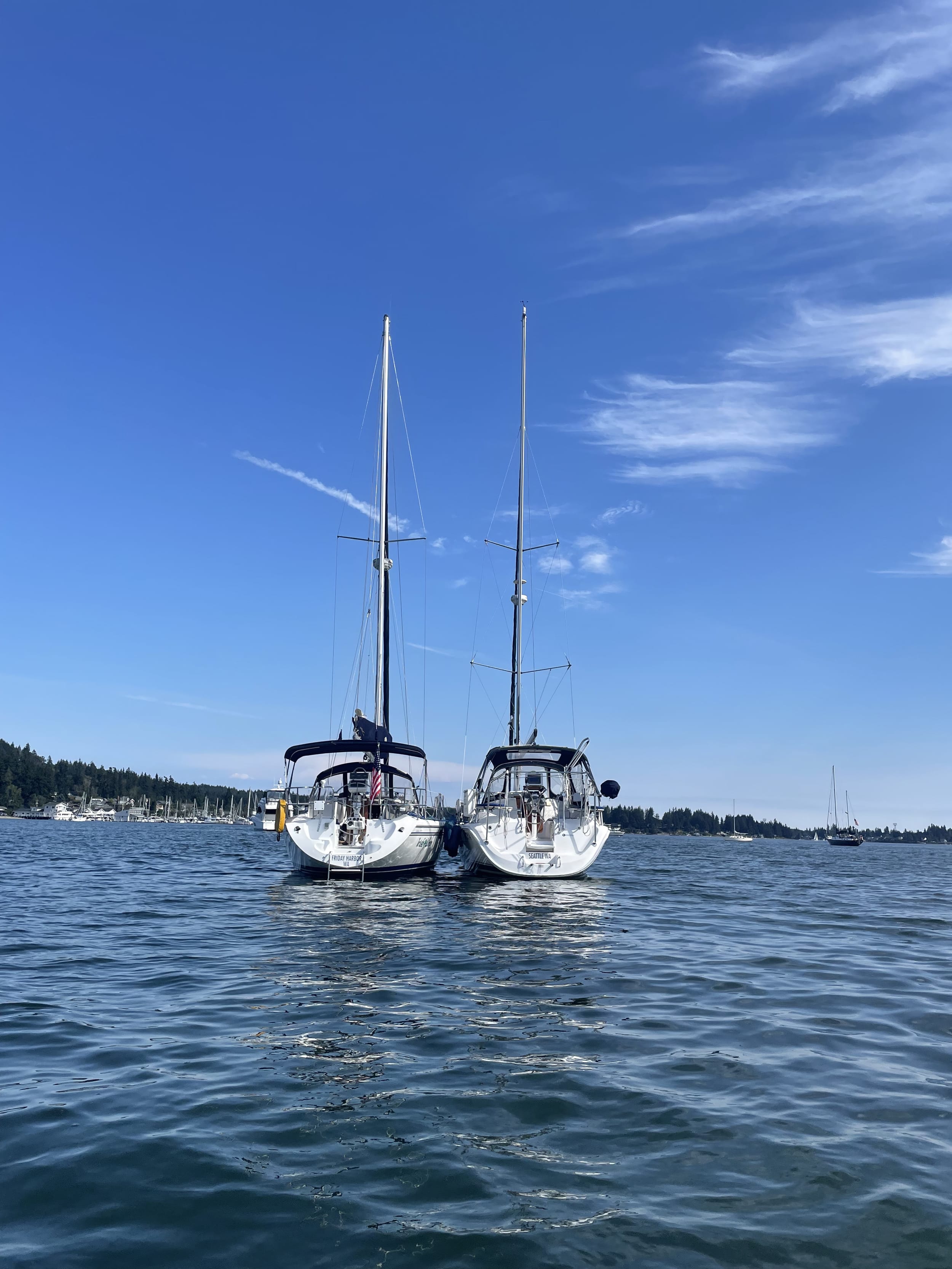 Poulsbo has a very strong anchorage (shallow enough and strong holding mud bottom) - when we got to the anchorage there were at least 50 boats of different sizes anchored up. Derek proposed that we raft up - what a great idea… Derek & Diane dropped anchor and we pulled up along side and tied up. This meant we could hop over to each other’s boats without using a dinghy - which was awesome for making dinner. We could also hop back and forth for drinks/etc.