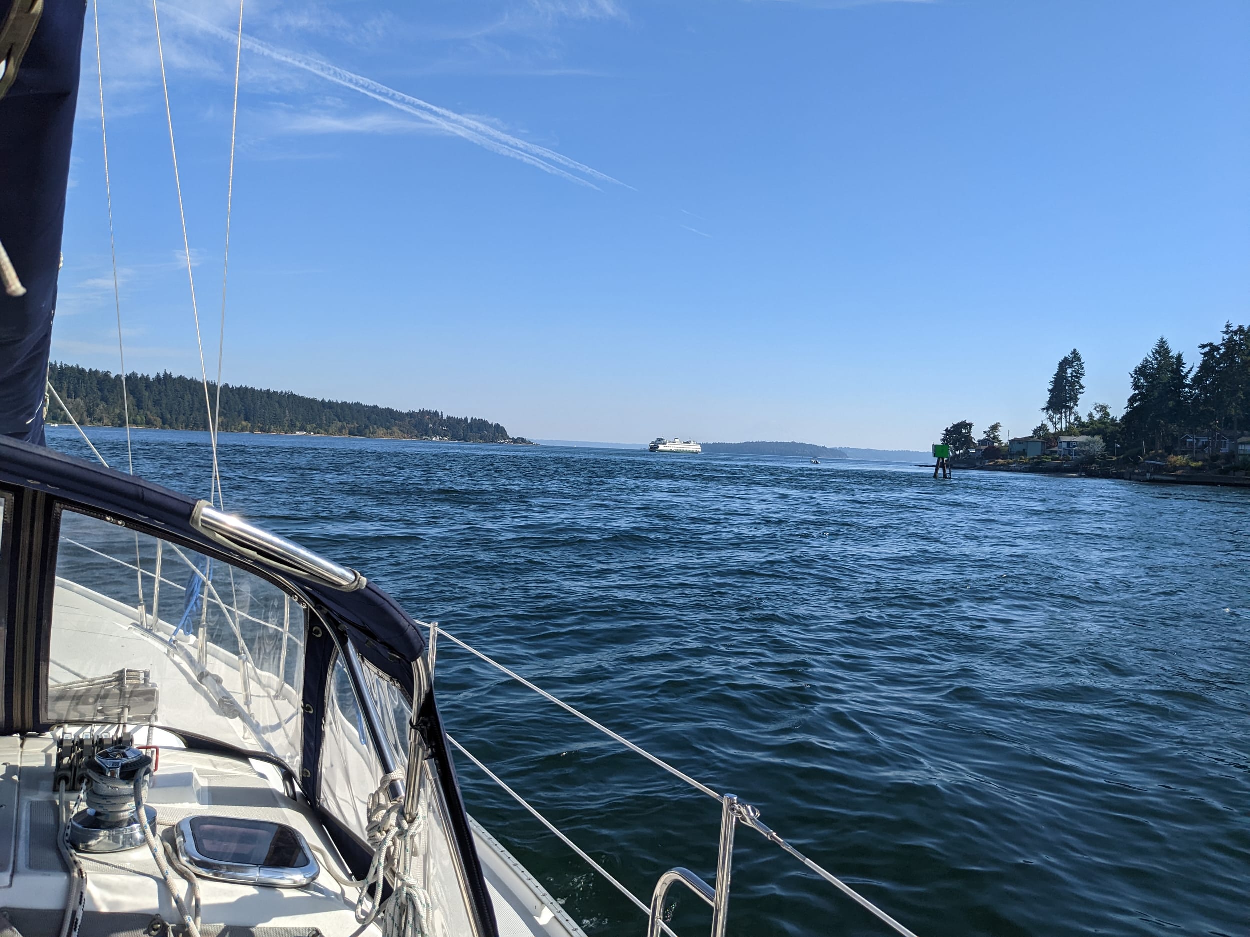 We left for home around 10a and unfortunately, we had to motor most of the way. We got a little motor sailing in as we got out from behind the Bainbridge wind shadow, but it was not quite enough to turn the motor off.