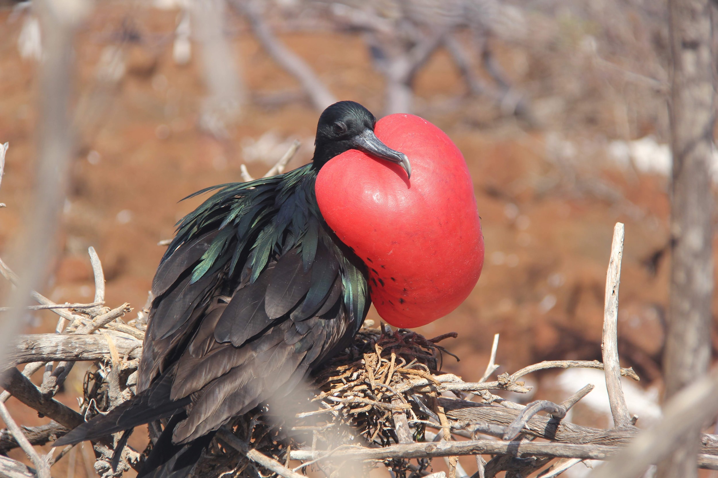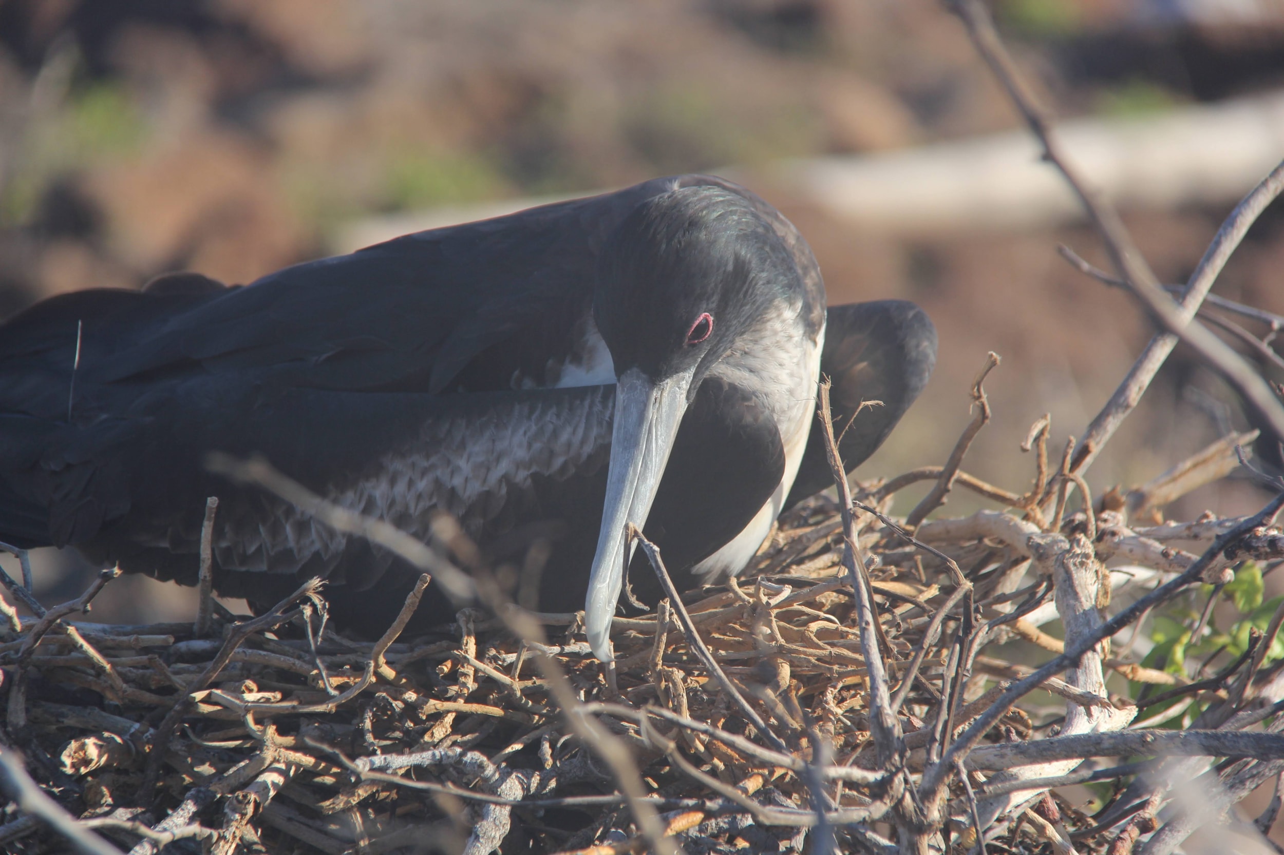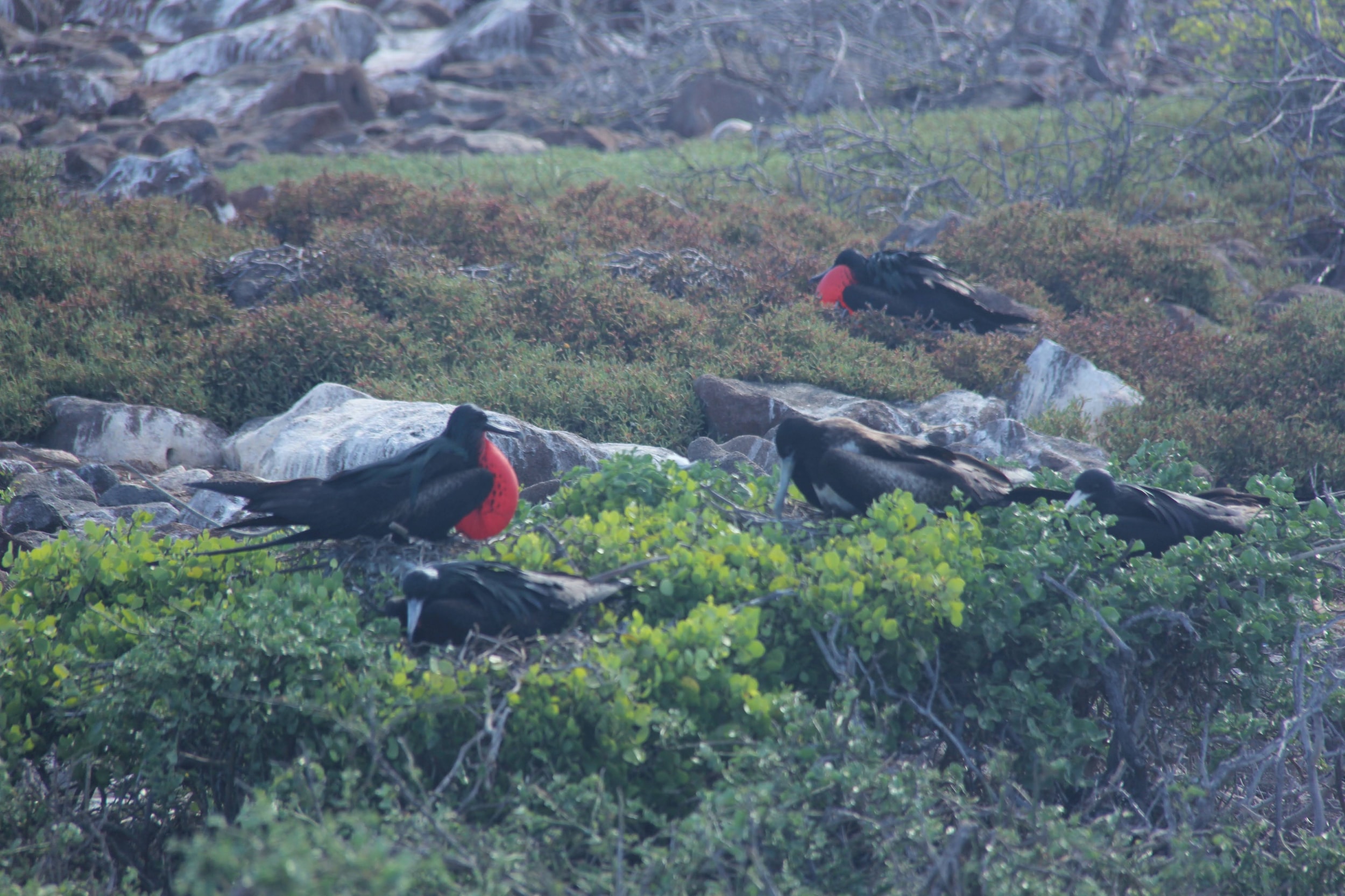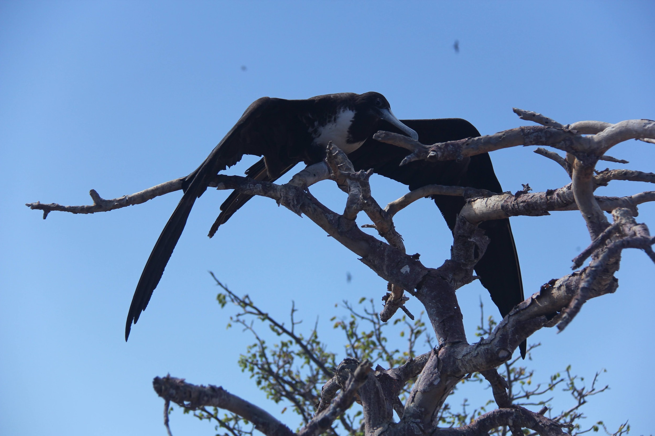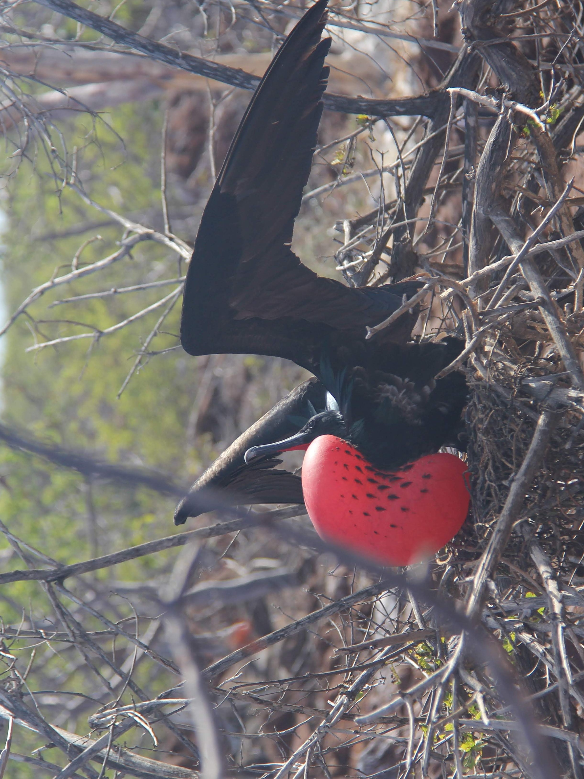 This particular island had an enormous number of frigate birds - of which their are two types, the magnificent and the great (the difference is very subtle). It was frigate bird mating season so all the males had their red pouches inflated - which looked very impractical in my opinion. Frigate birds can’t get wet, they don’t have the oily coat on their feathers like other birds do. Instead they fly low over the ocean and snatch fish right near the surface and, quite often it turns out, they steal from other birds. Other birds have to be very careful around the frigate birds!