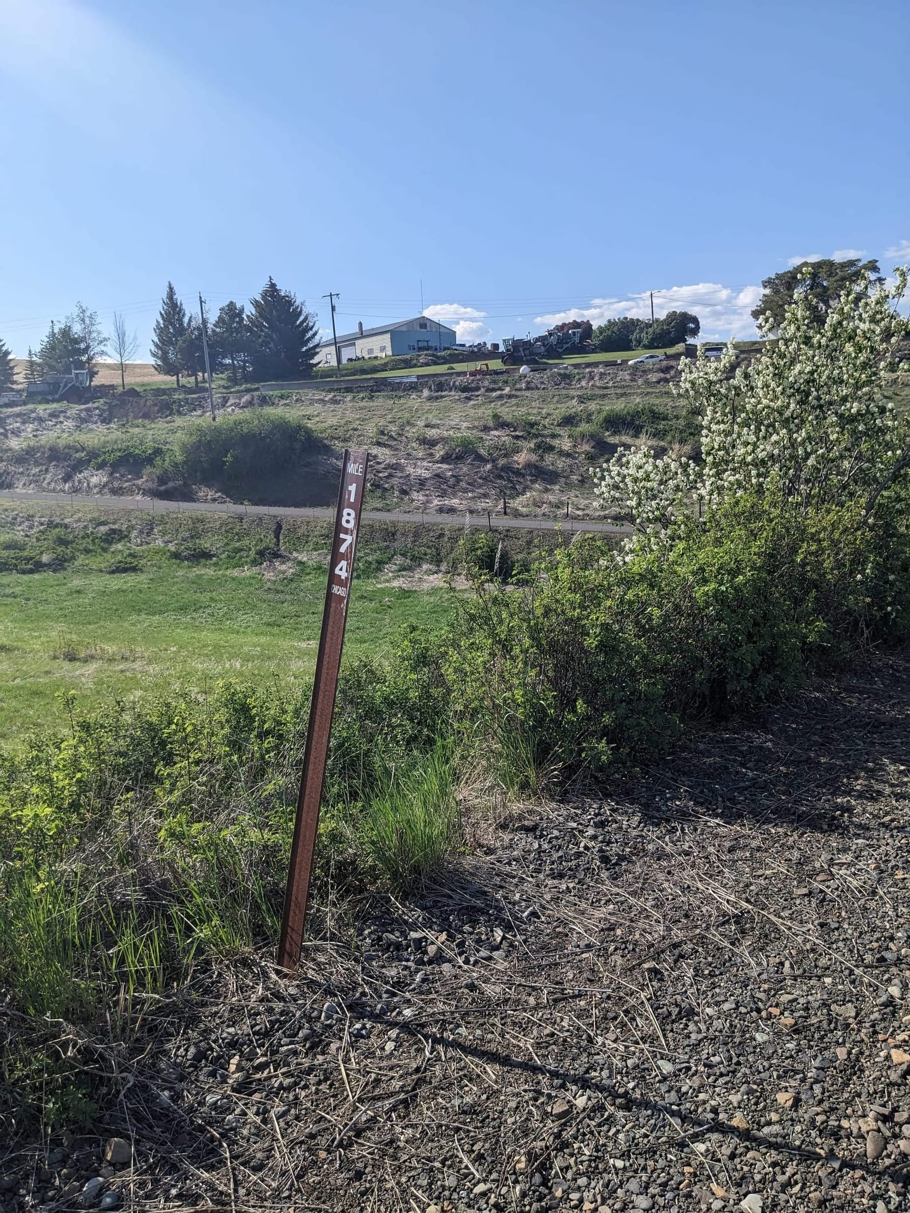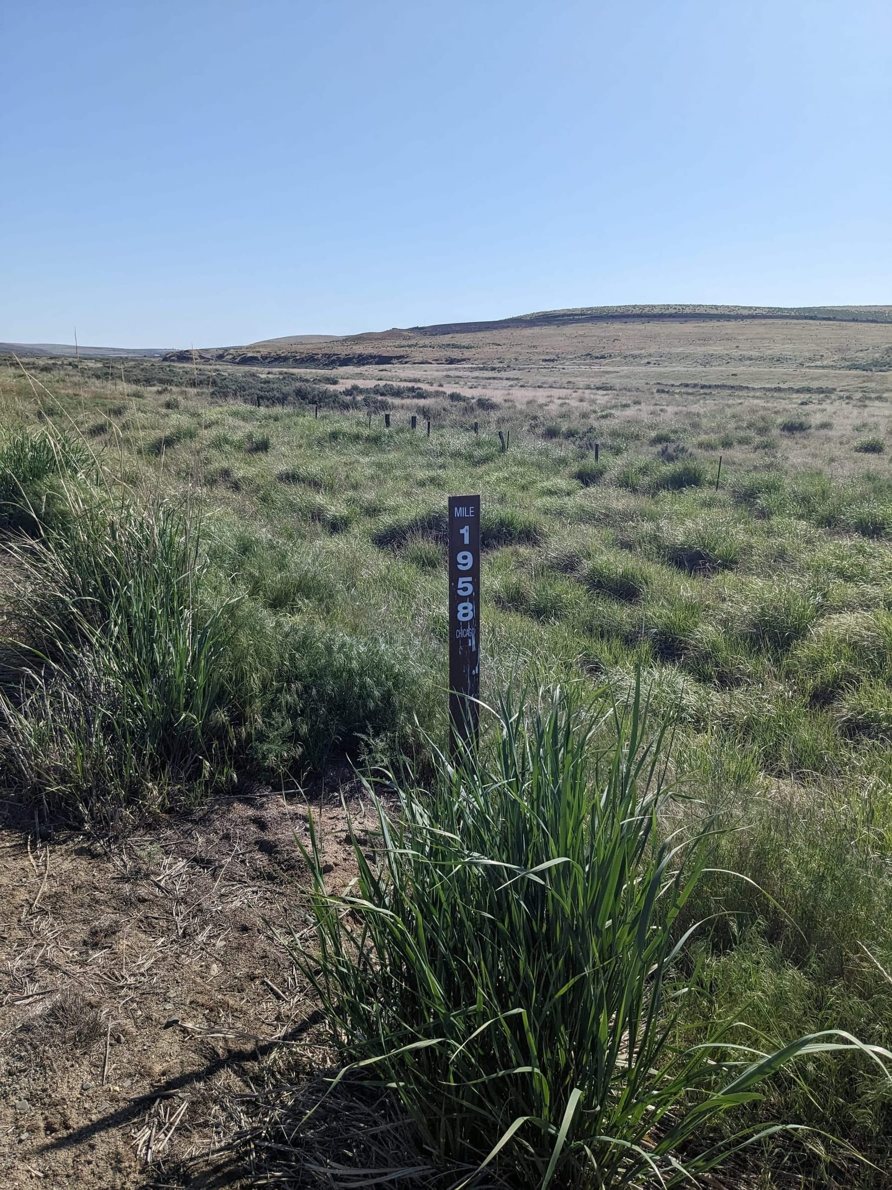 Our next major landmark was the Cow Creek Crossing - which as late as last year was posted as a 15 mile detour on roads going north almost as far as Ritzville to get around a downed bridge. A local rancher had very generously opened a bypass that went through their land, complete with placards showing the way and kiosks that would eventually show some history of the region (they were blank as of our crossing). A sign at the entrance of the bypass asked us to text the owner and let them know we were coming through - which we did. The response was very accomidating - asking us to take note of any downed markers (apparently the cattle like to knock them over) and let them know if we had any trouble following the trail. The route was easy to follow, except for a territorial bull who really wanted us to go around…