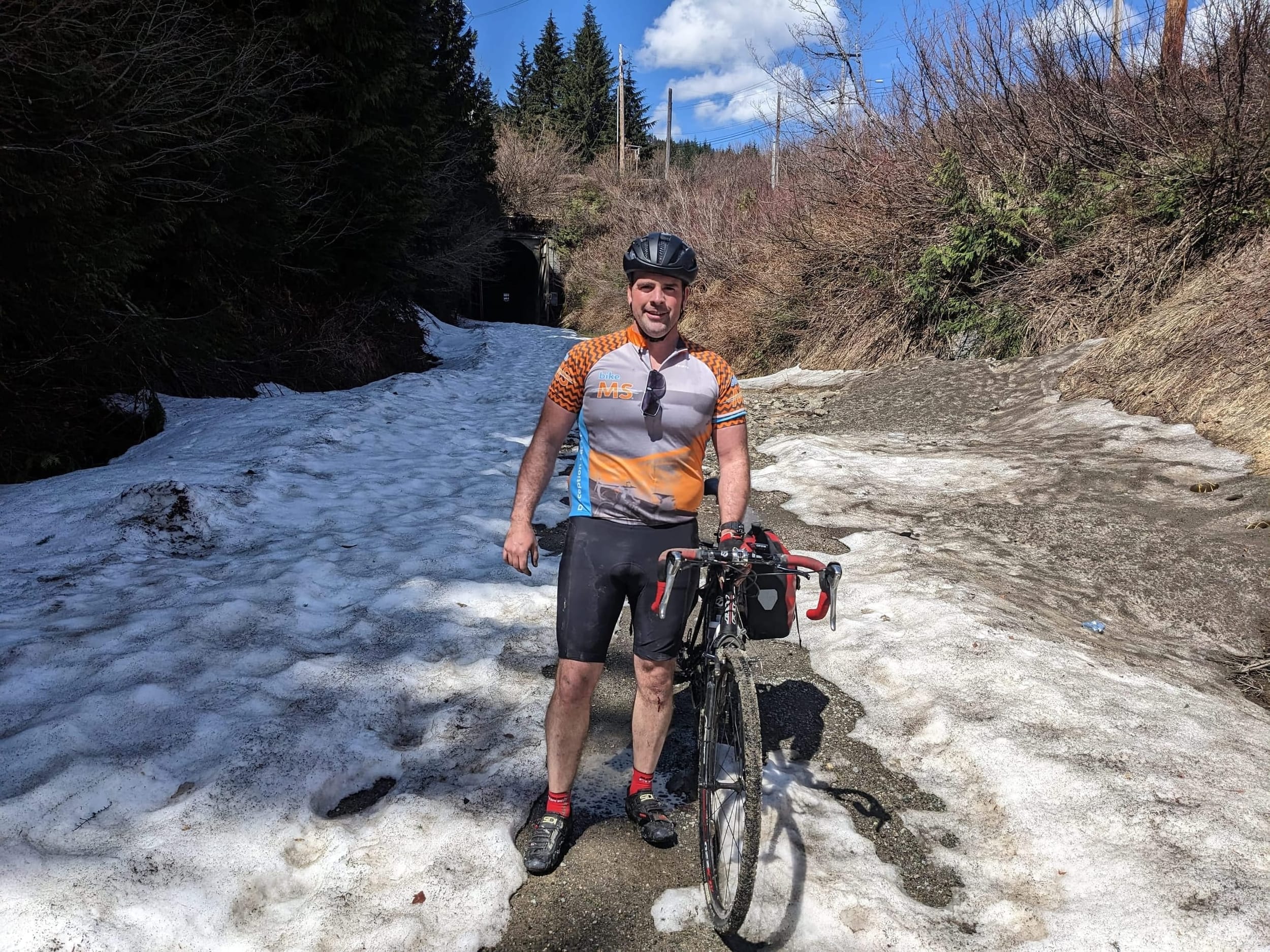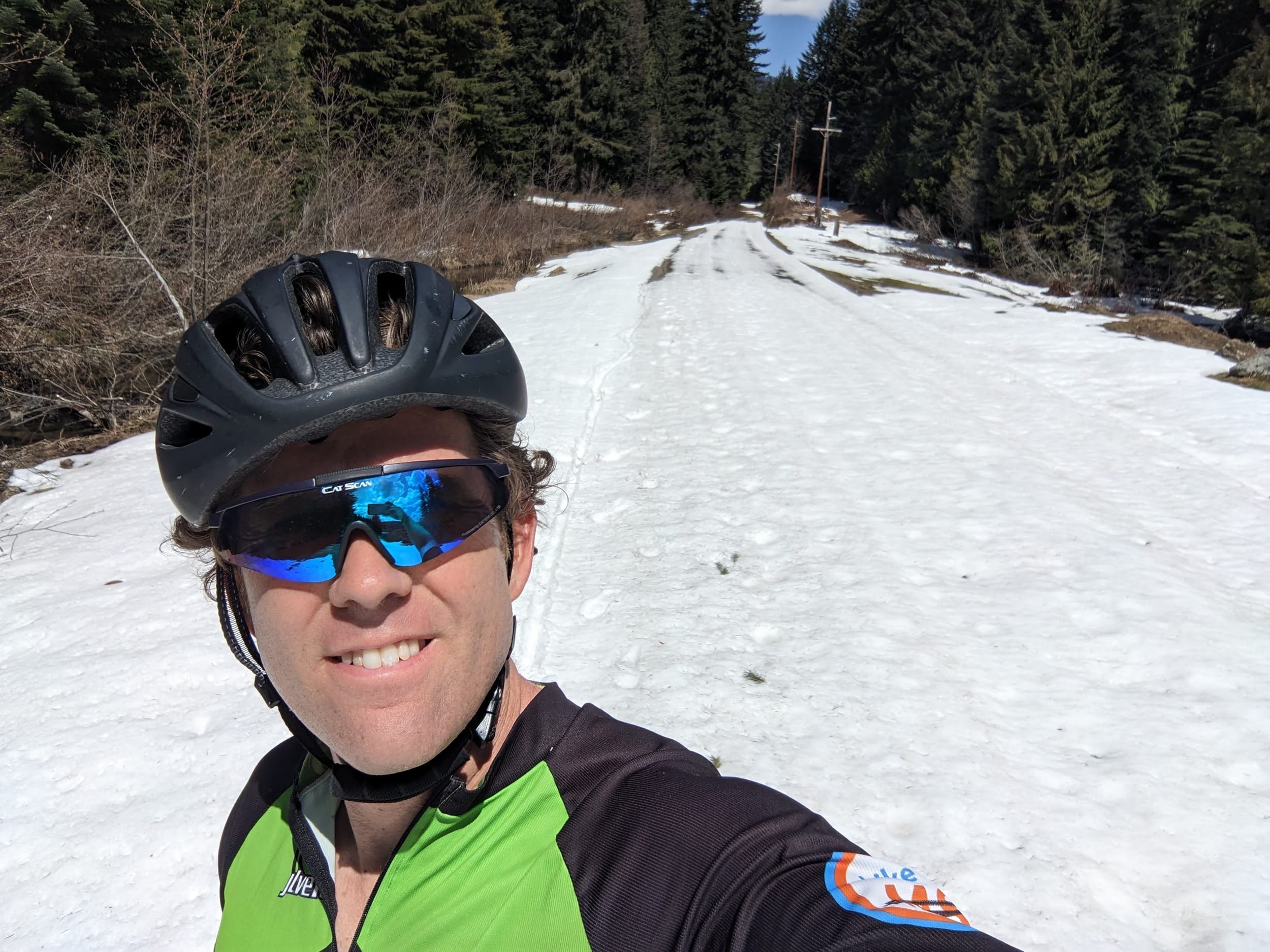 Our next big landmark was about 20 miles into the ride, the Snoqualmie tunnel. I talked about the history/tunnel itself in depth in my last post so I won’t repeat, but this time we had a new adventure in store for us. About halfway through the tunnel, the rear axle bolt feel off my bike… again. Thankfully I brought along 3 spares and I was going again soon - vowing to superglue the thing on there when I finished up for the day. Not more than 30 sec later, the derailer broke off of Mark’s bike. As we were basically in the middle of the tunnel, we had a very solemn mile(ish) walk in the dark/cold to get to the other side. When we got to the other side, we found snow! And lots of it!