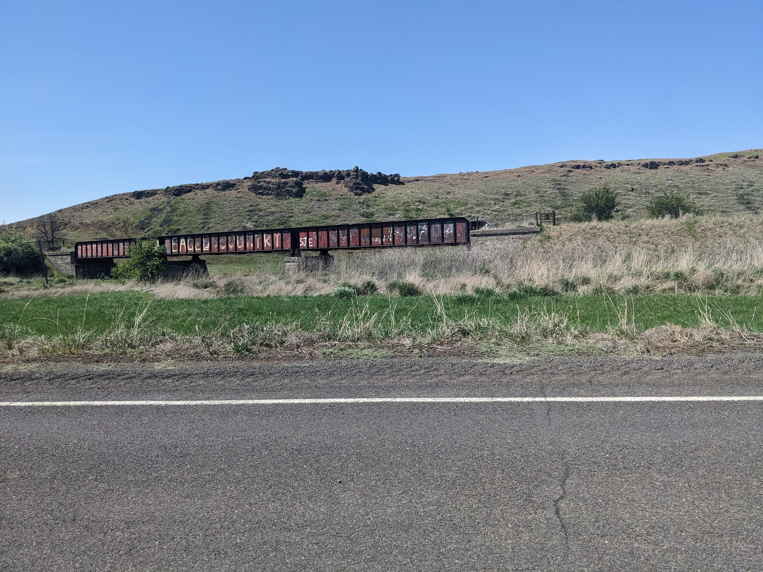 Leaving Lind, we had another good stretch of trail and in about 15 miles we reached Ralston. Right before pulling into Ralston, the trail went over a tunnel with an active railway. The tunnel had they year it was built on it (1914) which implied that it was built when the Milwaukee line went it. We suspected that it was installed to go over an existing rail line, but never followed up on the history. Railway planning must have been a very interesting profession back in the day…