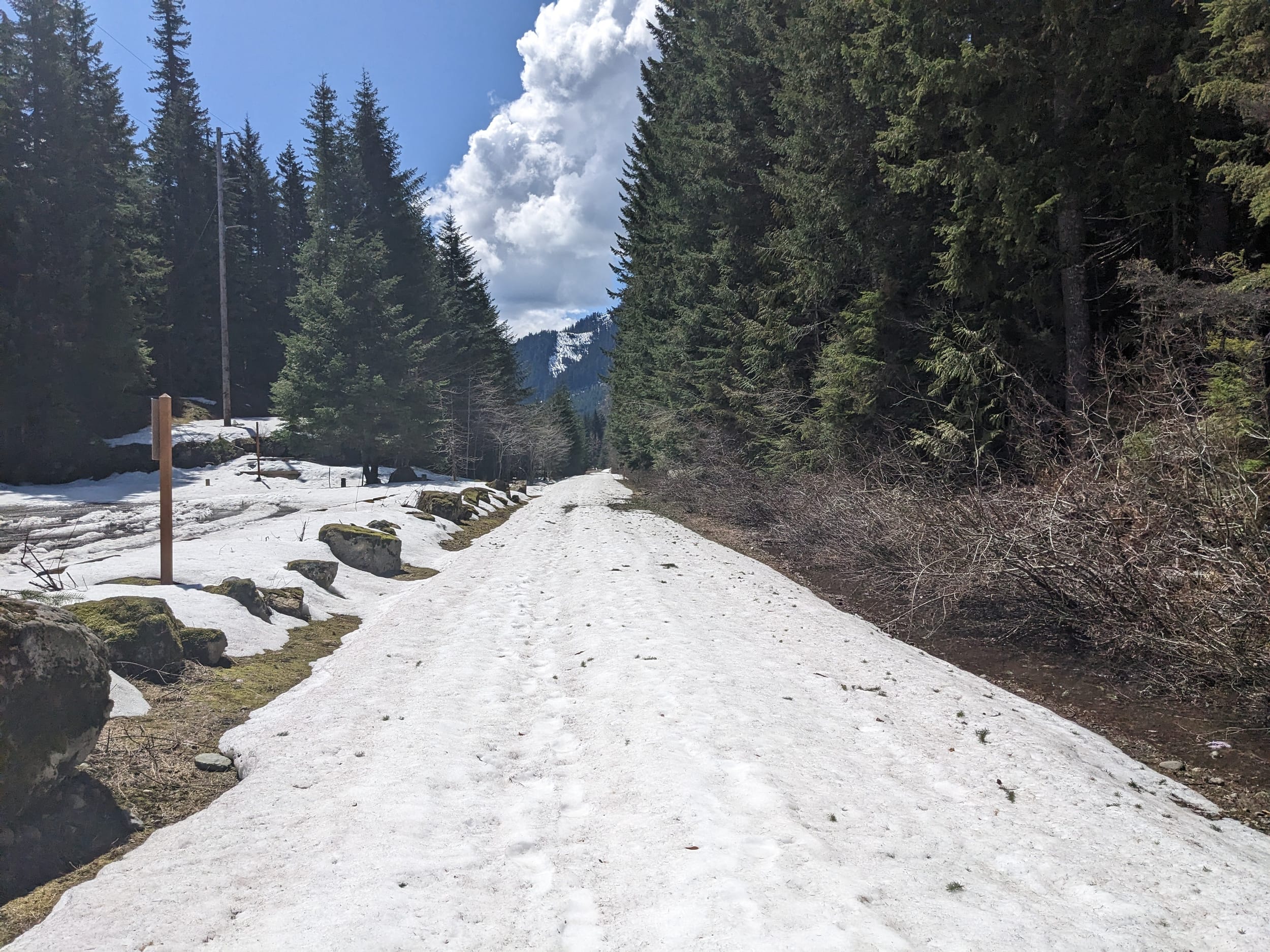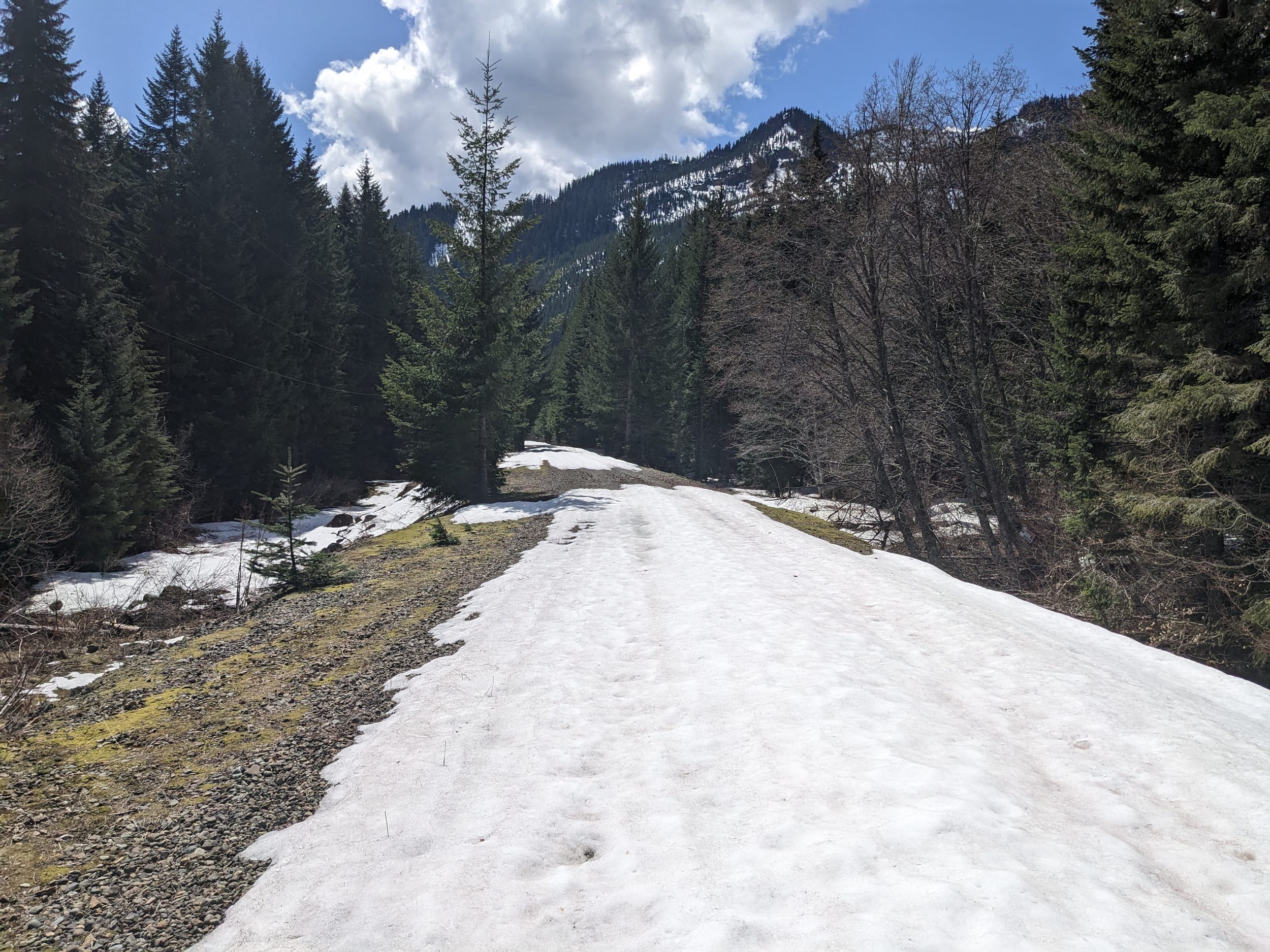 I continued for a bit and found a lot of snow - several miles of it in fact… The next 10 miles took me over 2 hours and I was walking over relatively soft snow basically the whole way. Every time I finished getting over a patch of snow, I would get 1/8th of a mile (if that) before I hit the next patch of snow. It was quite exhausing - mostly emotionally - and I was glad to get to the end of it.