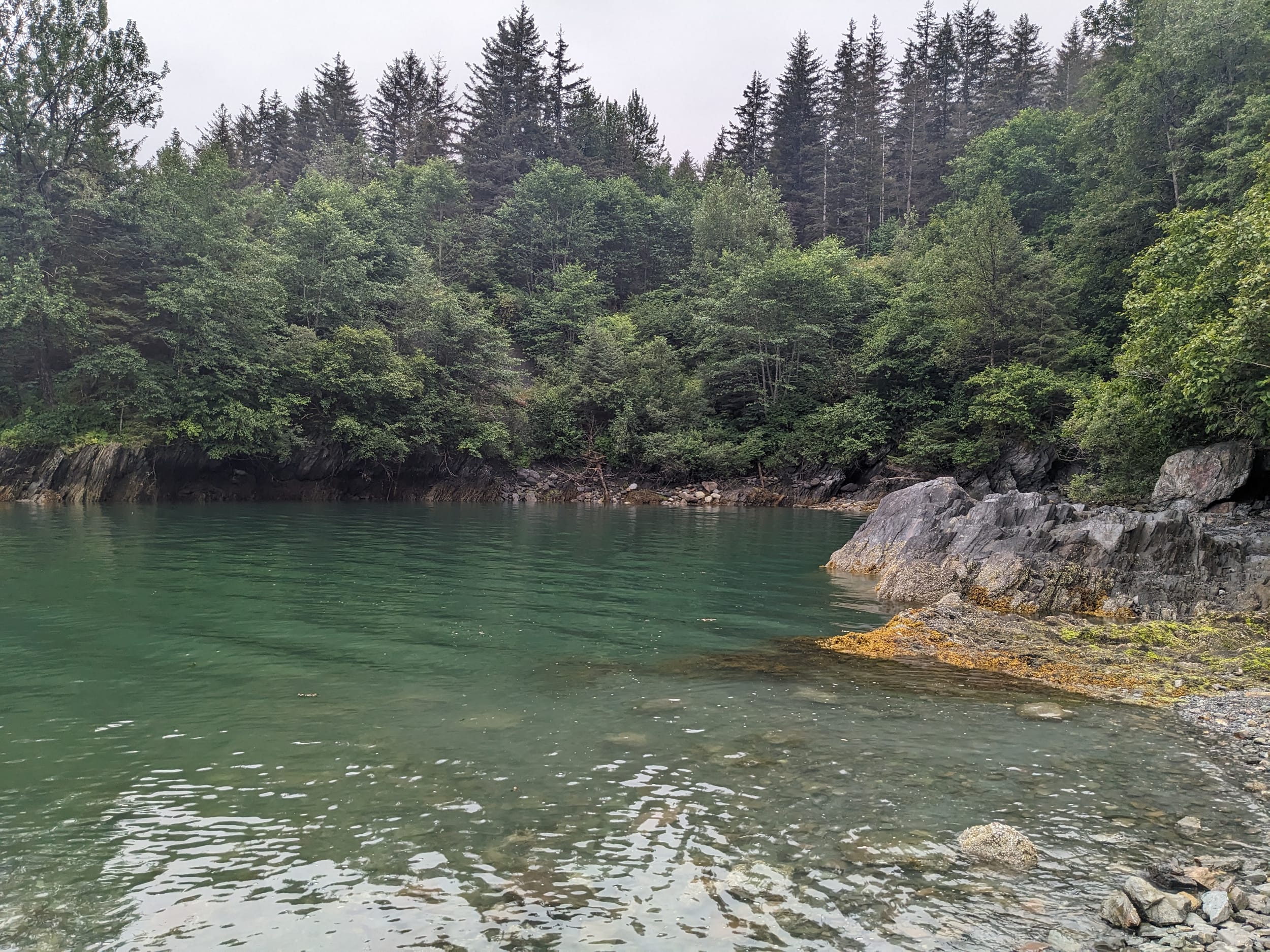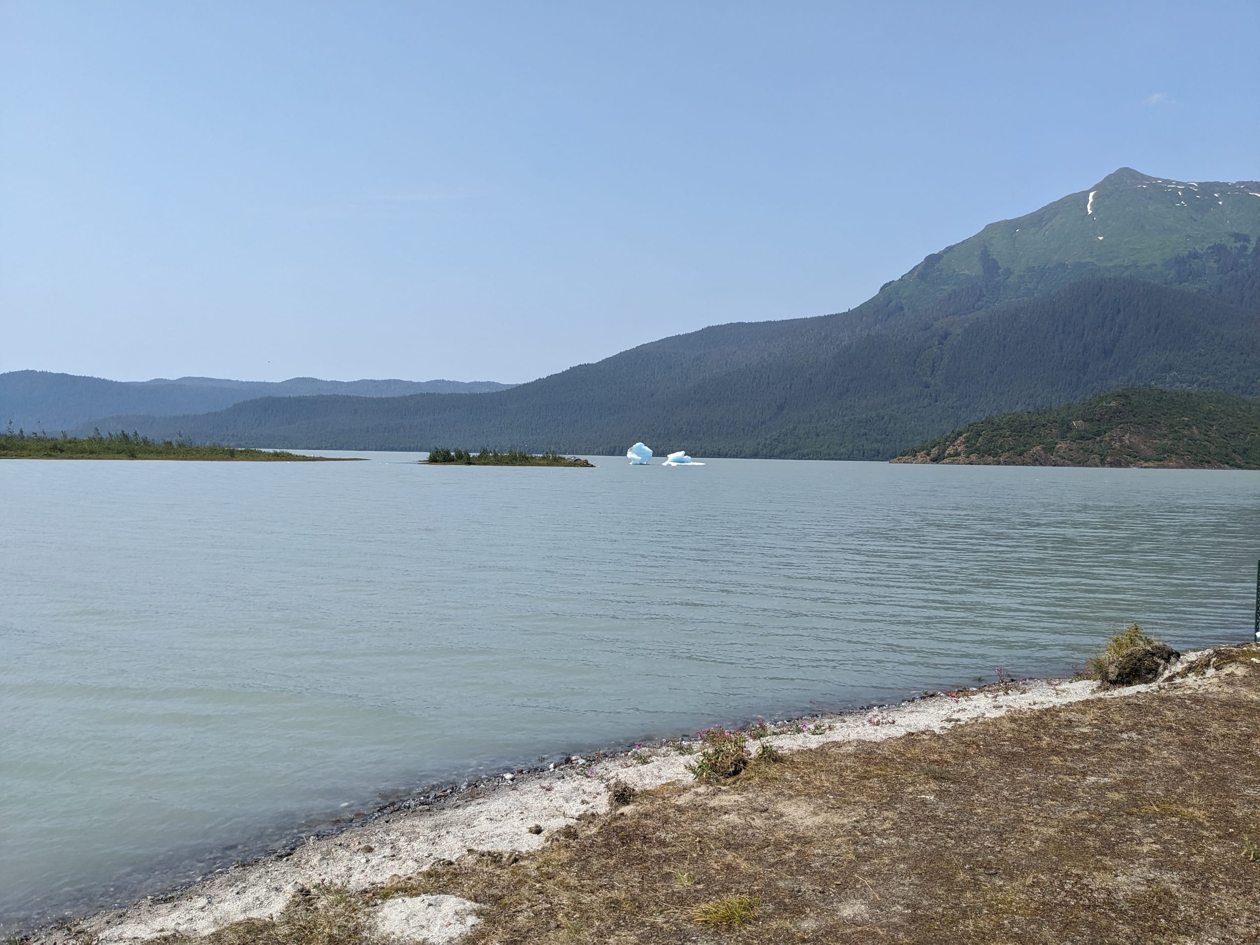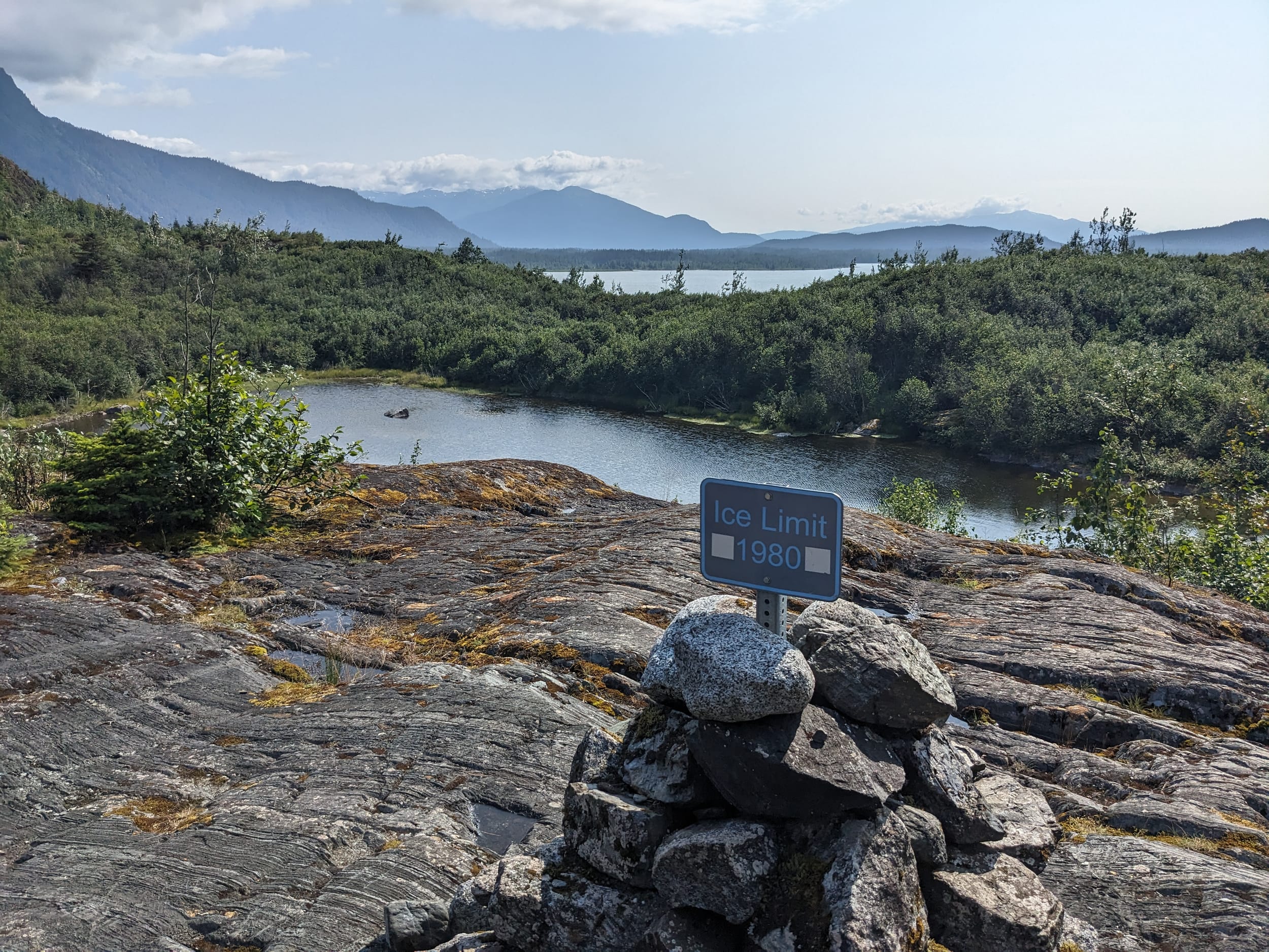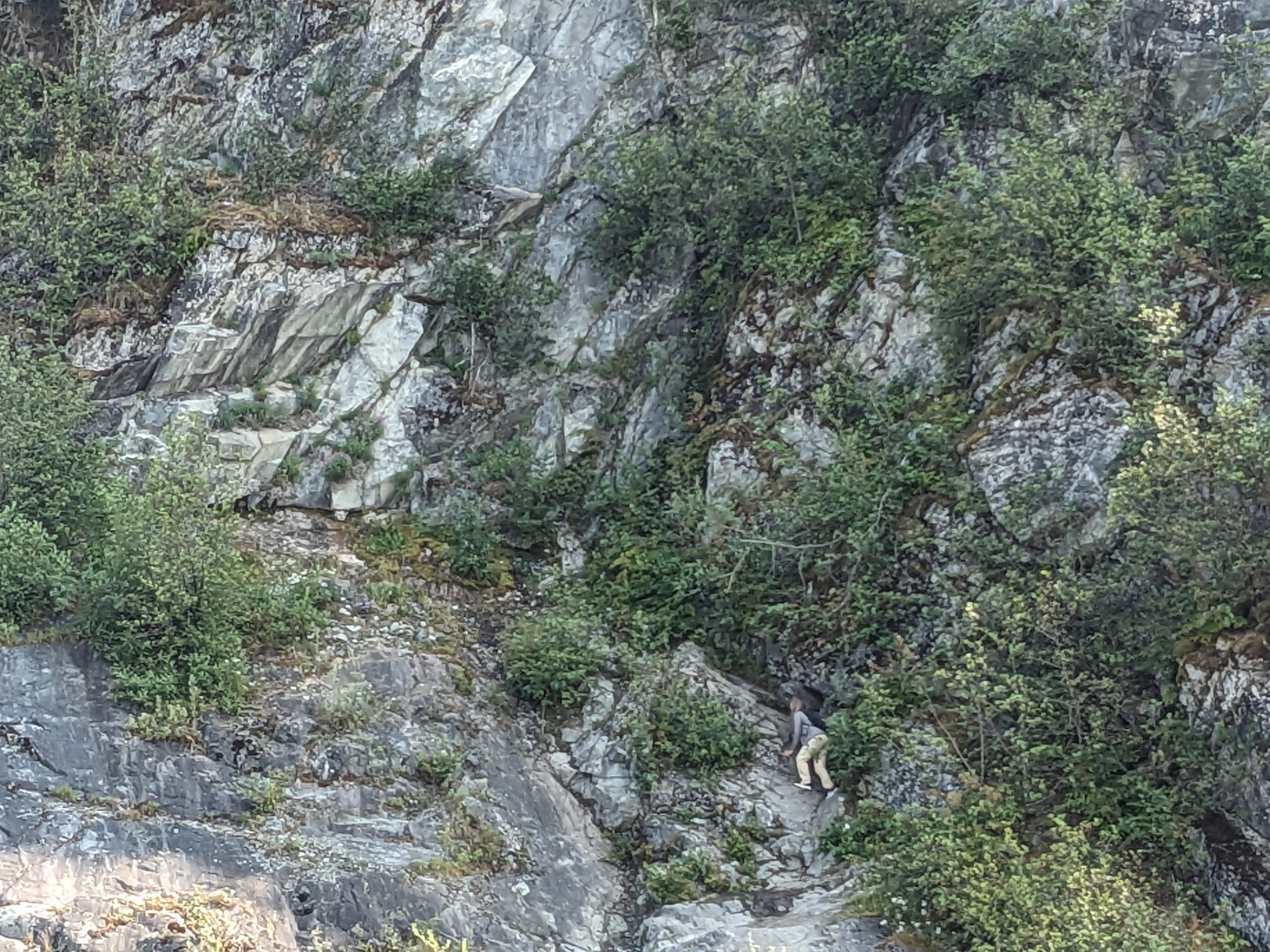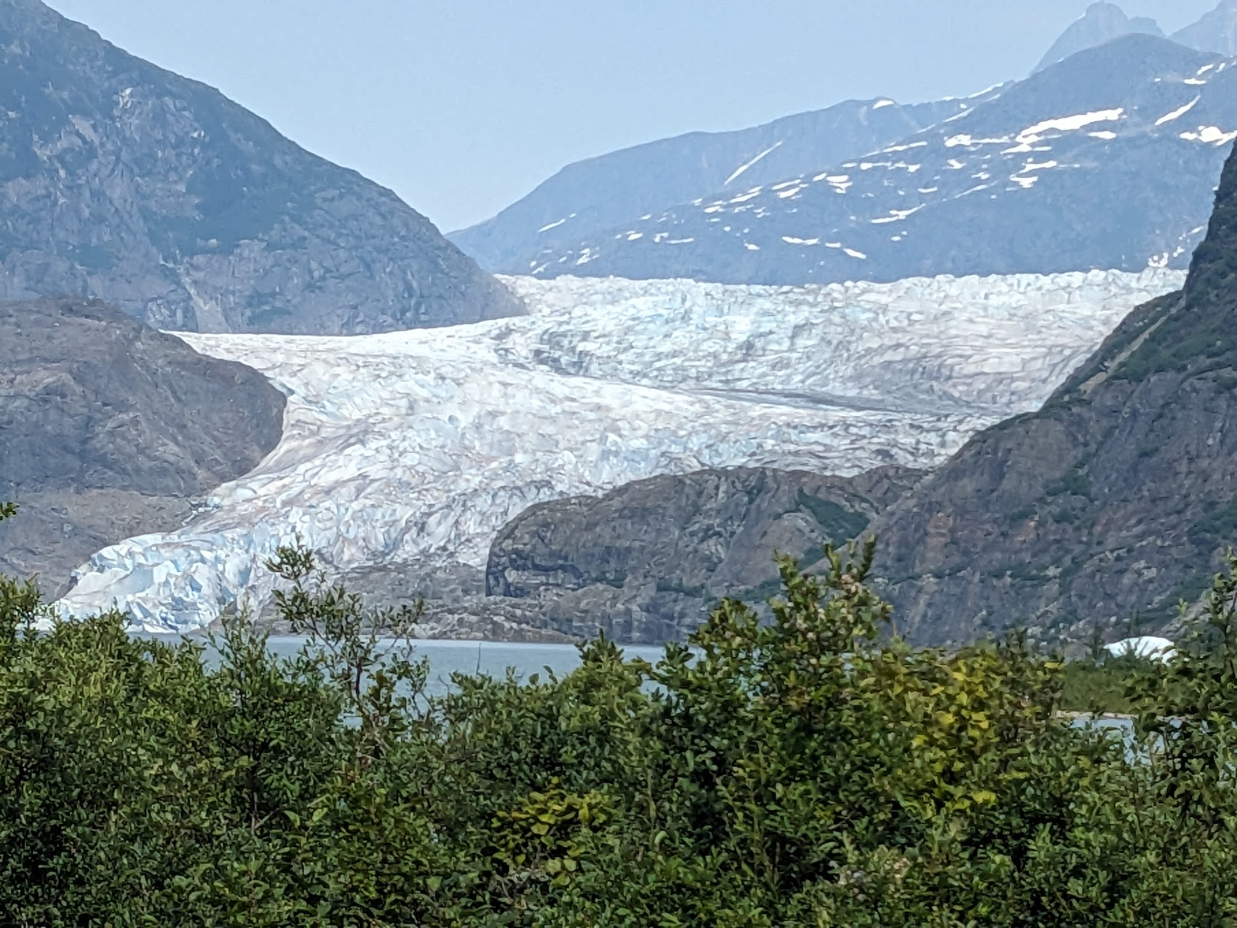 At a little after 1p, we left for another hike. This time we headed back to the Mendenhall Glacier to hike the west side of the lake up to the glacier. This side is far less built up, only a parking lot and a trail. We could tell when we got there that this was still a tourist destination - there were “adventure” tour groups leading hikes, canoe trips, rafting trips, mountain bike trips, etc. This unfortunately meant that the trail was reasonably crowded, but the trail was also quite strenous - so not to many folks braved it even with a guide. We hiked about 5 miles in all - up the West Glacier Trail and then on the fork for icy caves (the icy caves melted in 2016/2017 in glacier receeding, but the name remains).
