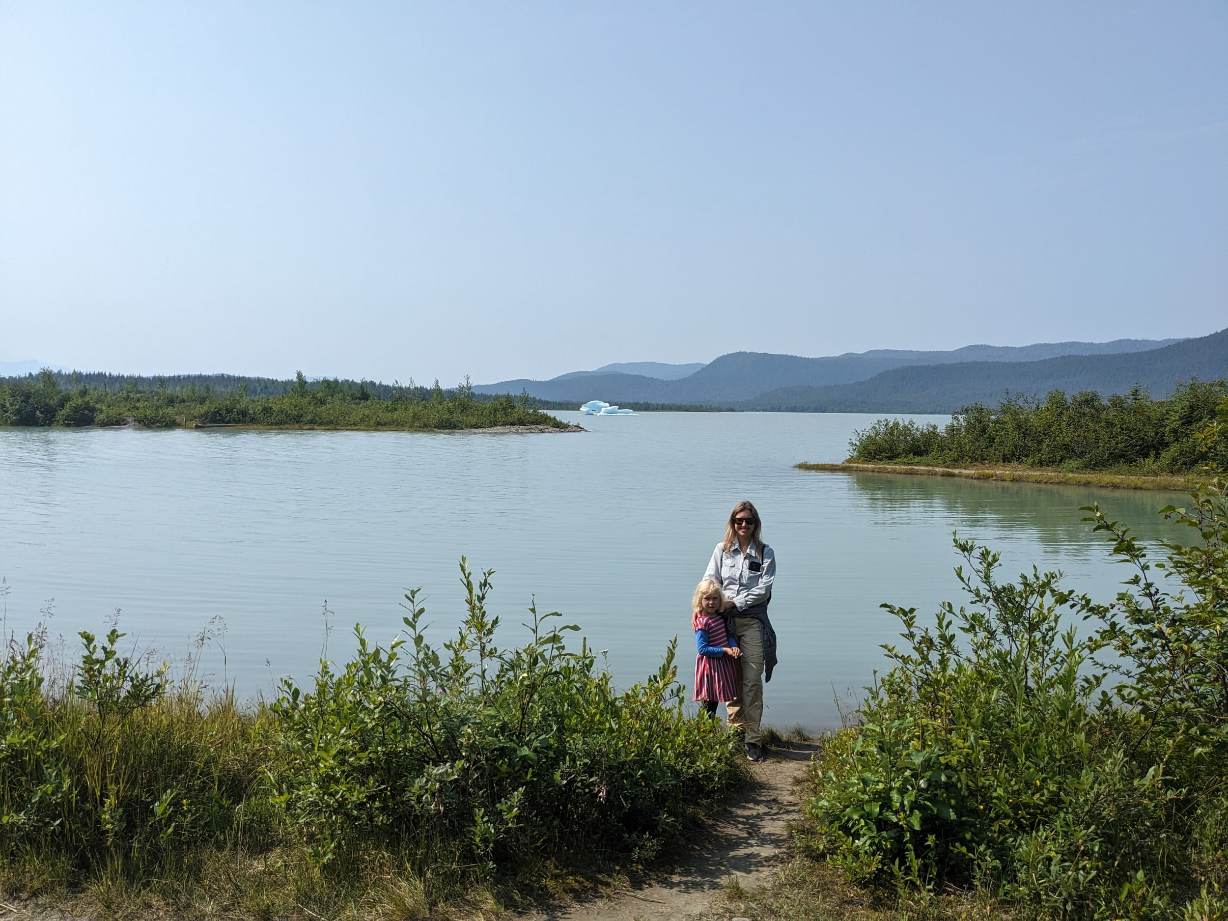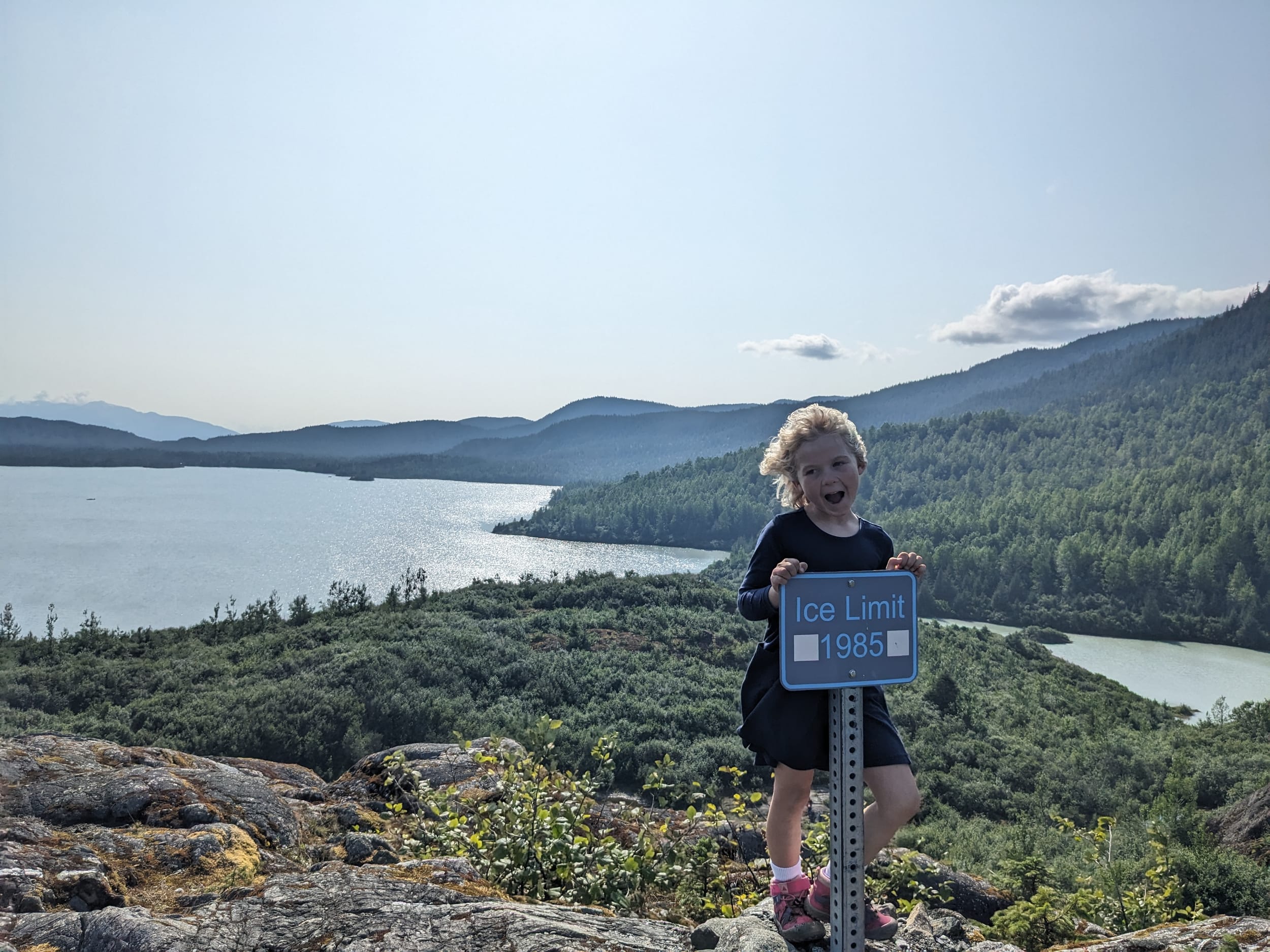 The trail got a bit muddy and Angela turned back - Sara was up for an adventure so we kept going another half mile and, after a bit of a scramble up a small hillside, found a spectacular view of the glacier. We saw two guided groups at the top, both were very proud of Sara for making it up the scramble. One of them offered to take our picture and the other offered to let Sara touch some of the glacier ice - one of them had brought some of it up from the water to show their mother when they got back (hopefully it will last!). The view made it all worthwhile:
