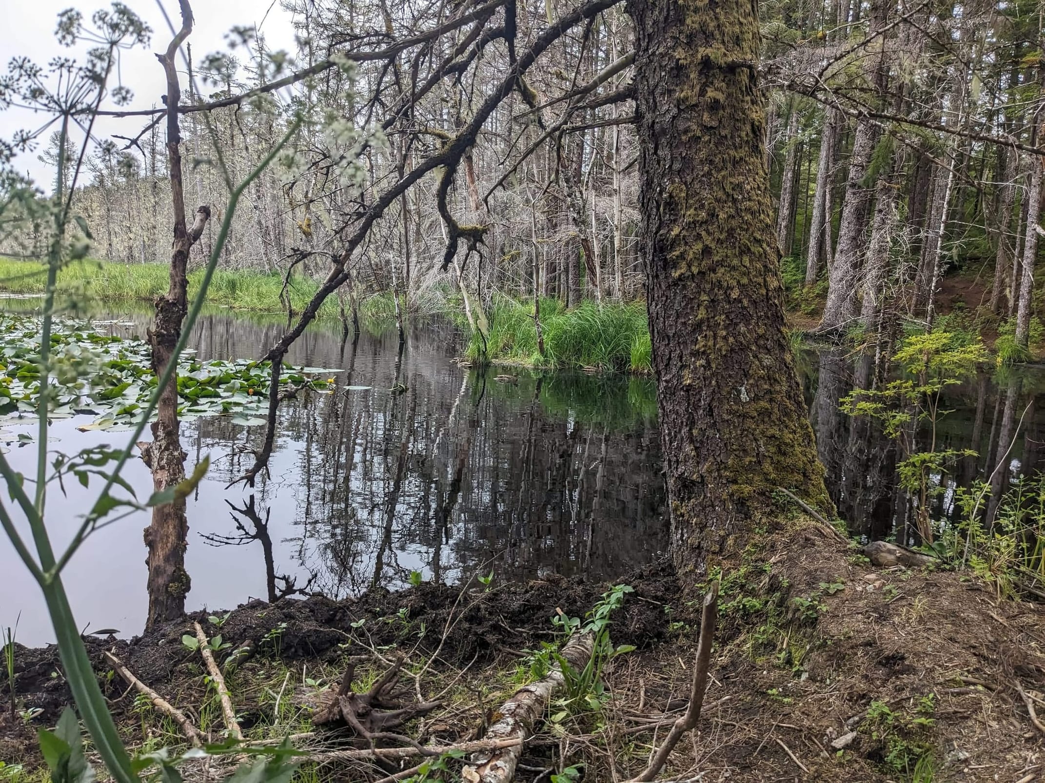 The trail went through a large bog - which is apparently somewhat unique in Alaska to this part of Douglass island. The area was heavily dammed by beavers and the trail was flooded in numberous places by their antics. Fortunately we fould a way around the floods and sayed relatively dry.