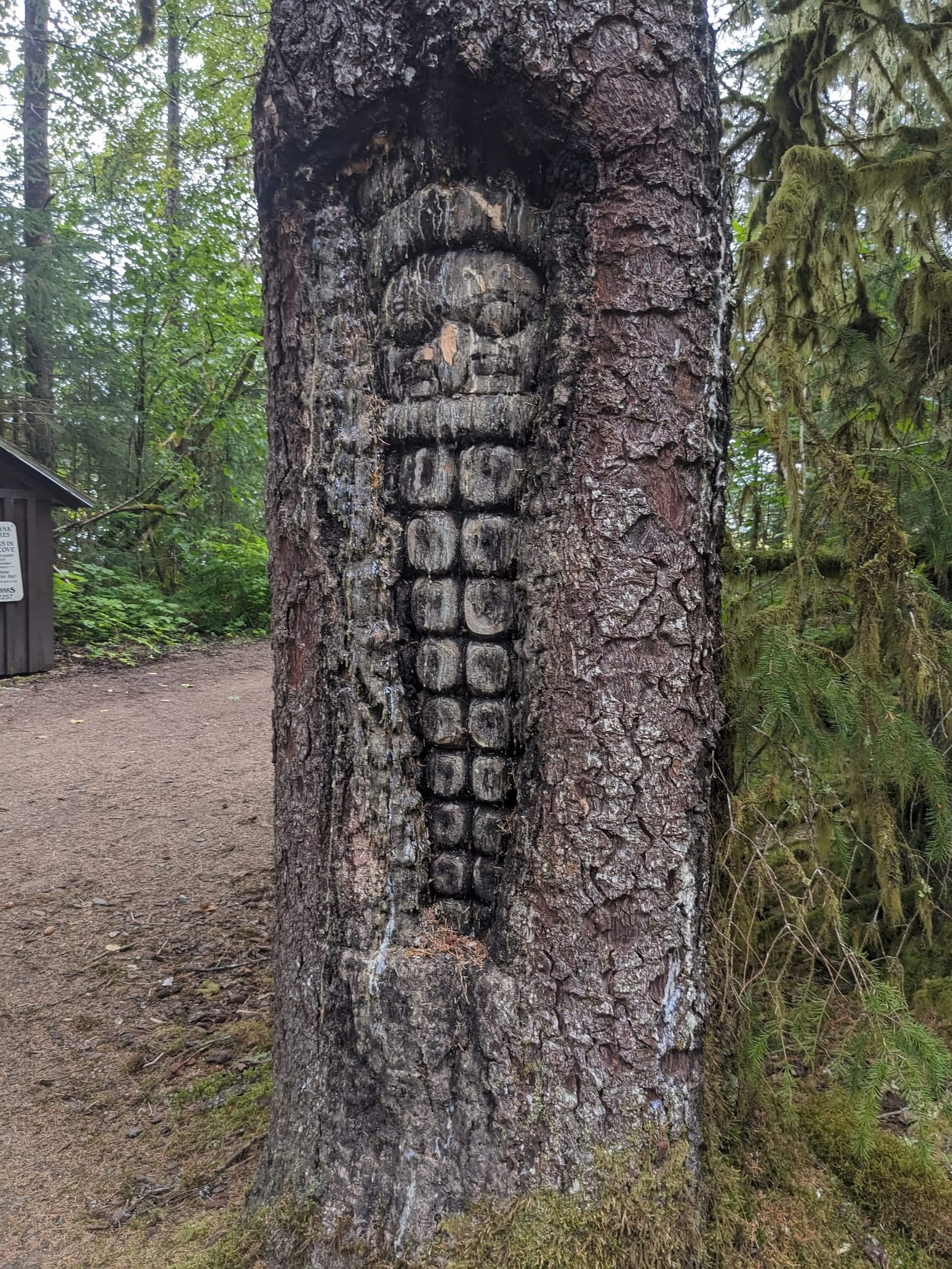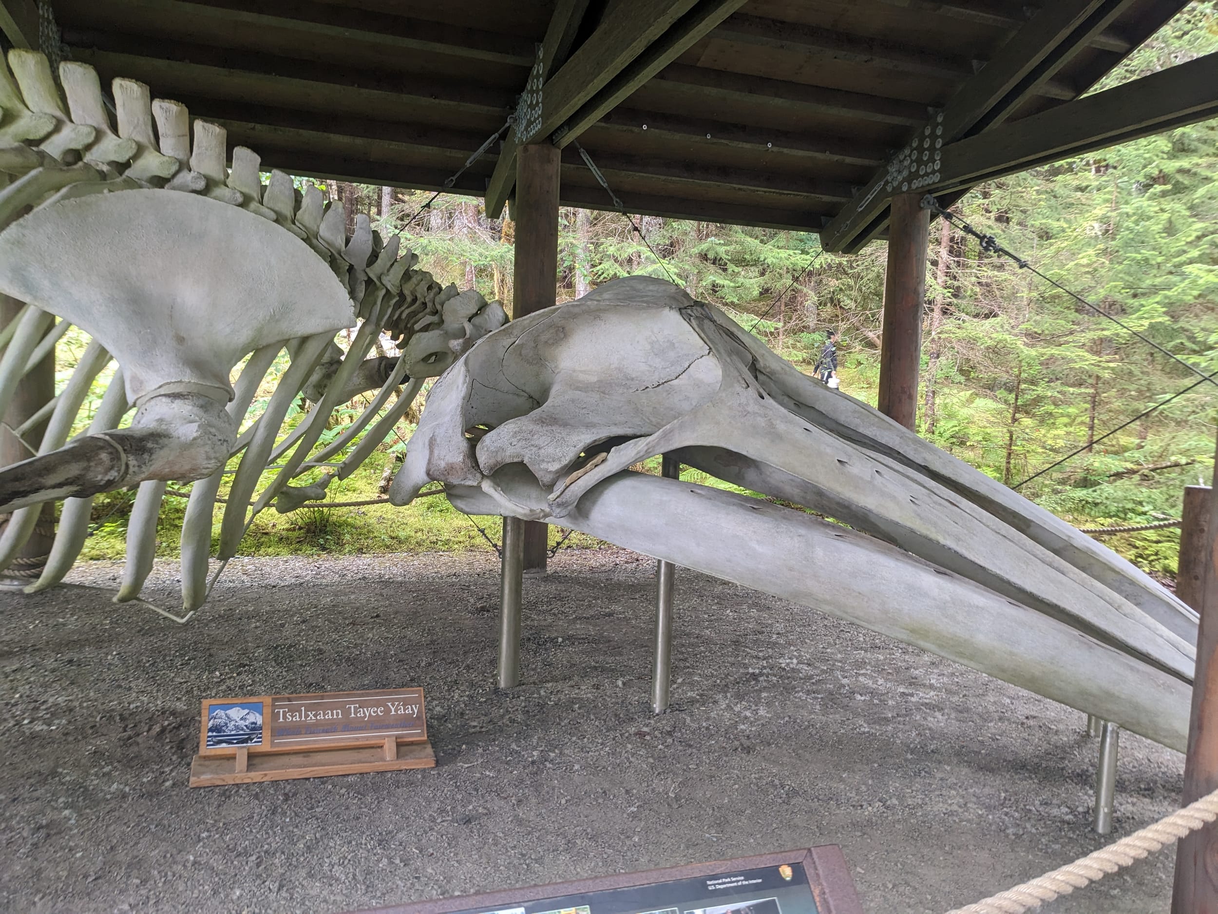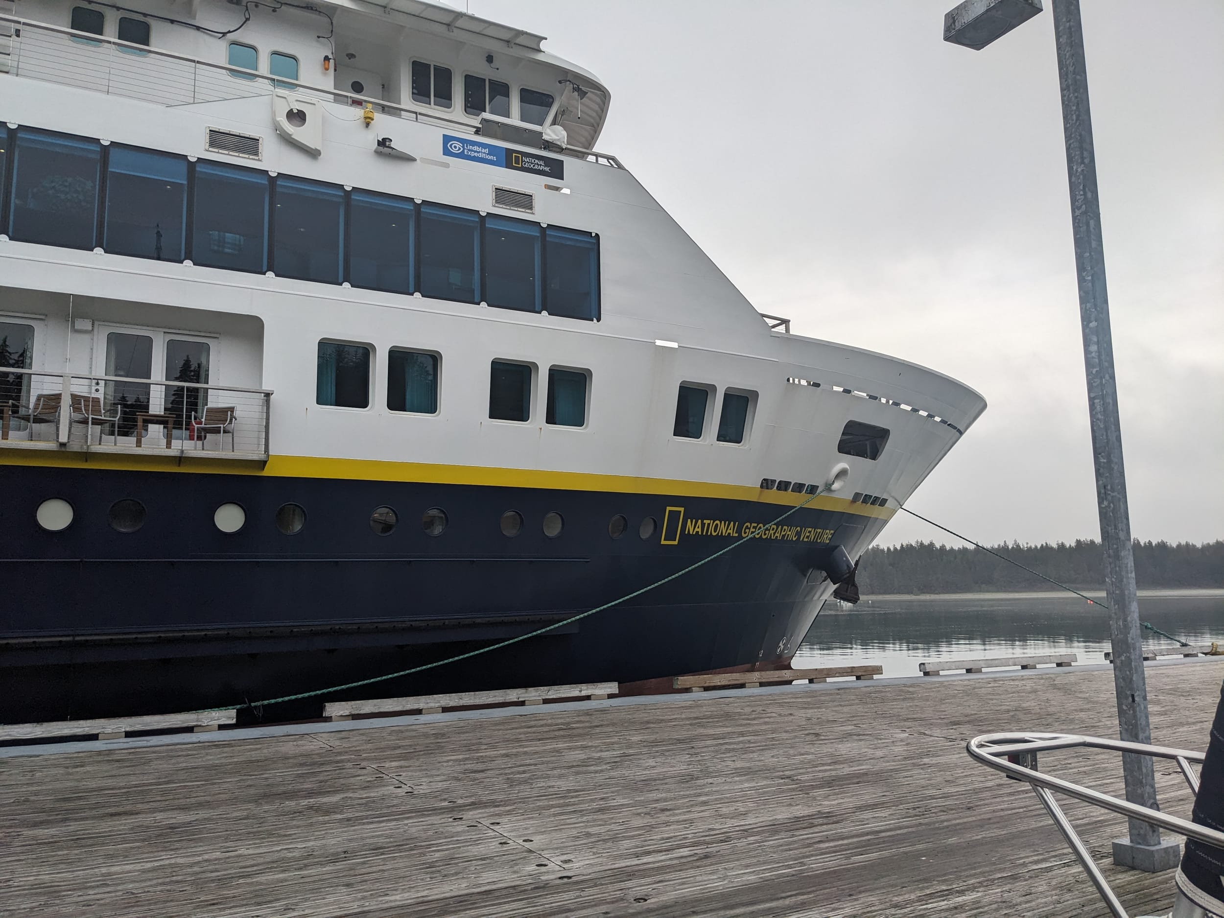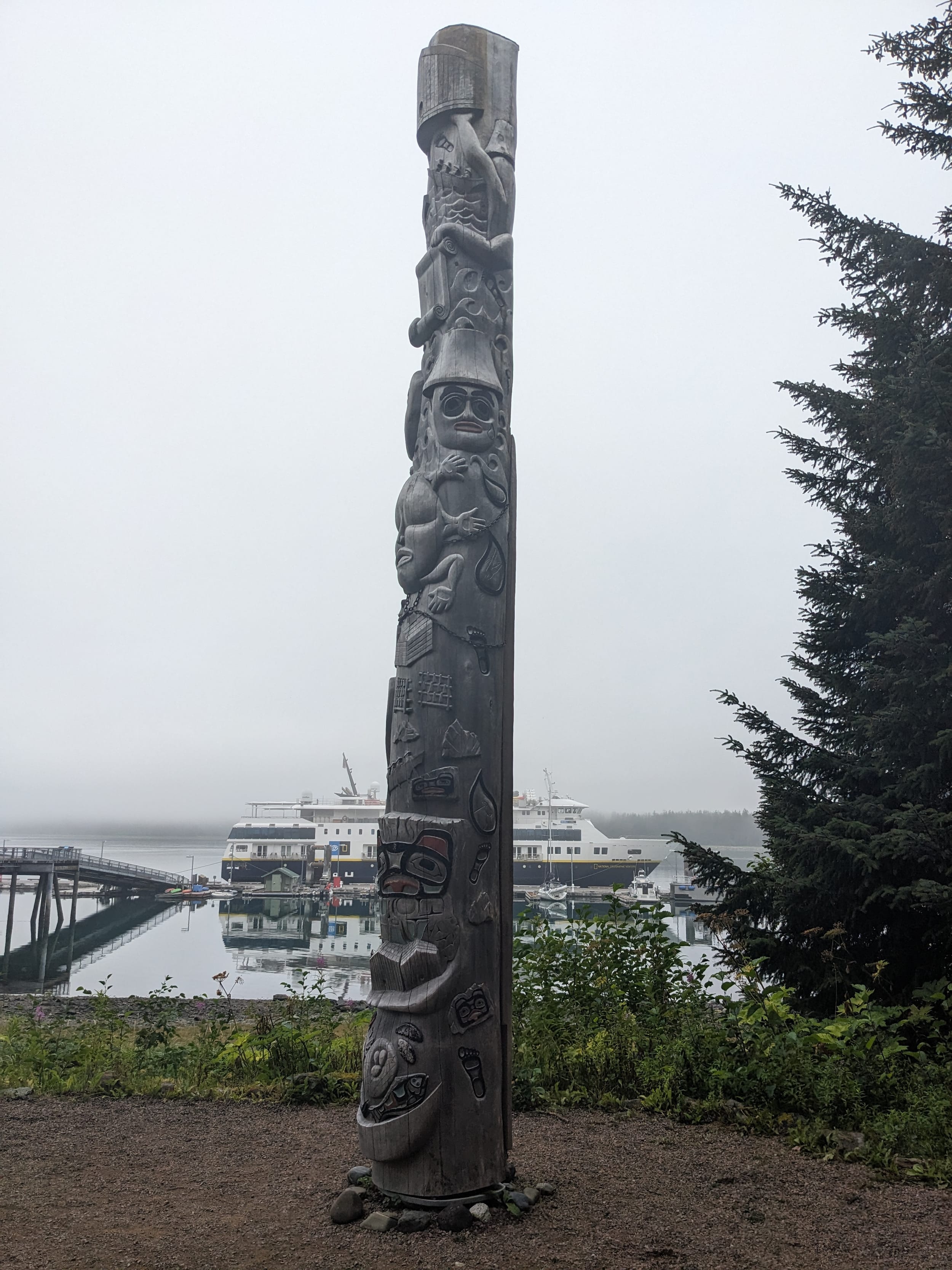 We spotted them on AIS, but the Nat Geo Venture was at the dock when we arrived - the same one we saw in Juneau several days ago! We got our pictures at the dock and headed in for the briefing. There were several fun artifacts - a toten pole, some tree art, a traditional canoe, a whale skeleton, and the Glacier Bay lodge - which looked like one of the nice ones. The lodge also had wifi - so though it would be a good time to post this. Next post will cover all of Glacier bay - the big one!