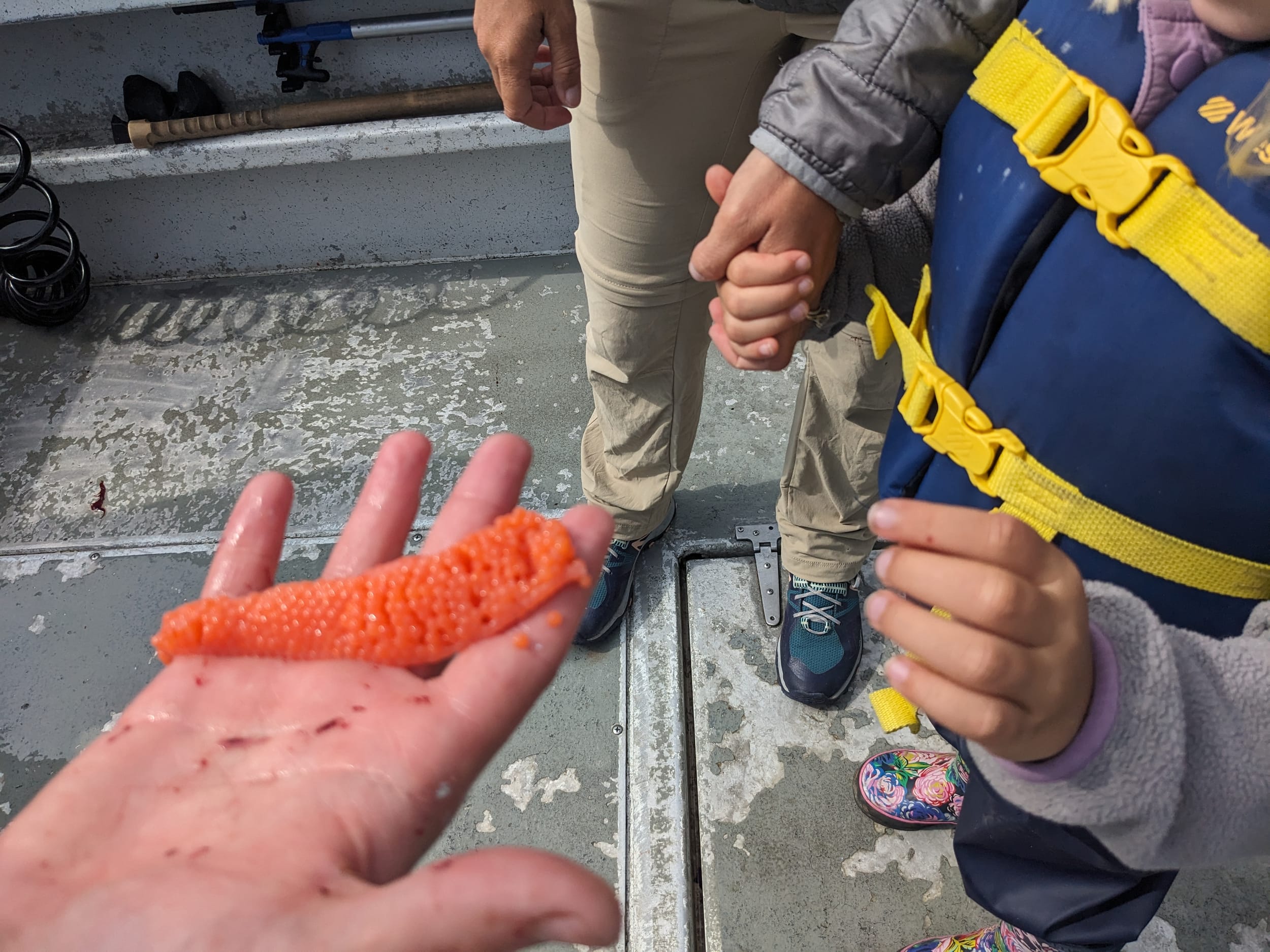 Fishing was an experience. Neither Angela or I realized how busy/active the whole process is. You put out the downriggers and clip the lines to it as it goes out and that takes a couple of minutes - after that I thought we would be waiting a while, but we immediately started to see some of the rods pop up (which means there may be a fish on) and we started relling them in. Most of the time it was nothing, so we would start the whole process over again. It was exhausting for the crew and us. But it was worth it - 3 huge Cohos. We kept the smallest one and shipped the other two back home. Even the smallest one is a lot of fish - we have enough Salmon for at least 3 days. Sara got some 1:1 time with the captain on the way back and asked every question she had about fishing. When they cleaned the fish on the way back, we got a chance to taste the salmon roe - which is delightful on sushi and only ok when eaten fresh/plain.