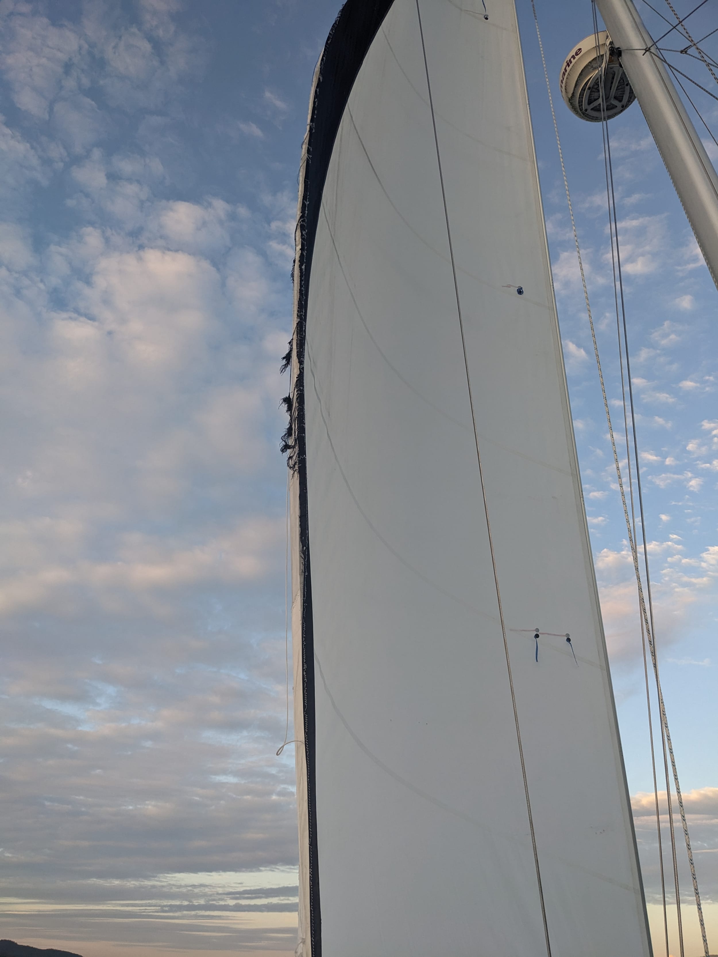 We pulled out the sail for the first time since it was damaged in Chatham strait. We ended up not being able to replace the sail in Juneau - Catalina Direct did not have any sails in stock and there is an 8 week lead time to make one. Thankfully, the sail was not in as bad of shape as I had origionally thought and it will be usable for our trip back to Seattle.