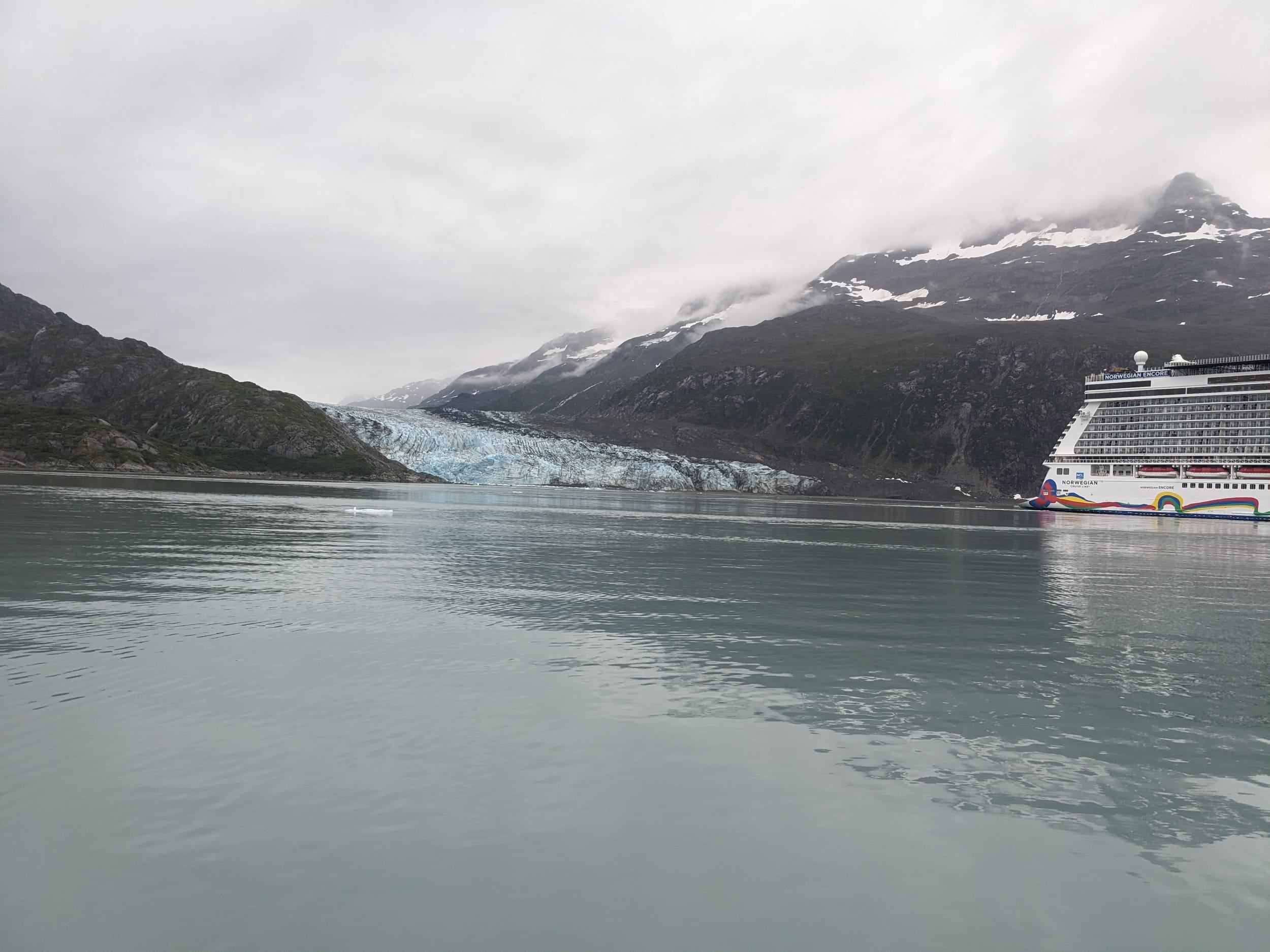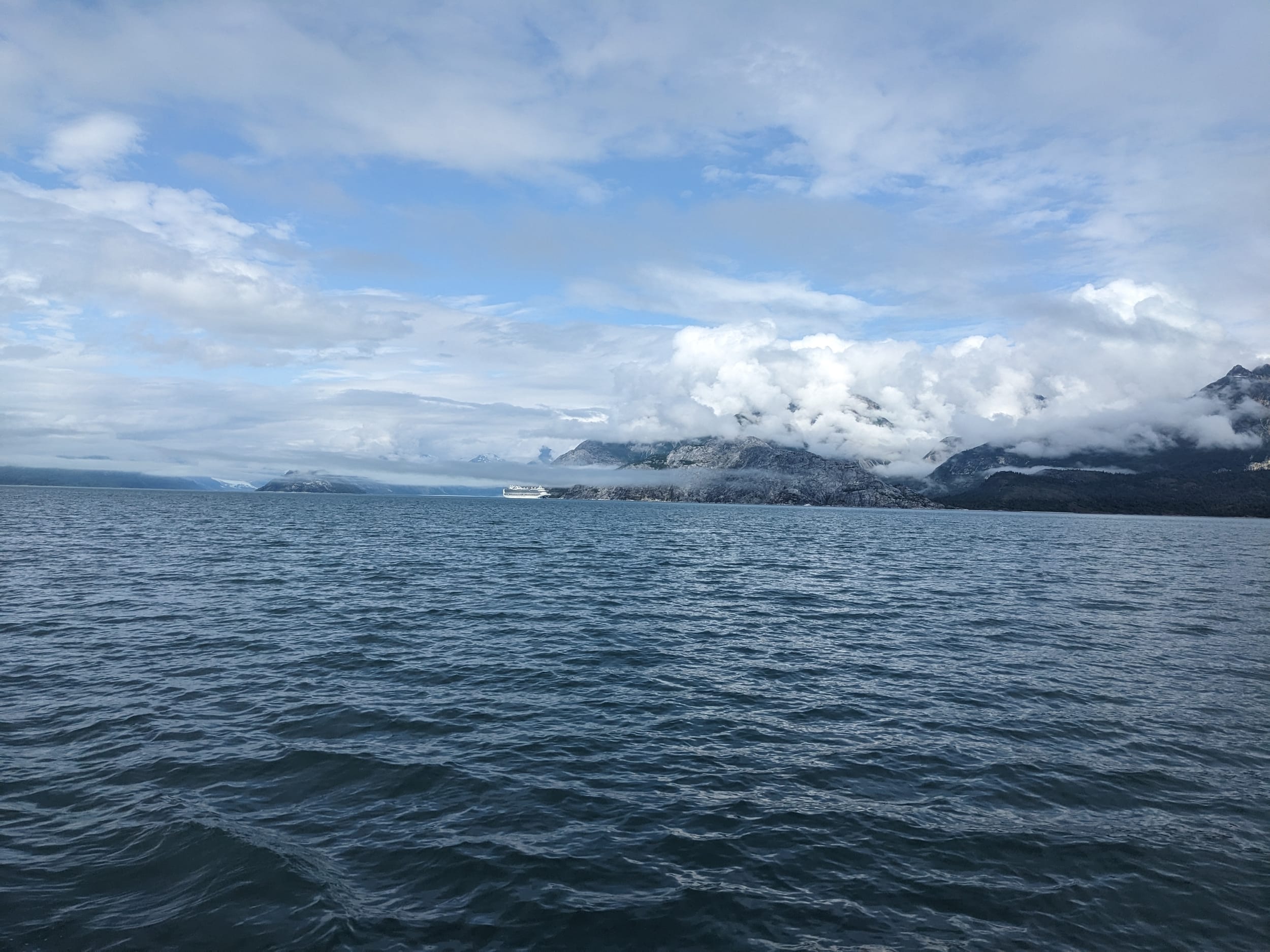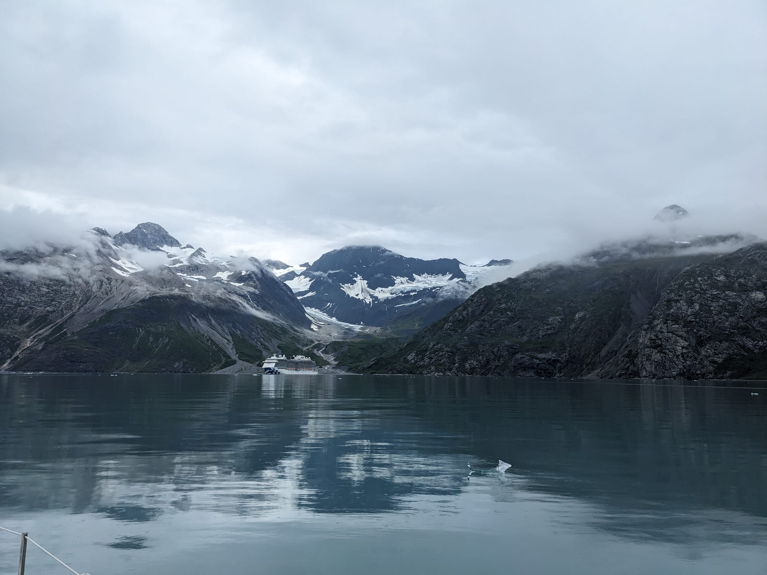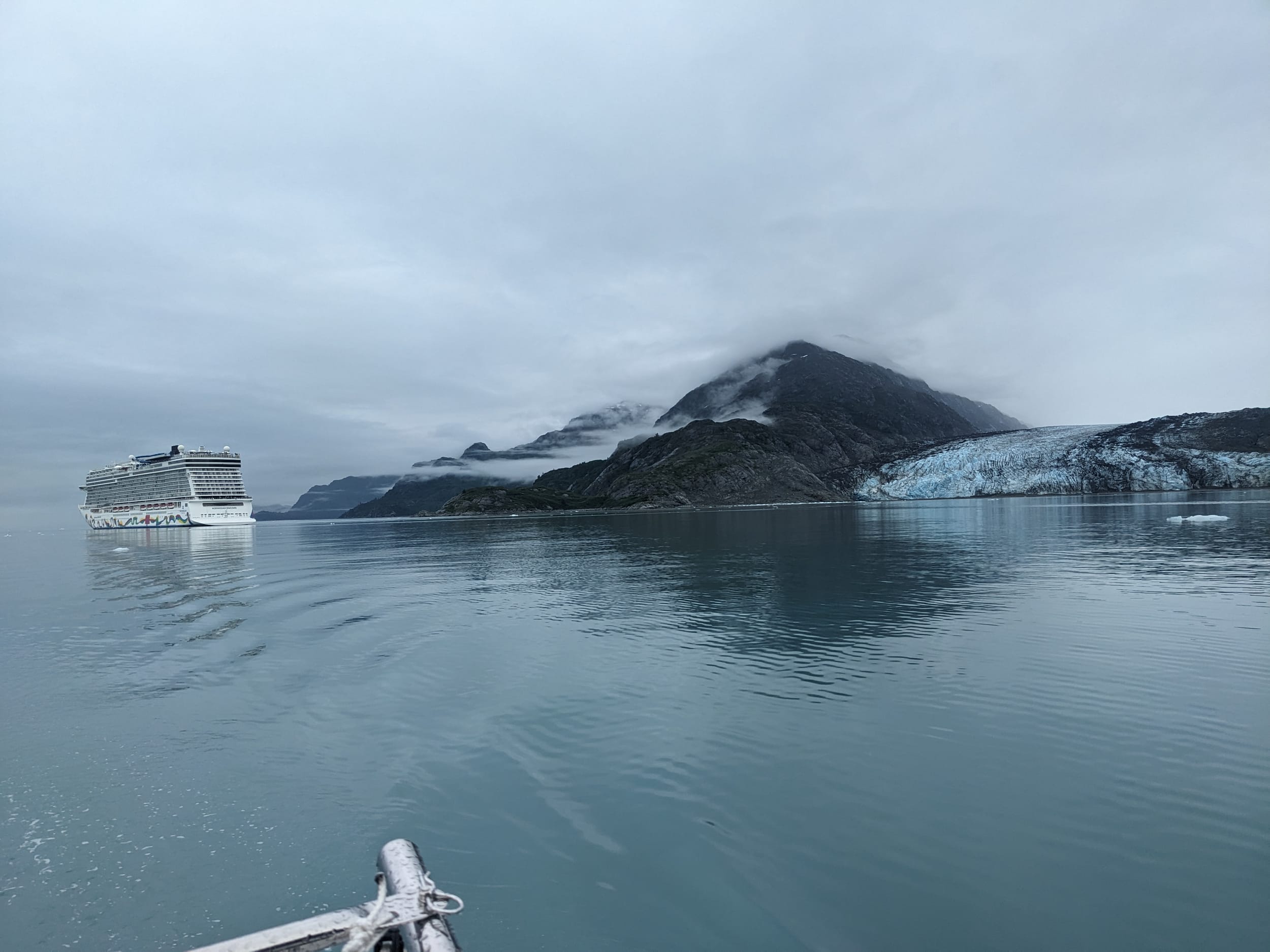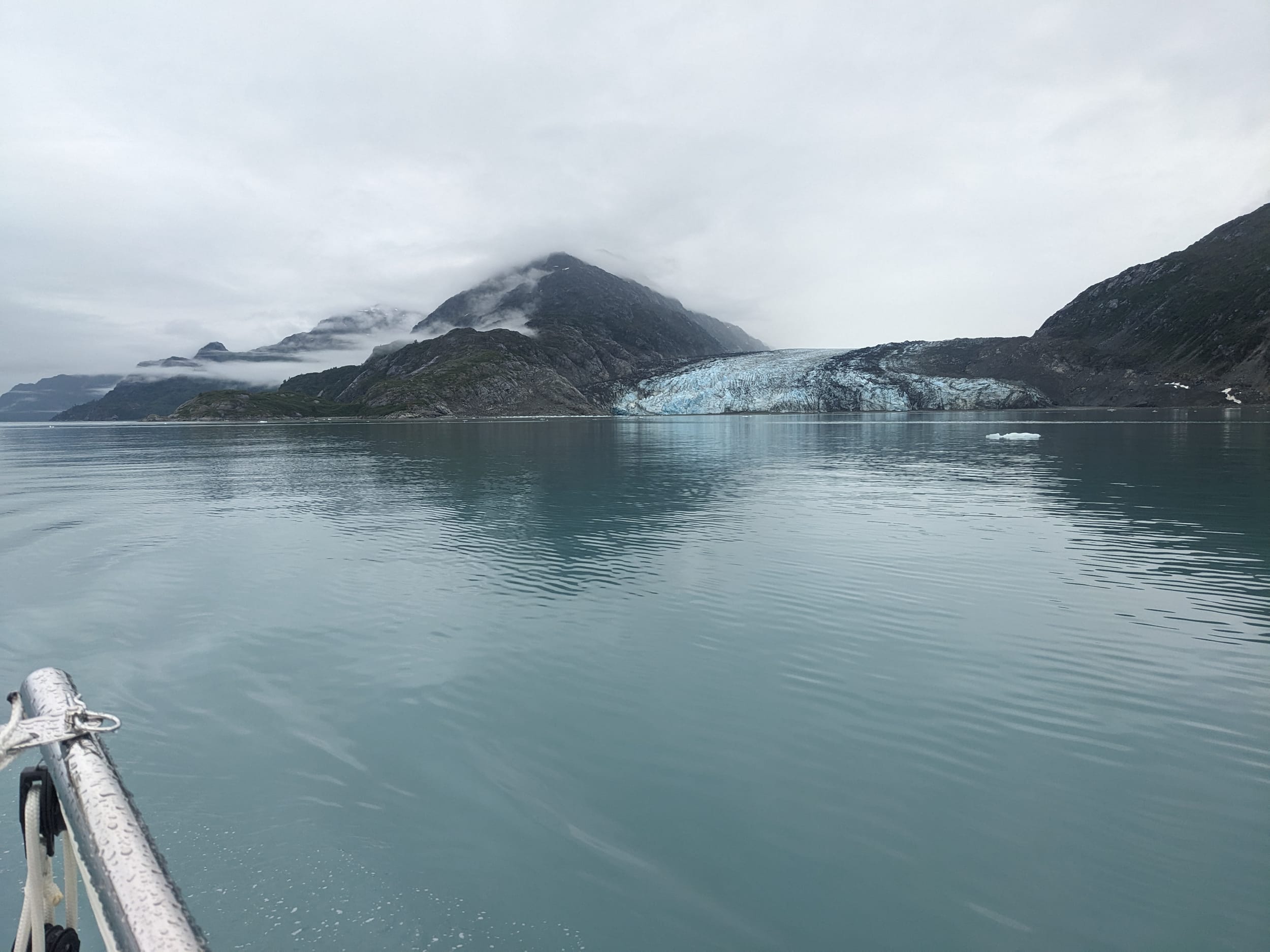 We pulled out of Reid Inlet and were confronted by two large cruise ships - both of which were trying to get into Johns Hopkins. Well, this added a whole new dimension. I flipped over to channel 13 and asked for both of their plans (which they were eager to provide to avoid challenges with small boats) and we were able to navigate past both of them to get into the bay. We must have gotten our pictures taken at least a thousand times - I’m sure we were quite the sight, this little sailboat amongst all of the icebergs. The ships do this interesting maneuver where they go to a location and then they just spin for 30 min (presumably so everyone on the ship can see the view). To other boaters however, this is quite the disorienting maneuver as you have no idea what they are doing - unless you call them on the radio in advance like we did.
