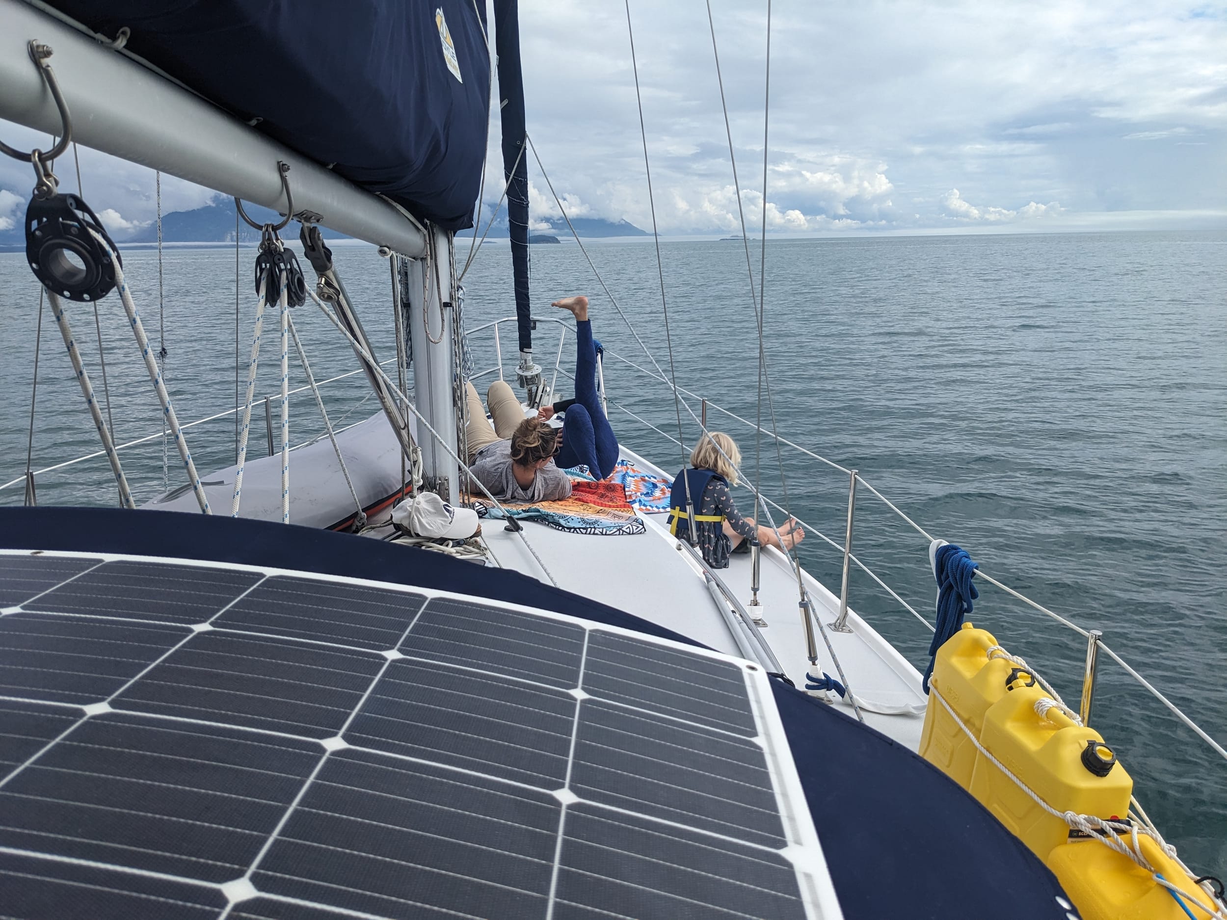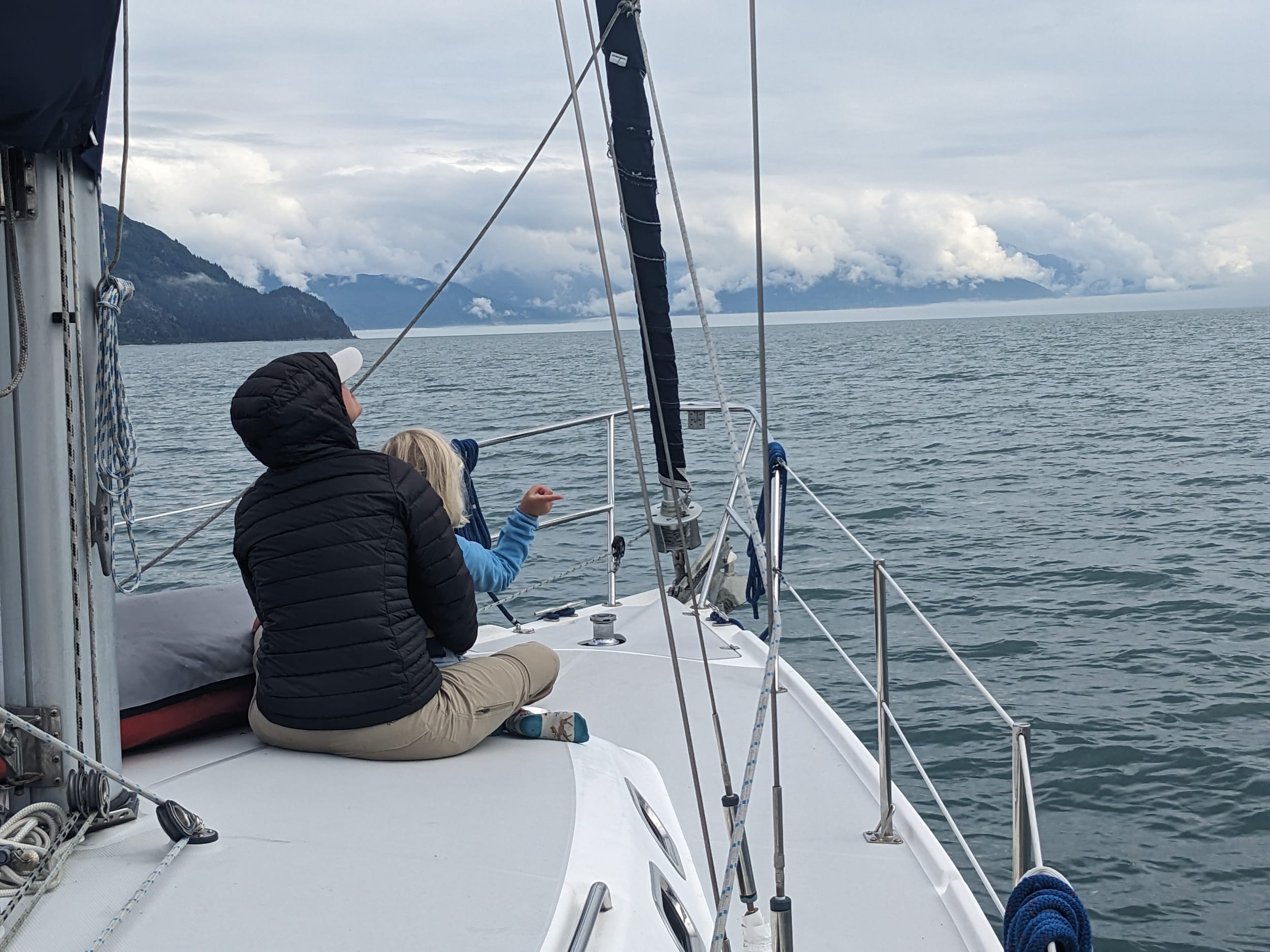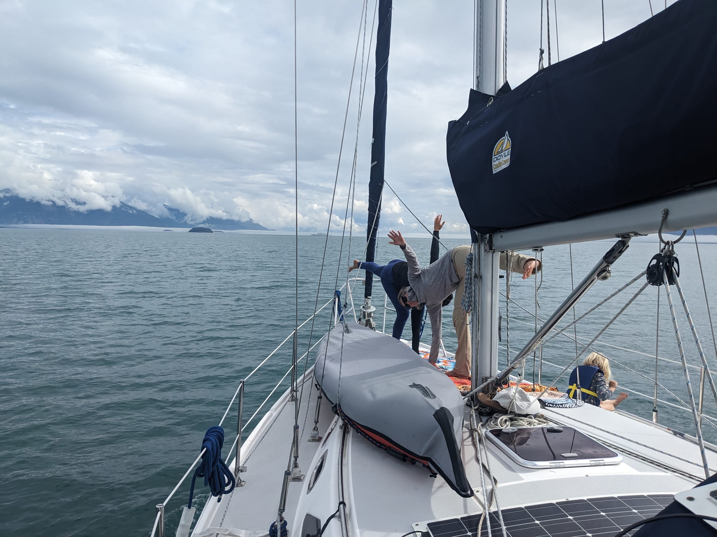 We left our anchorage at Blue Mouse at around 12:30p and made our way across the channel to Beartrack Cove - our anchorage for the evening. It was foggy and rainy when we left, but about an hour into the trip the clouds broke and the sun came out - the first time we had seen it in 3 days… It was glorious! Everyone came out and shed their layers to soak it in. There was even some boat yoga and naps on the bow.