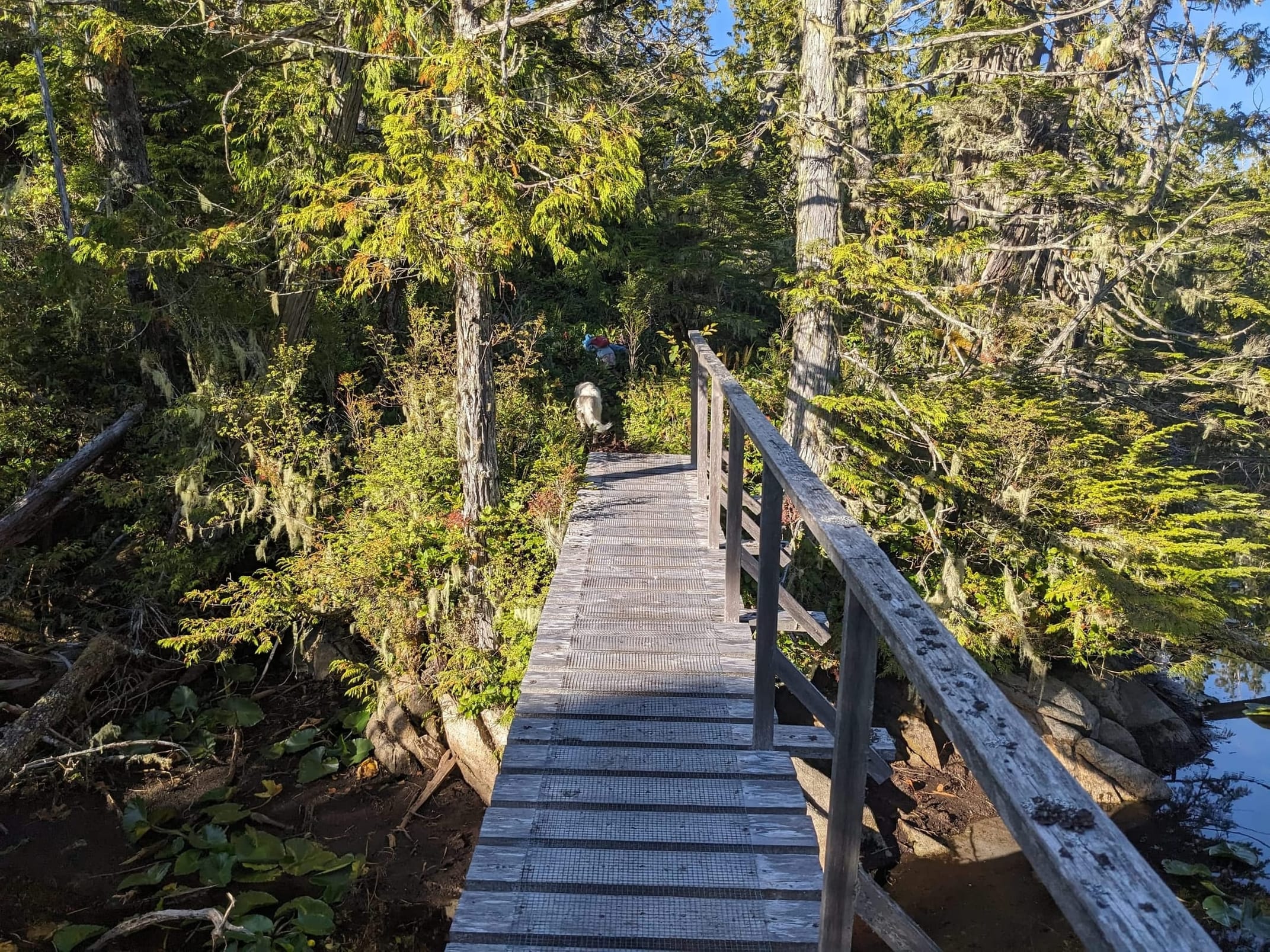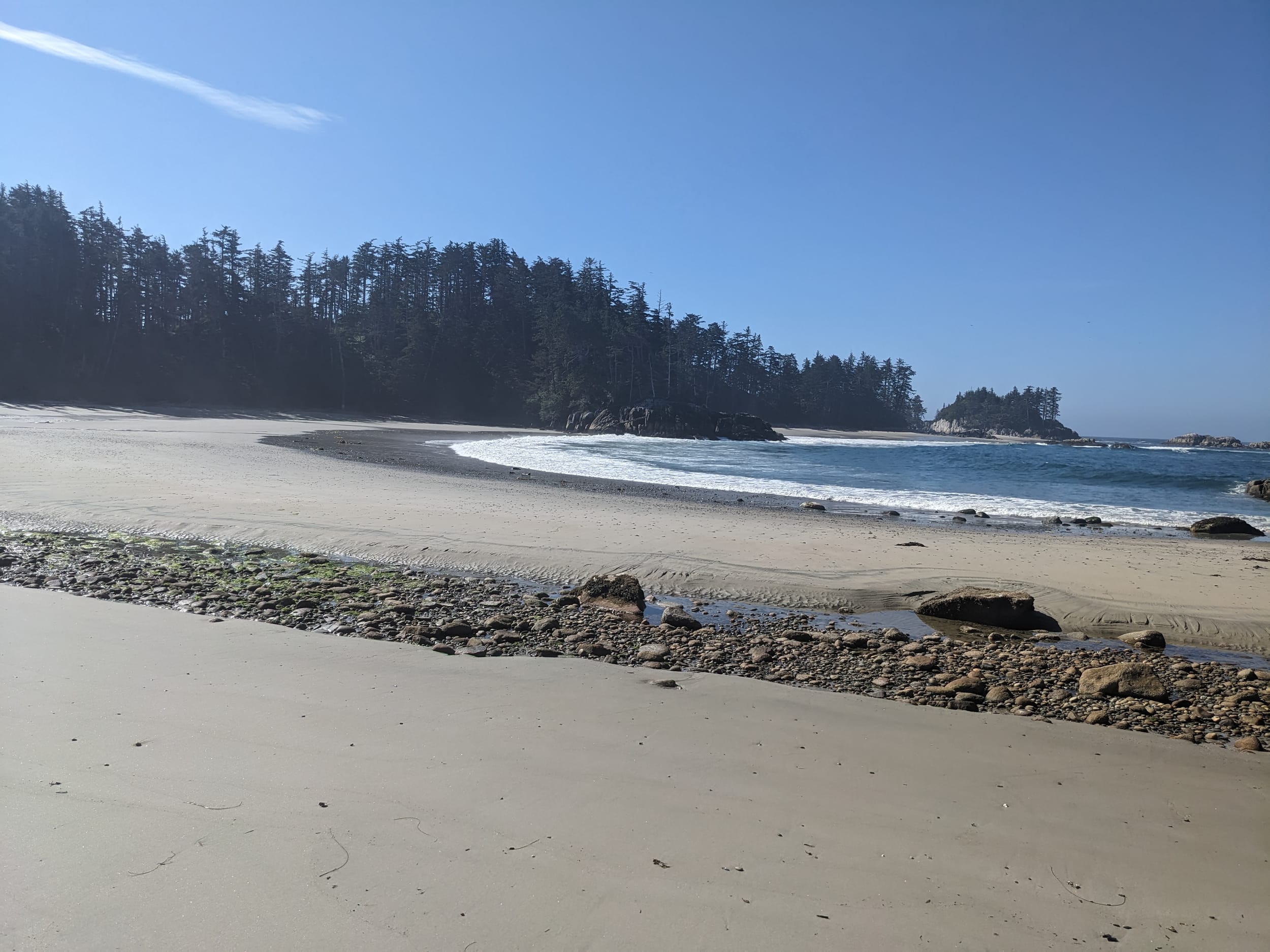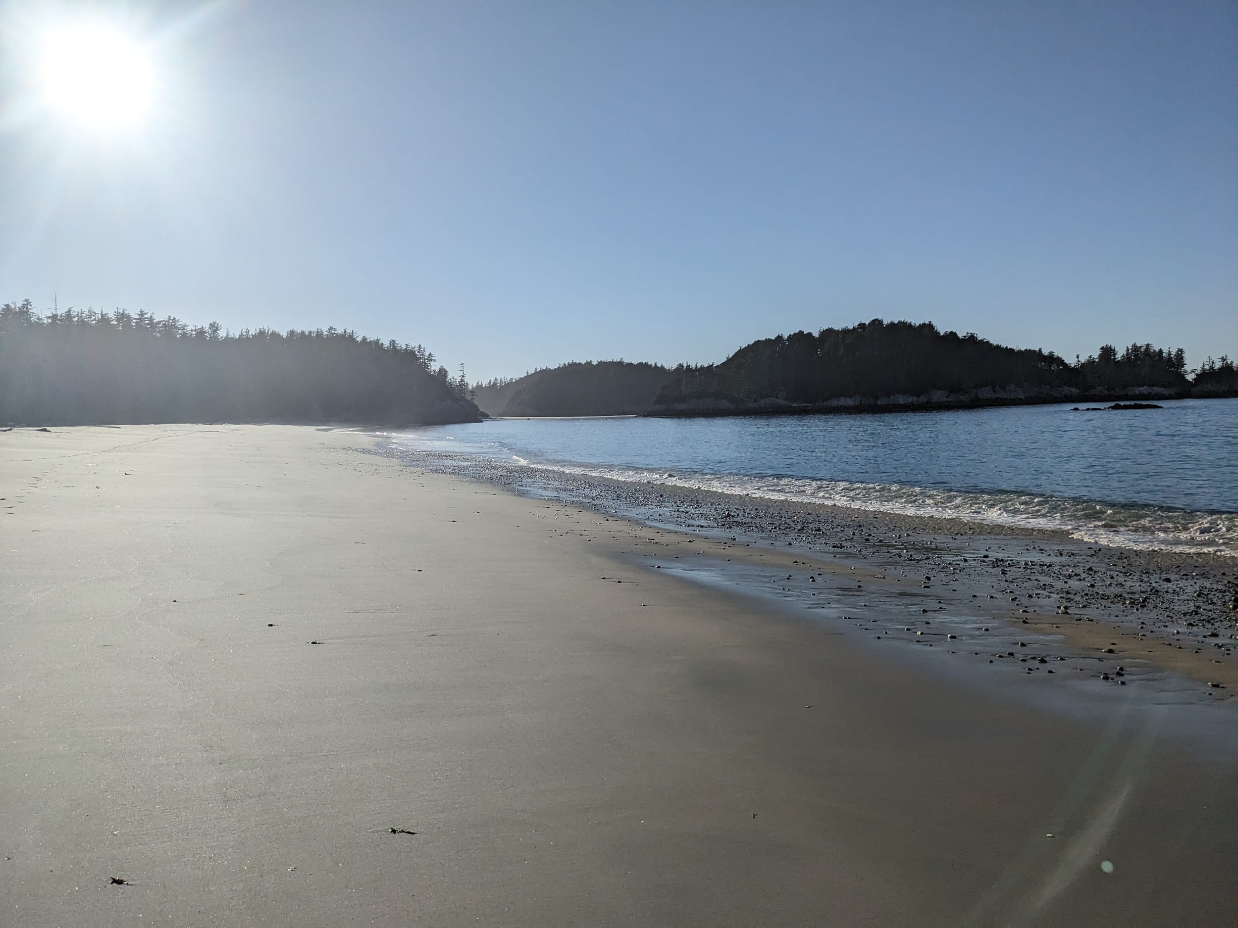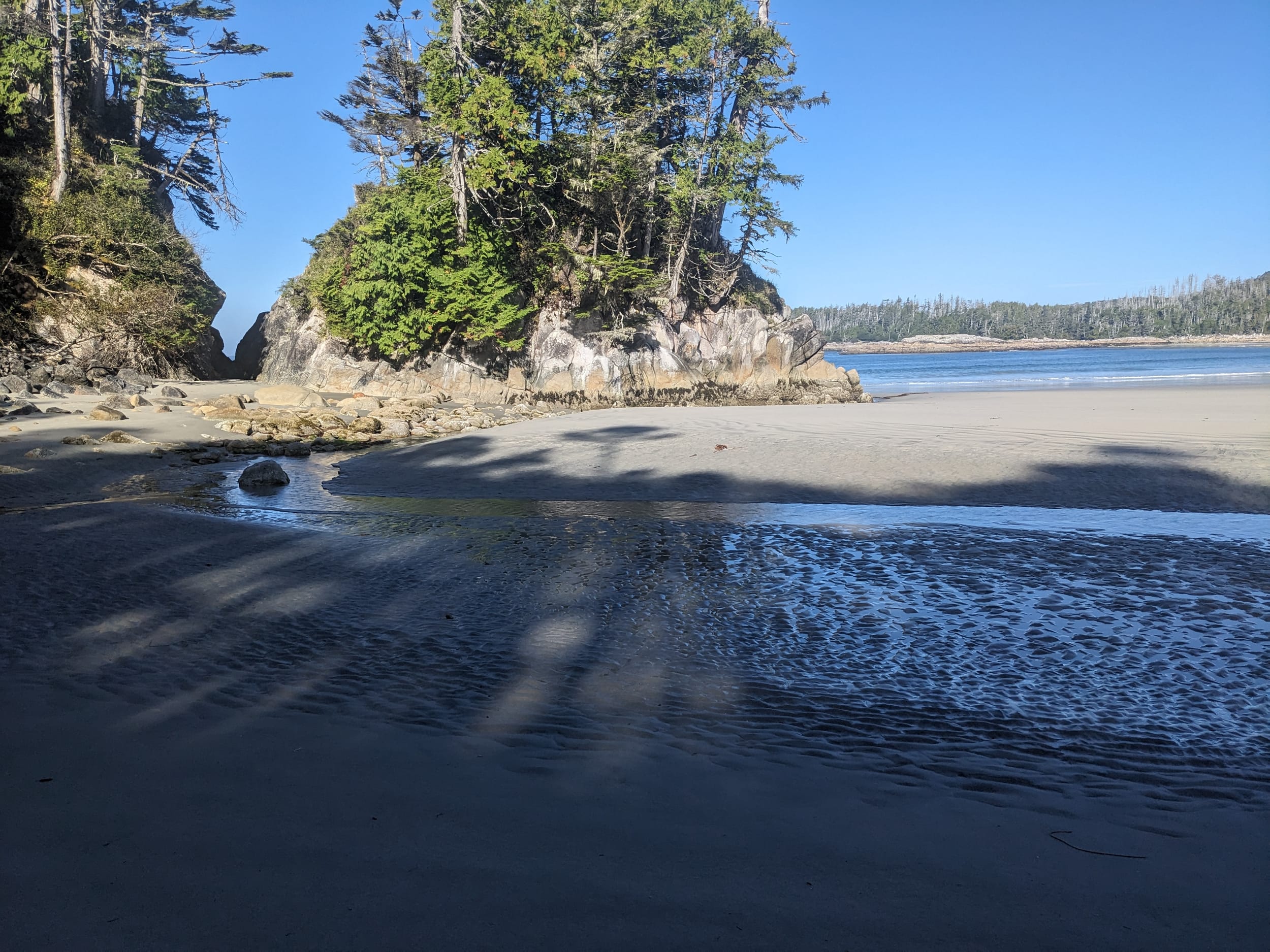 The trail was strangly dark - the forest was dense in this part of the island and the sun was starting to get low in the sky. It was a short trail though and it went along a very muddy lake for part of the way - just a reminder that we were still in the PNW before we got to another stunning sandy beach.