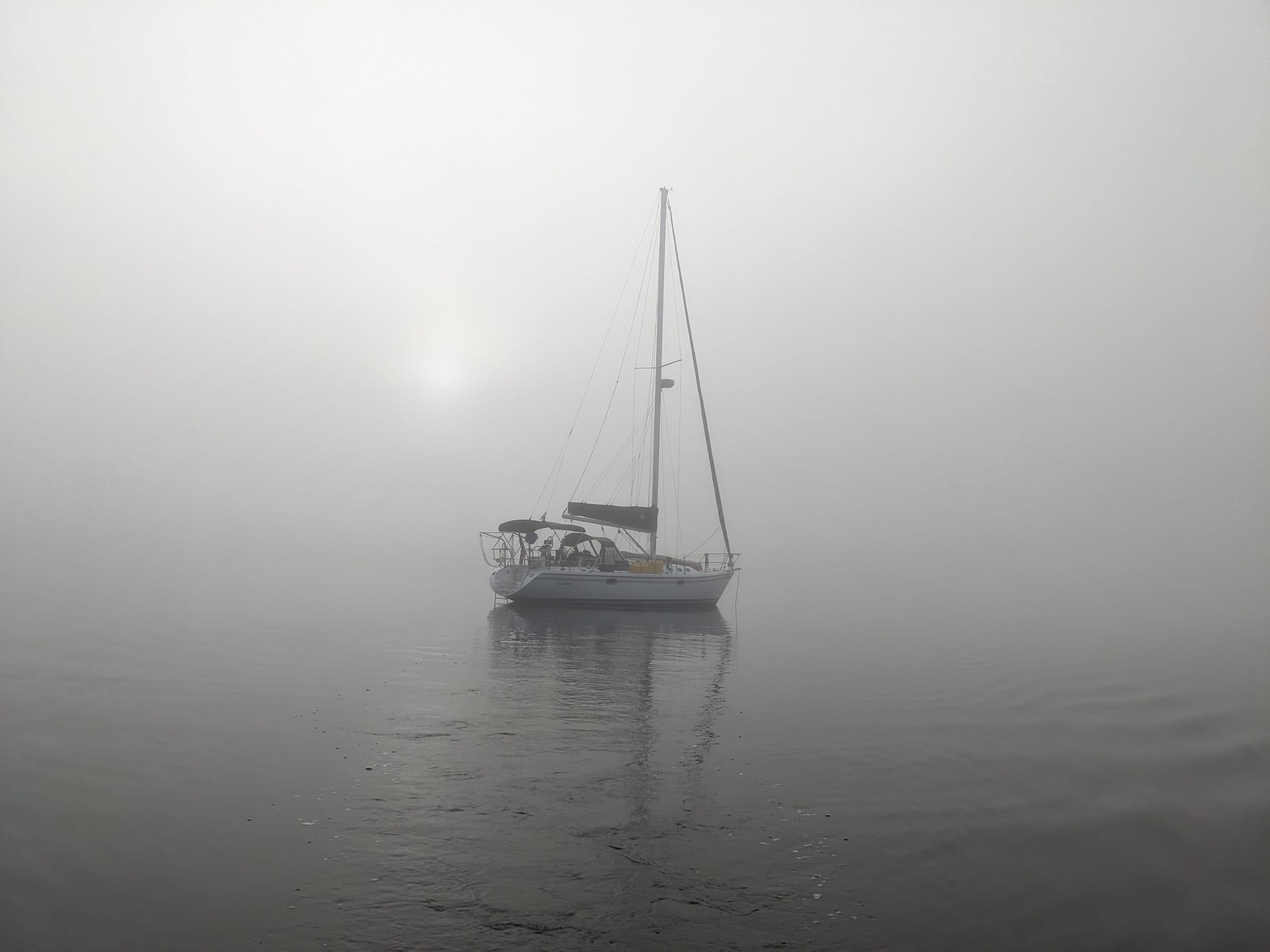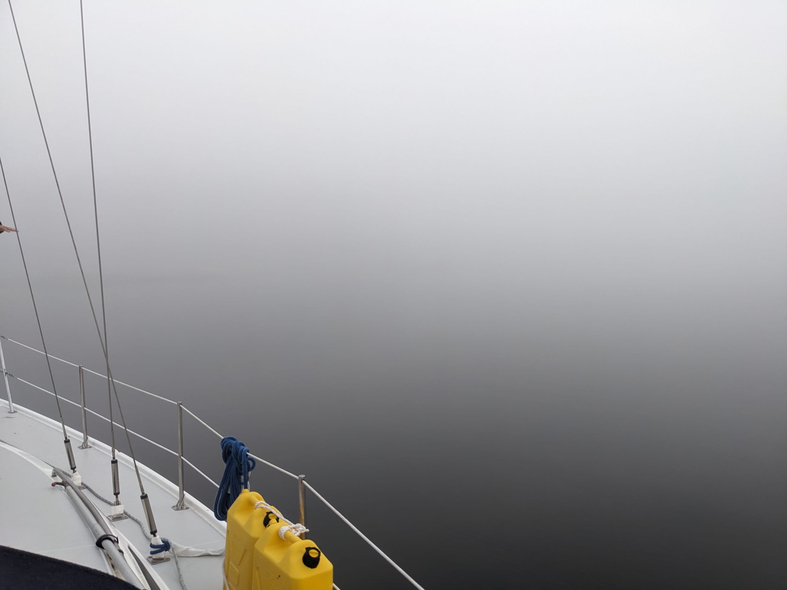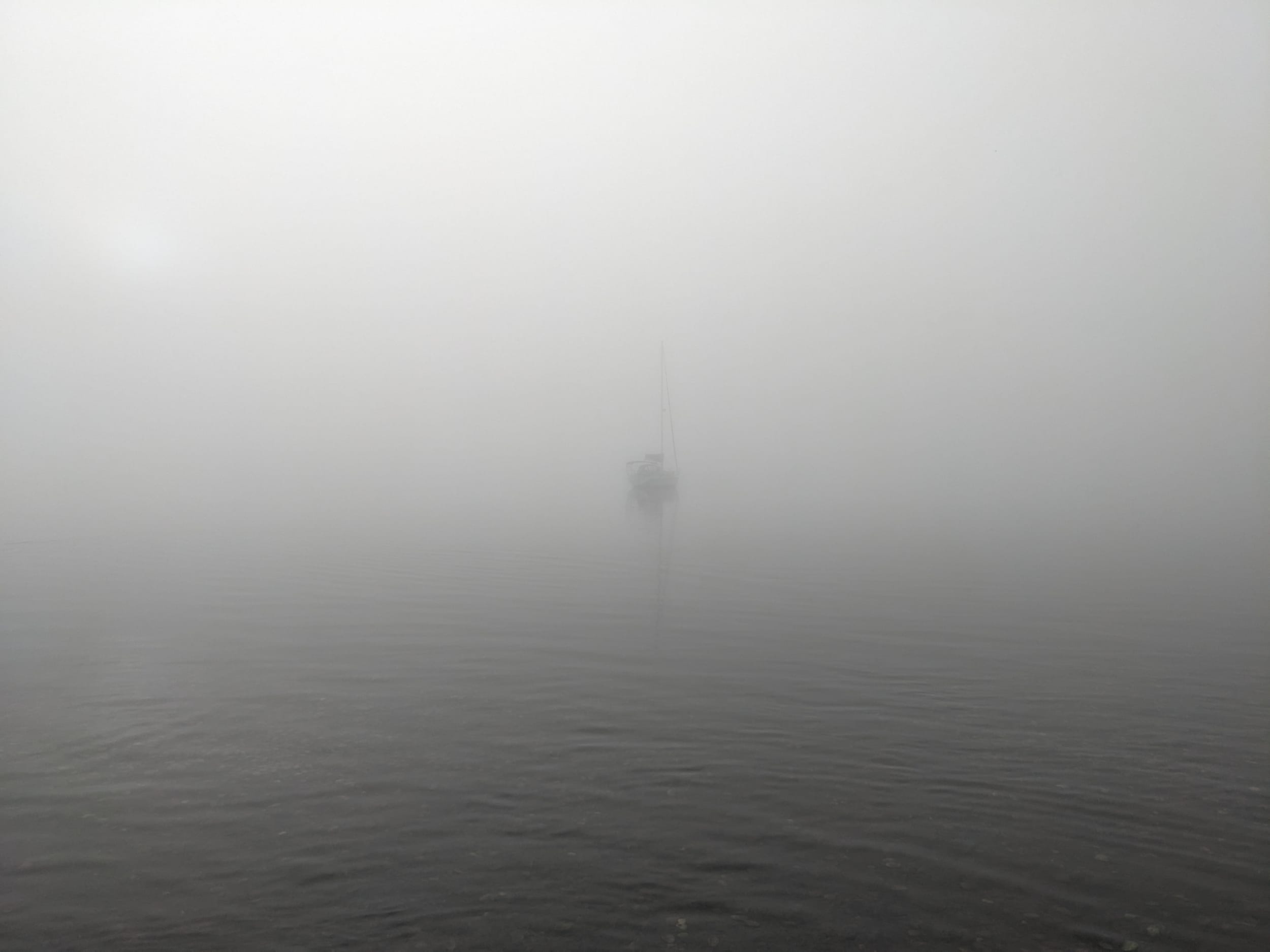 We decided to get a slower start today since we had only 30 nm to go. Good thing too, we woke up to dense fog to the point where we couldn’t even see the shore 300 ft away. Just before 8a, we decided that we had to at least take Oakley ashore. It was errie motoring off into the white wall of fog with the boat slipping away behind us, but we both pinned the boat before we left to make sure we could make it back.