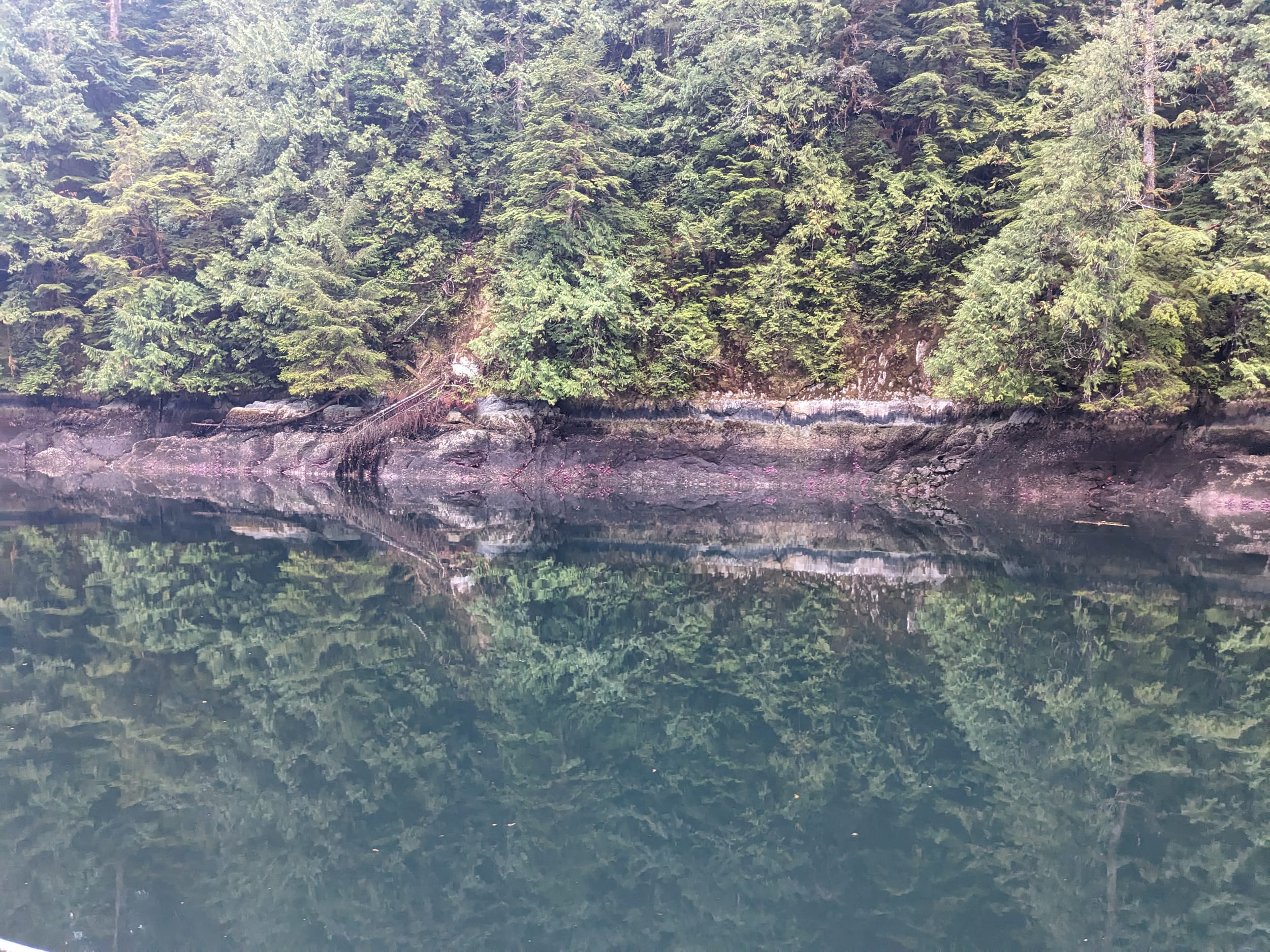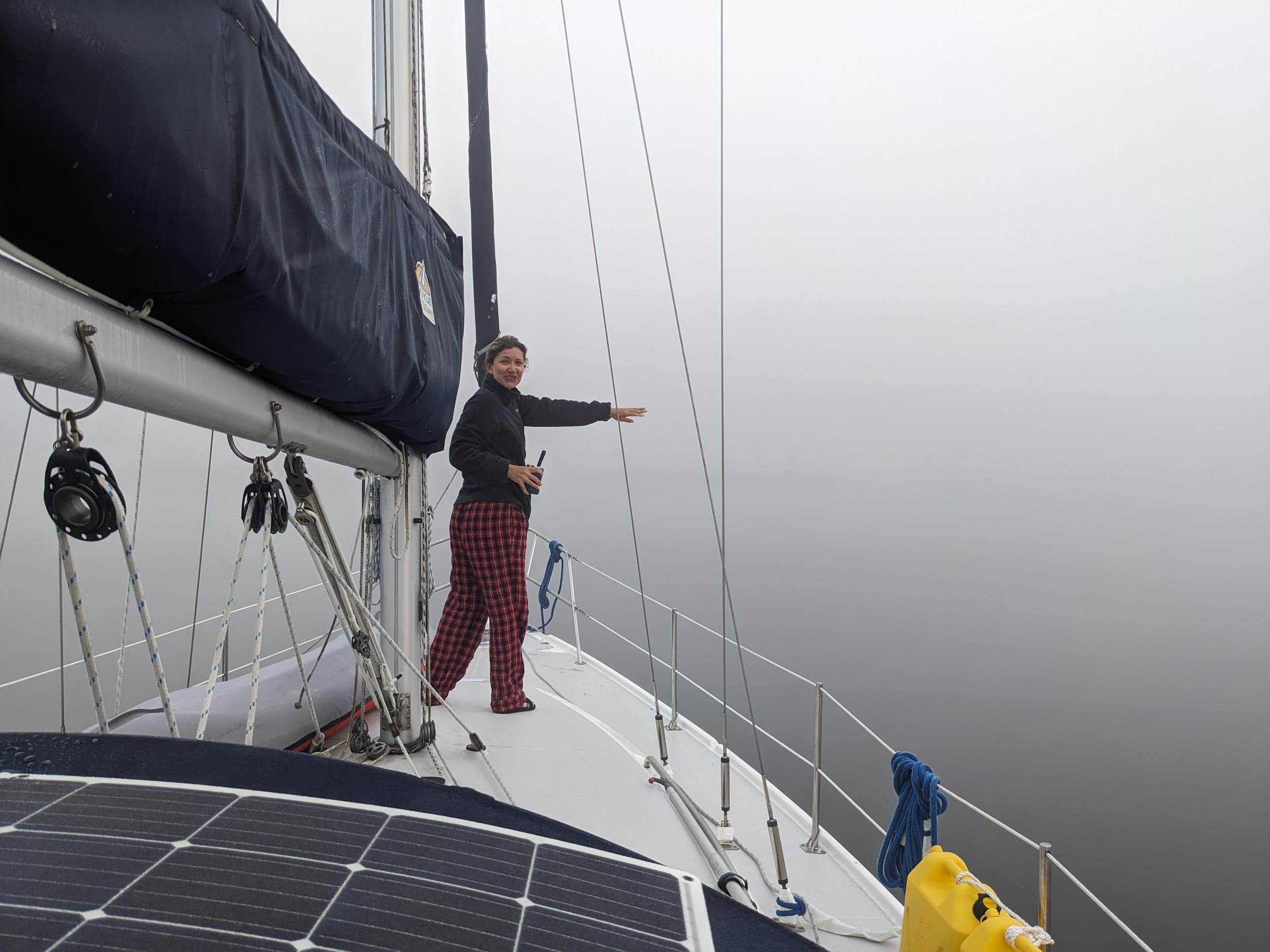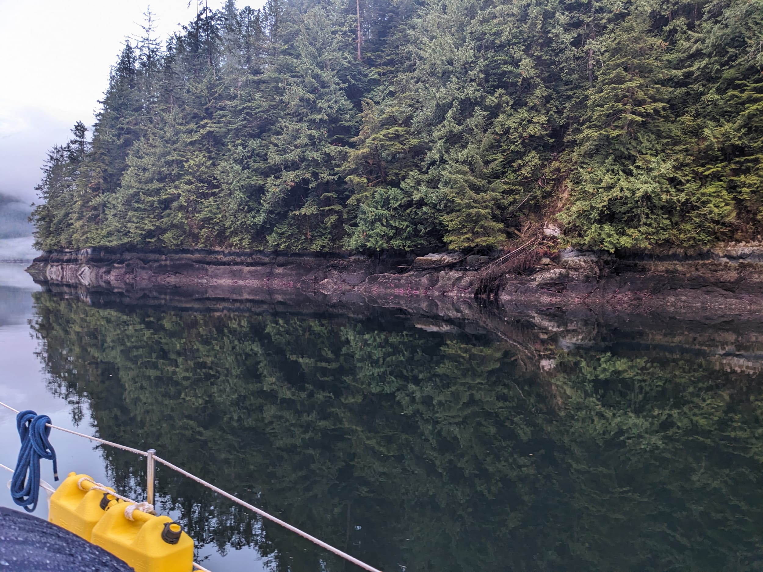 As we pulled out into the main channel, we ran into some dense fog. Combining that with the spring tide, which has floated a huge number of massive logs into the water, meant that the morning was nerve racking and required constant attention from the person on watch and a slower speed than normal. Thankfully the seas were calm, so once you spotted the log is was trival to avoid it.