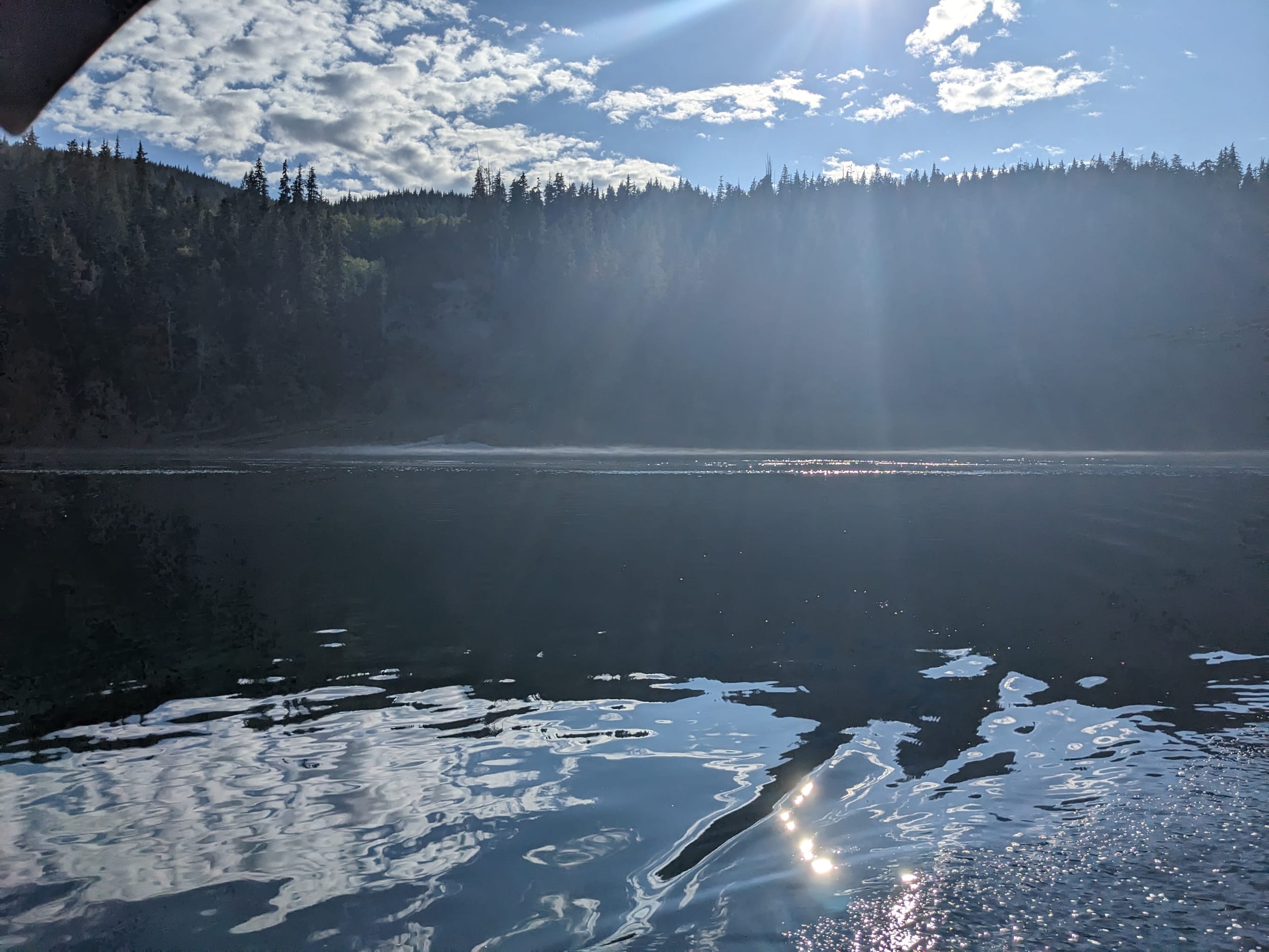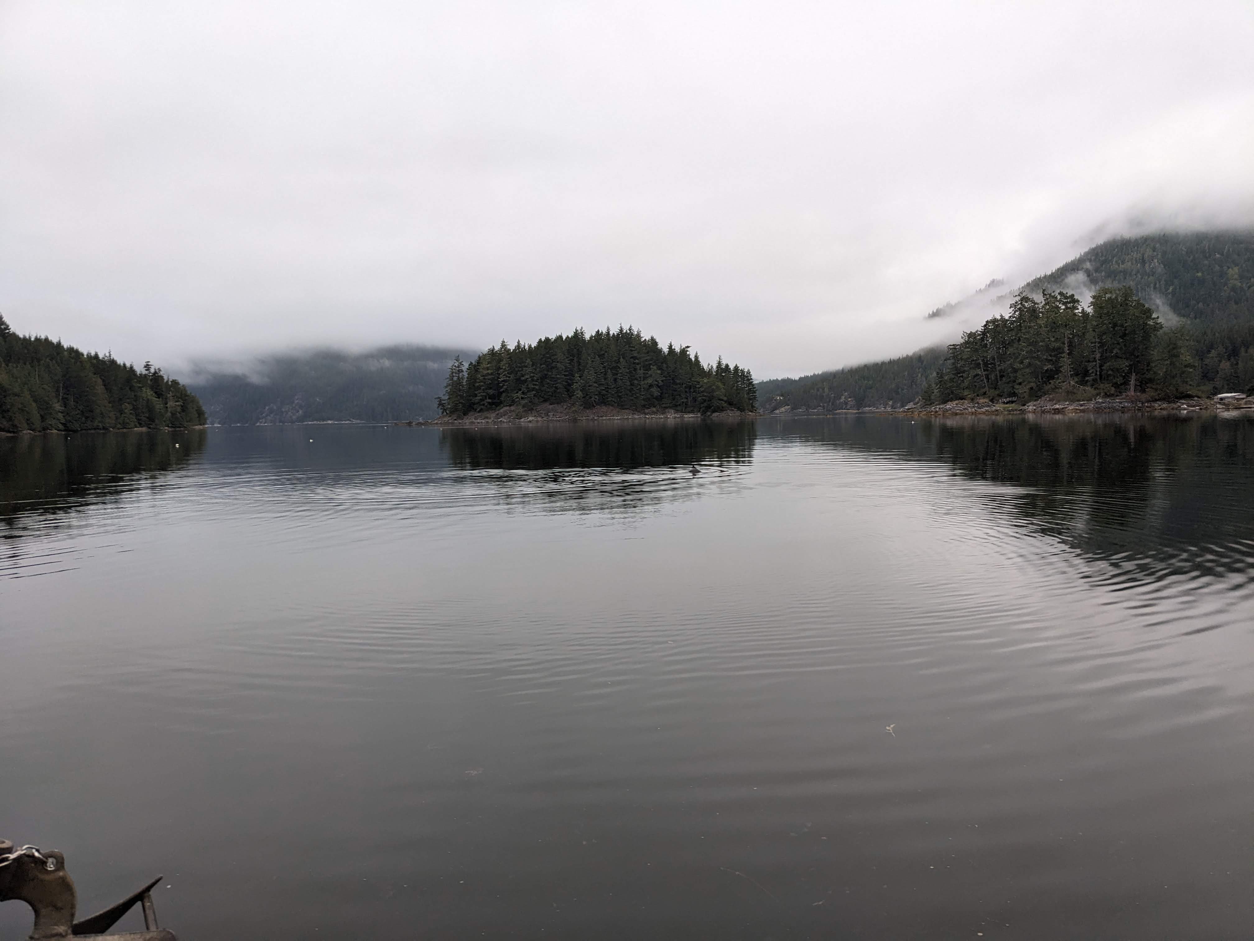 We slowed considerably going into Johnstone Strait - down to 3 knts at times. I was a bit worried we wouldn’t make it to Greenpoint Rapids in time - but, in response to my worry, a 10 knt wind picked up right over our stern and gave us an extra knot of speed. It had been a lovely day - sunny with beautiful mountains in the background and calm enough that some radiant mist had formed in the smaller coves.
