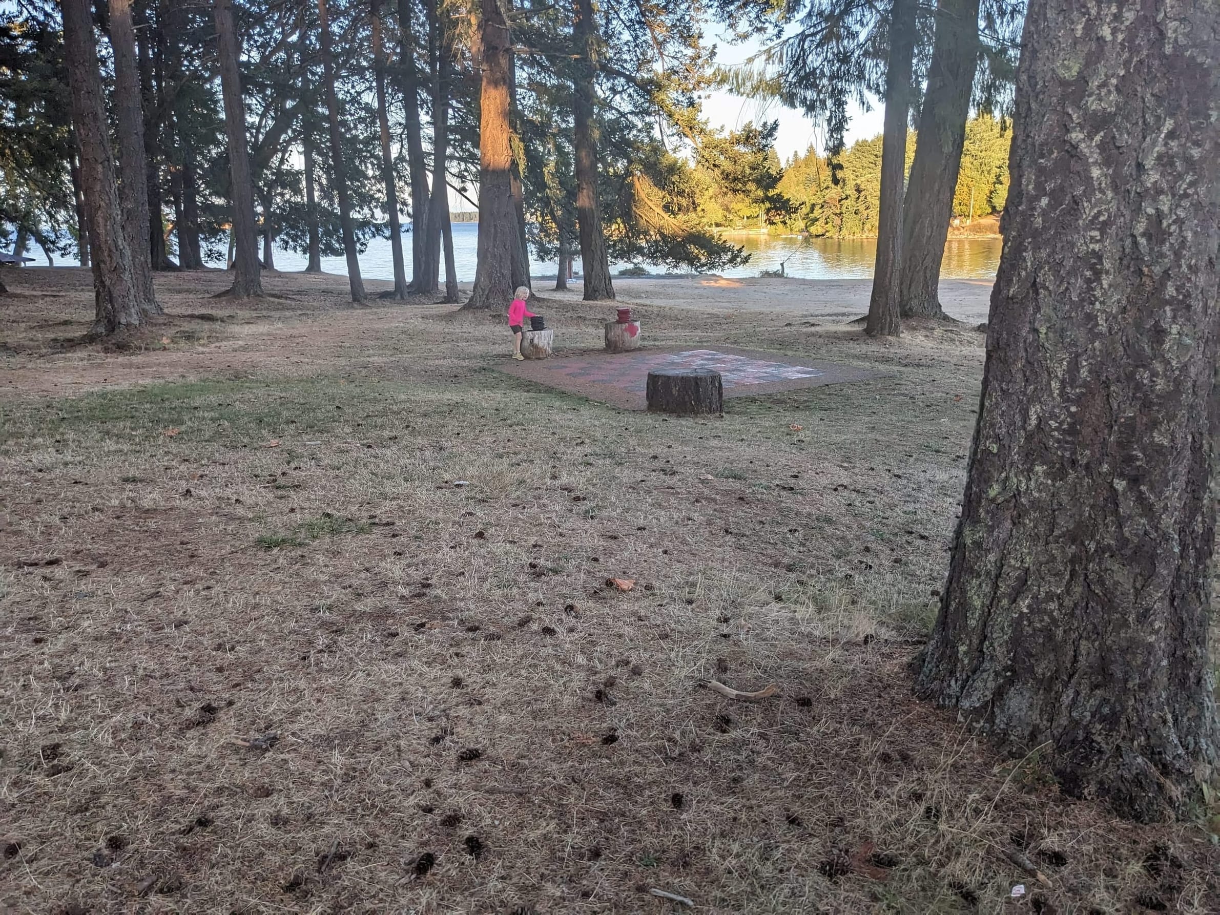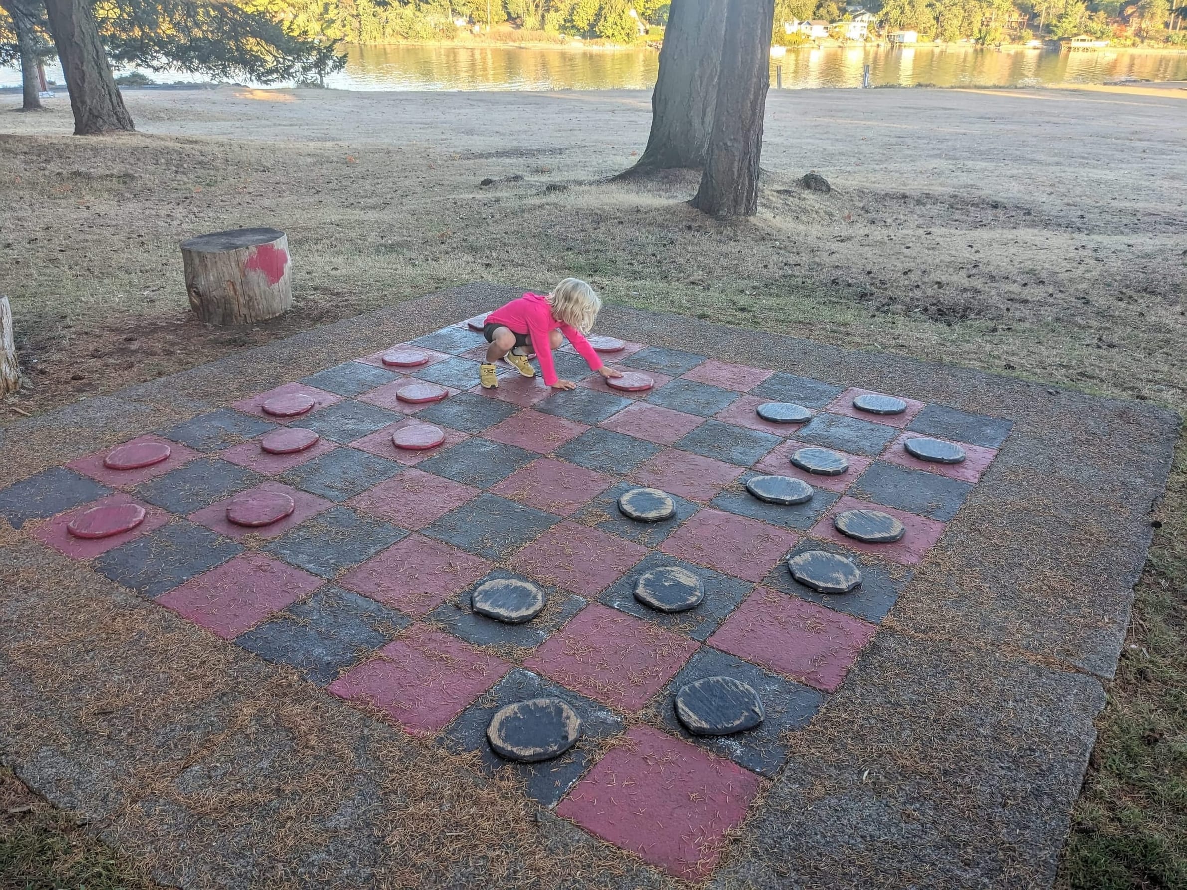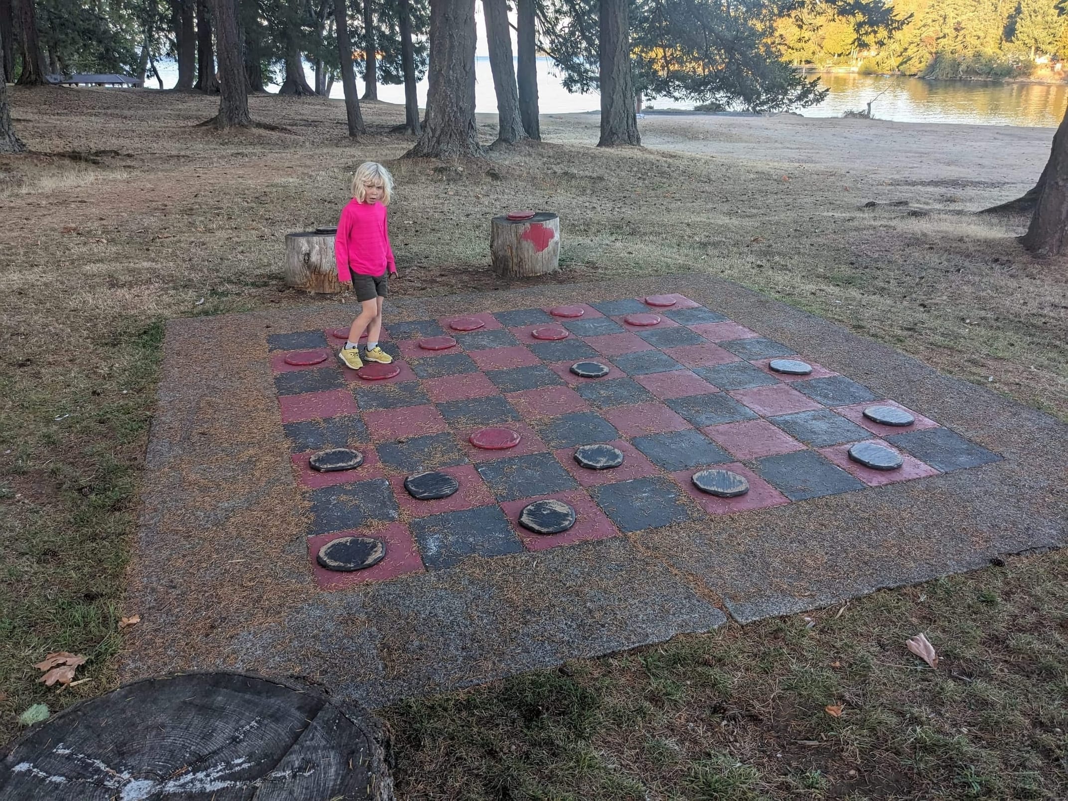 After walking back to the boat, Sara and I took the dinghy over to Newcastle Island park while Angela did some work. It was a really fun spot - even though most of it was closed up for the season. In future years, they have a dinghy dock pub (where you dighy right up to the pub) and a resteraunt cafe that sells food and ice cream - but both of them were closed for the season. There was a playground and all sorts of various toys - including a big checkers game which Sara and I played. They also have a dock and a bunch of mooring balls as well as some folks on anchor just outside the park - all of this looked like a fun place to stay next time we come through.