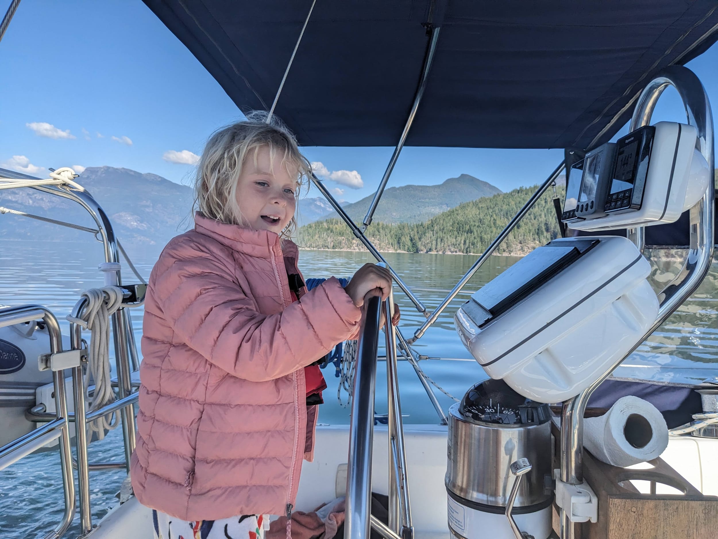After we made it through the rapids, we had the very long push through Calm Channel and then Lewis Channel to Cortes Bay. The current was unexpectedly in our favor, but it was still a long way to go. We went through the normal routine on a sunny day - reading on the deck and rotating through steering duties with no autopilot. Even Sara got a turn.
