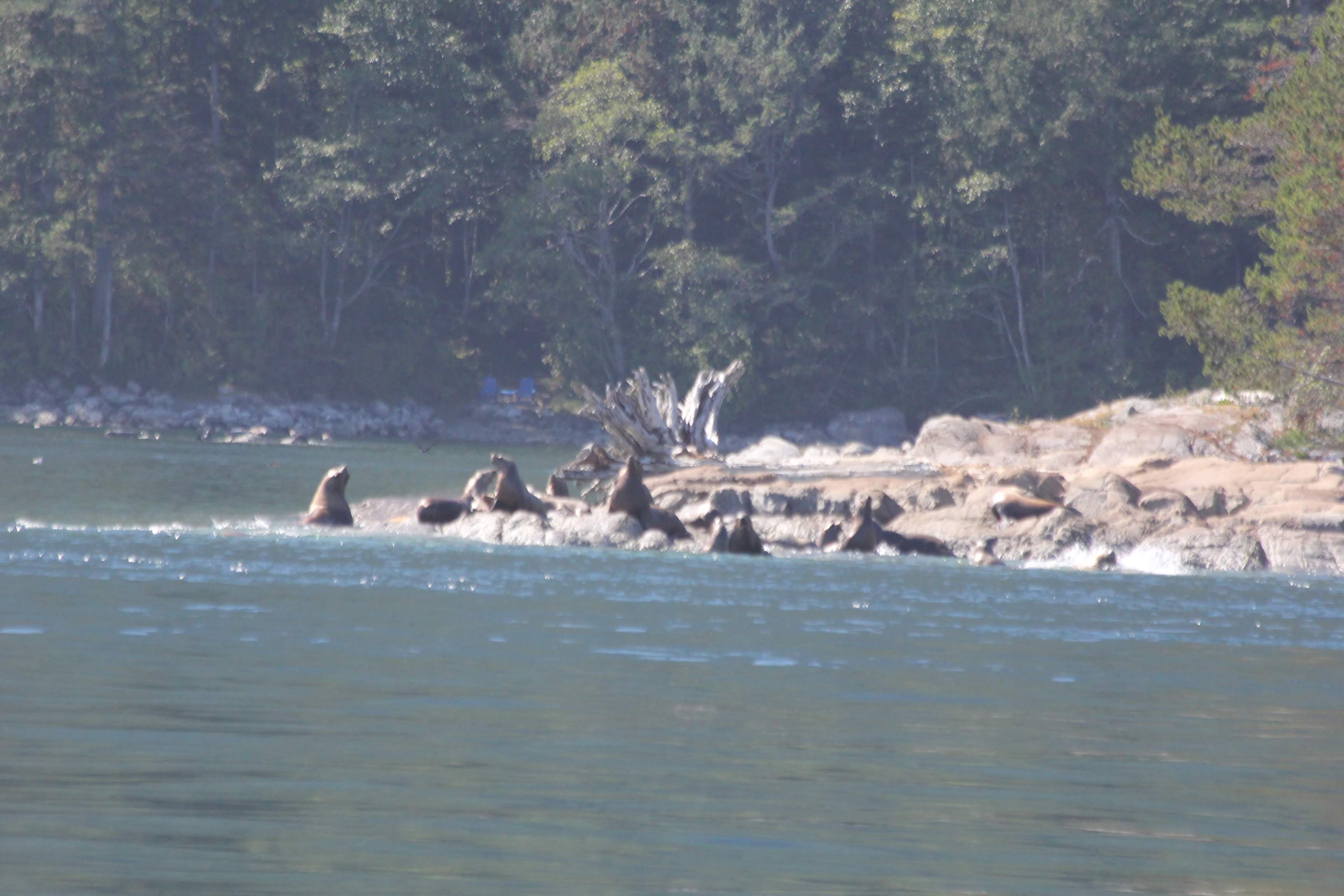 We had a very late start today - our window for crossing the rapids is at 1:10p so we are aiming to leave Shoal Bay at 11a. We spent most of the morning chatting with another boat who is from the area and they were heading to Dent island lodge. They gave us some good intel about being able to head through the rapids early on a high water slack - so ended up following them through the first set of rapids at about 12:15p. We waved goodbye as we headed through the next two sets of rapids and we saw some sea lions playing at slack water in the rapids - they were very fun to watch and very active.