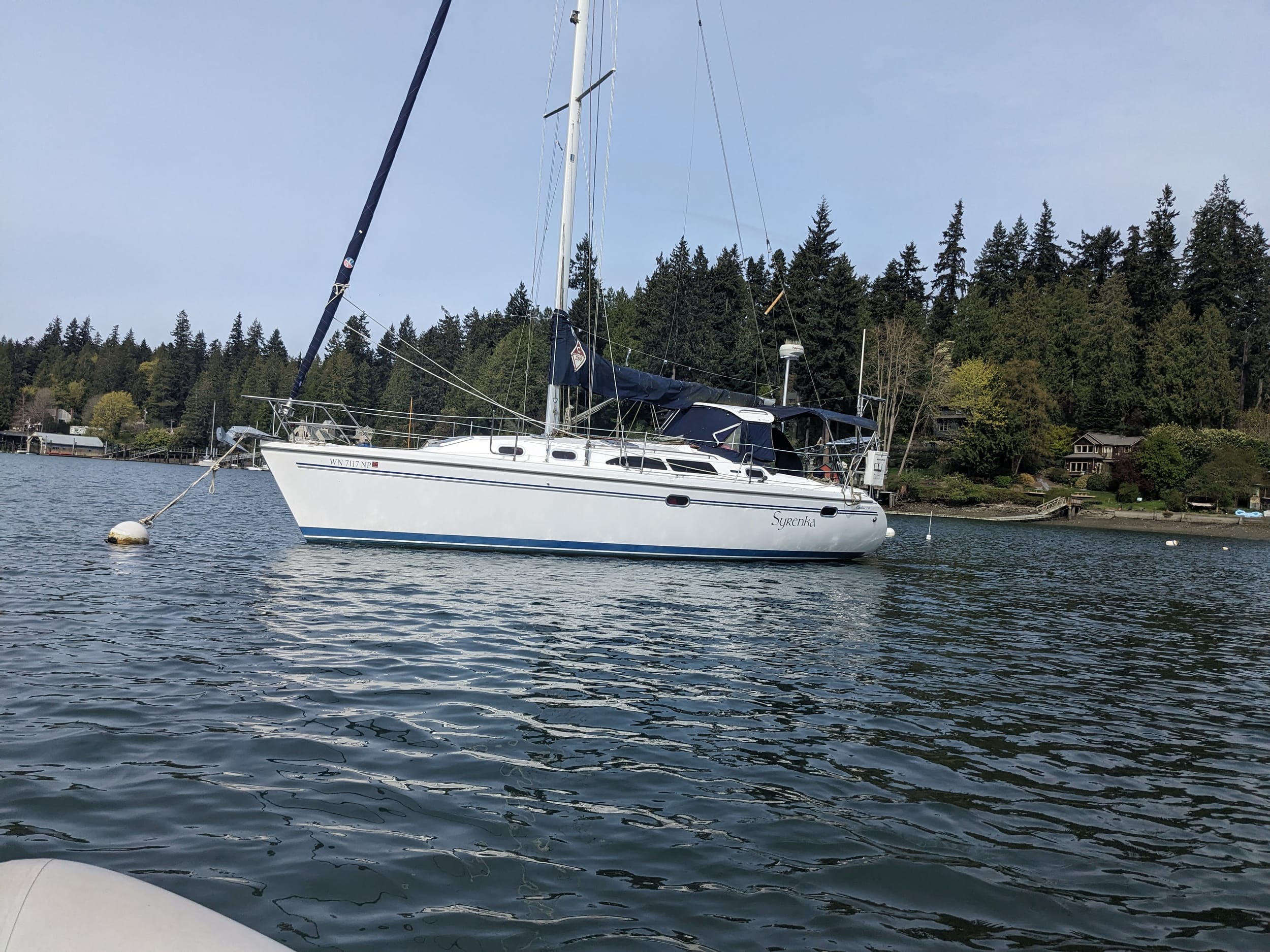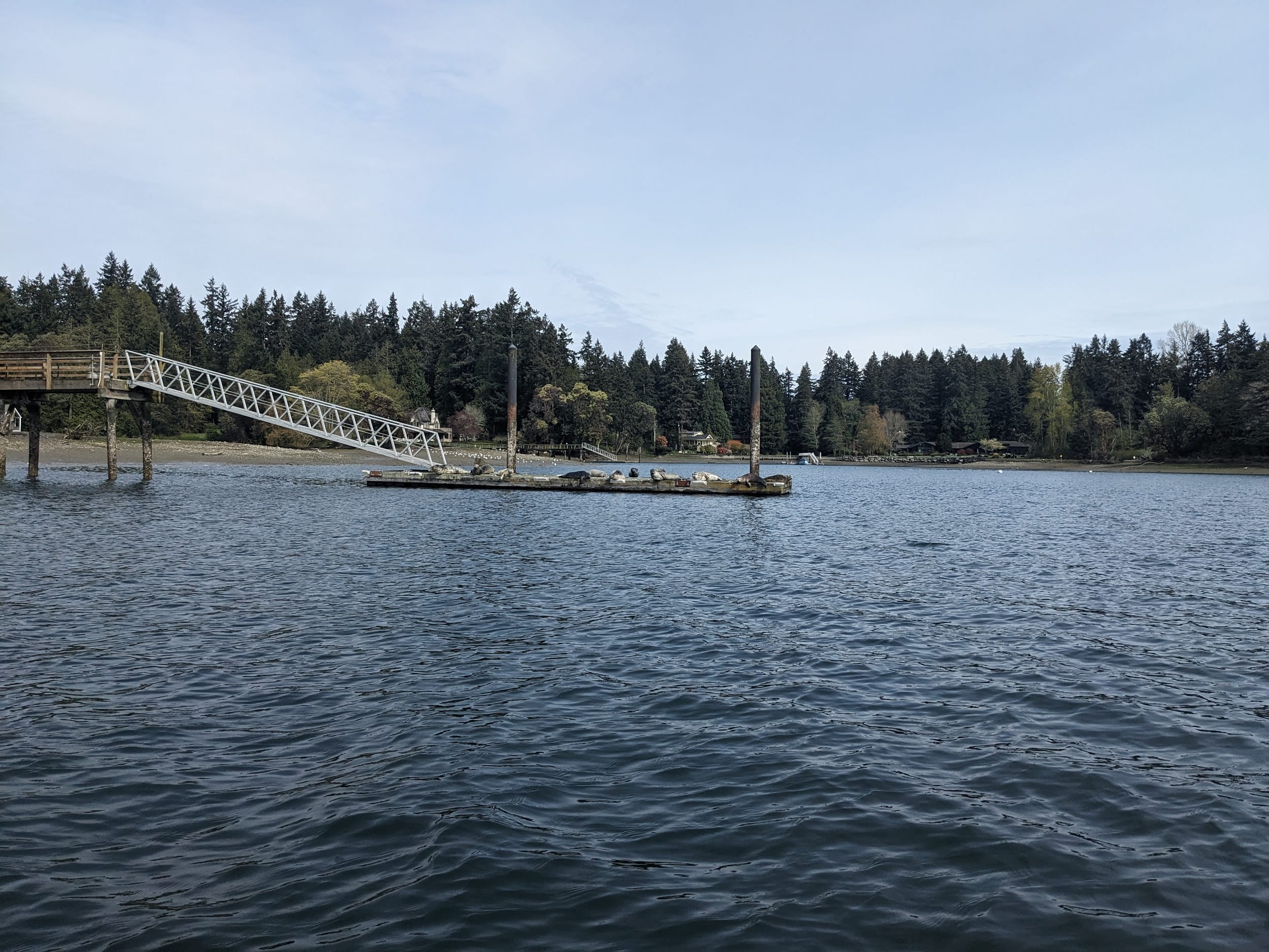 Sara and I did a dinghy ride around Port Madison inlet, mostly just to do a shakeout of the dinghy which hadn’t been in the water in awhile. We found a dock full of seals hauled out (probably after a big snack) and found our boat twin tied up to a mooring ball out in the bay.