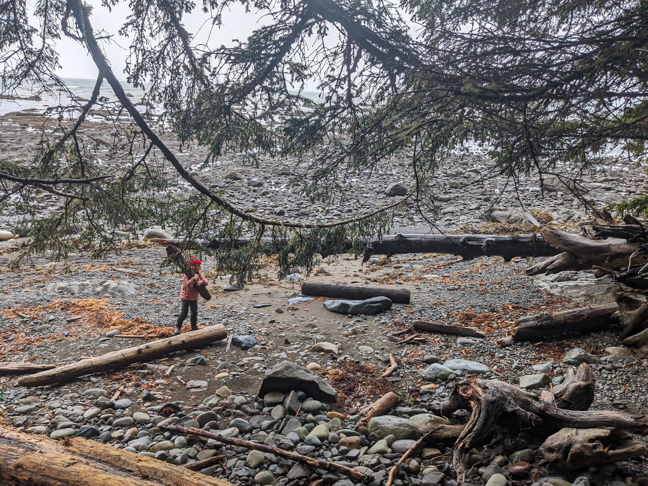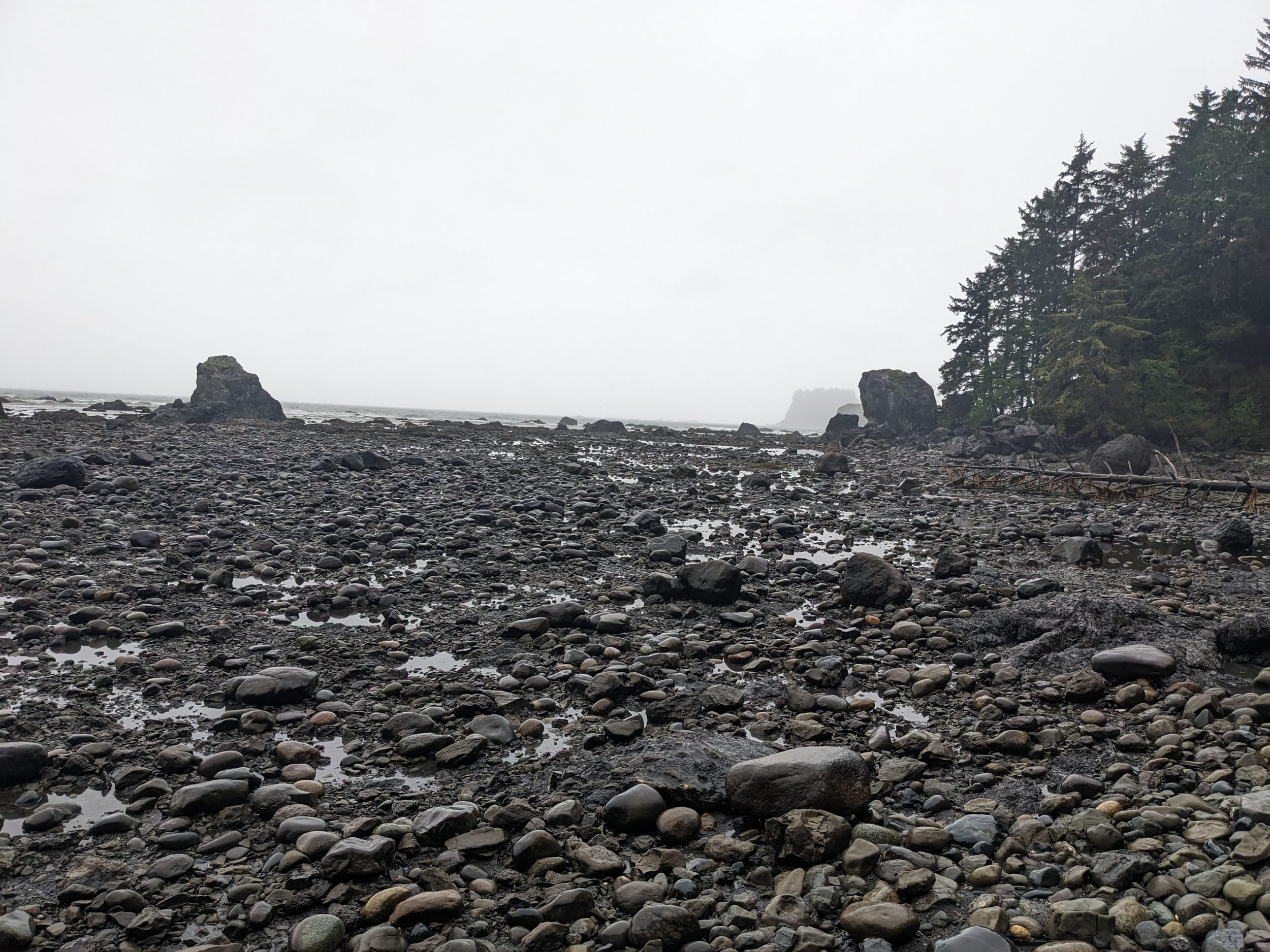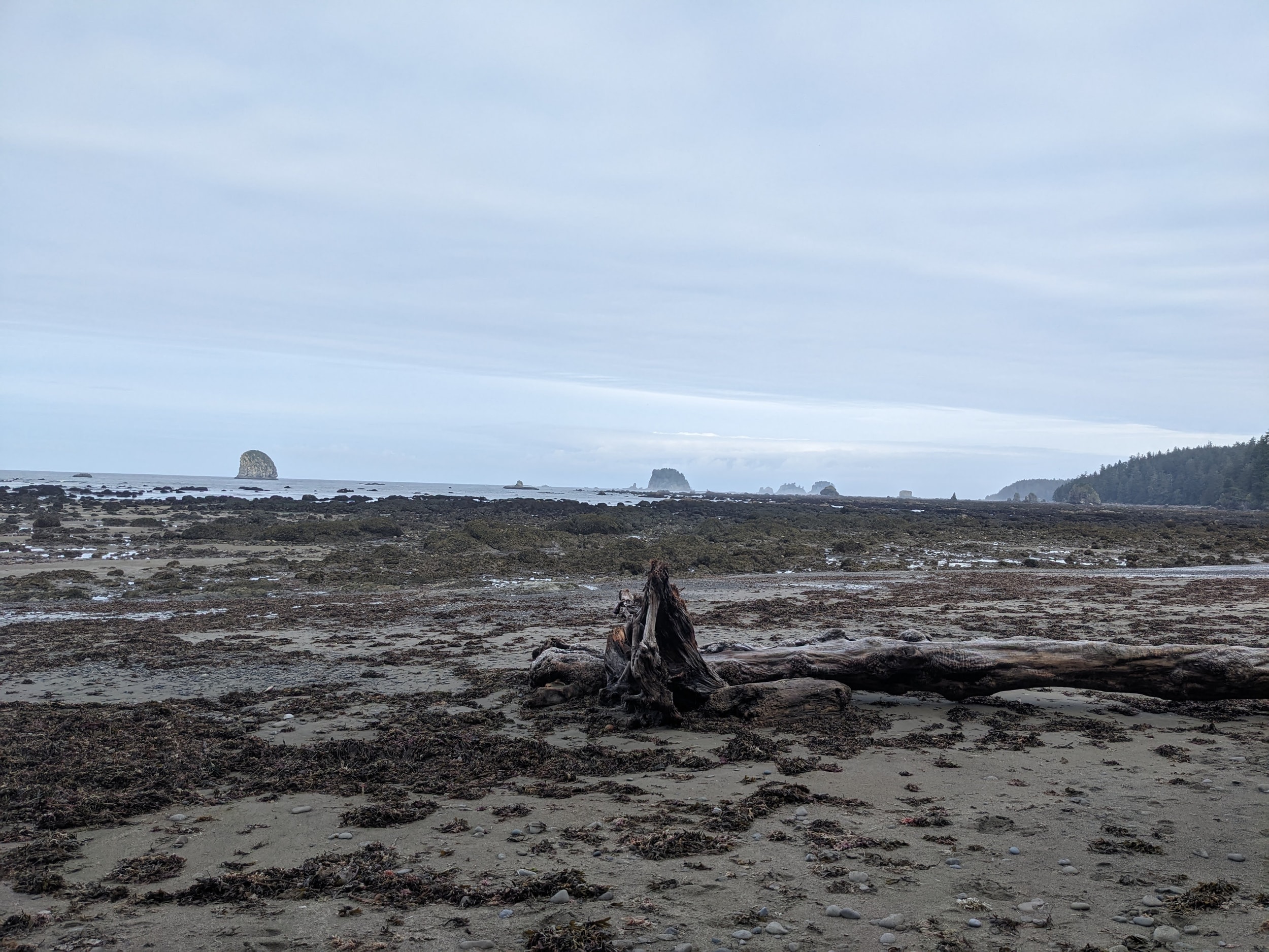 We got to the beach in the early afternoon and started to make our way from Camp Alava down to Wedding Rocks where we had our permit to camp for the night. The beach transitioned between sand and rocks/scrambling as we made our way down the coast. The tide was mostly in, so there was only small pockets of tidal land where we could go tidepooling. There were quite a few downed trees that we had to climb over/under, which would have been easier with the tide a little bit more out.