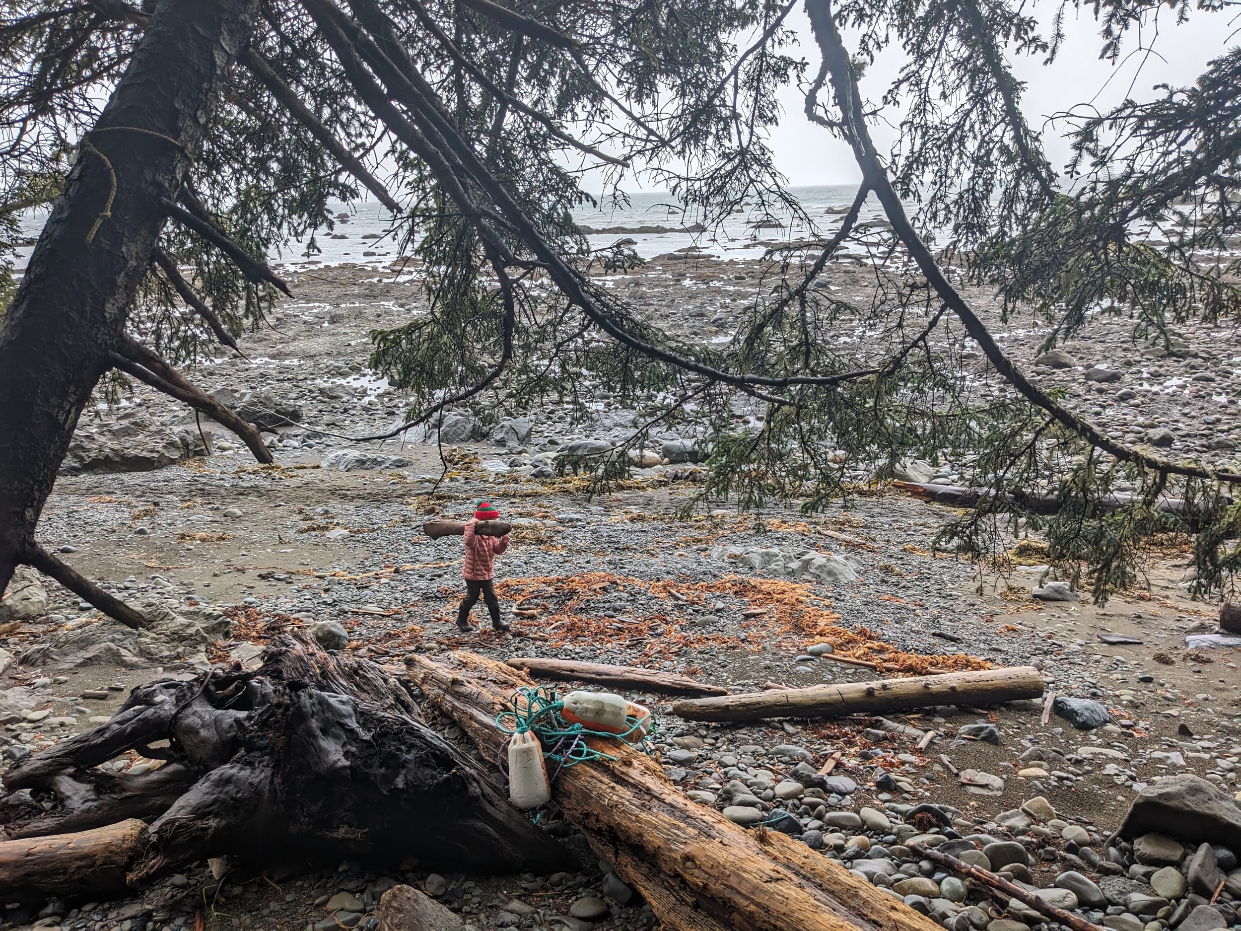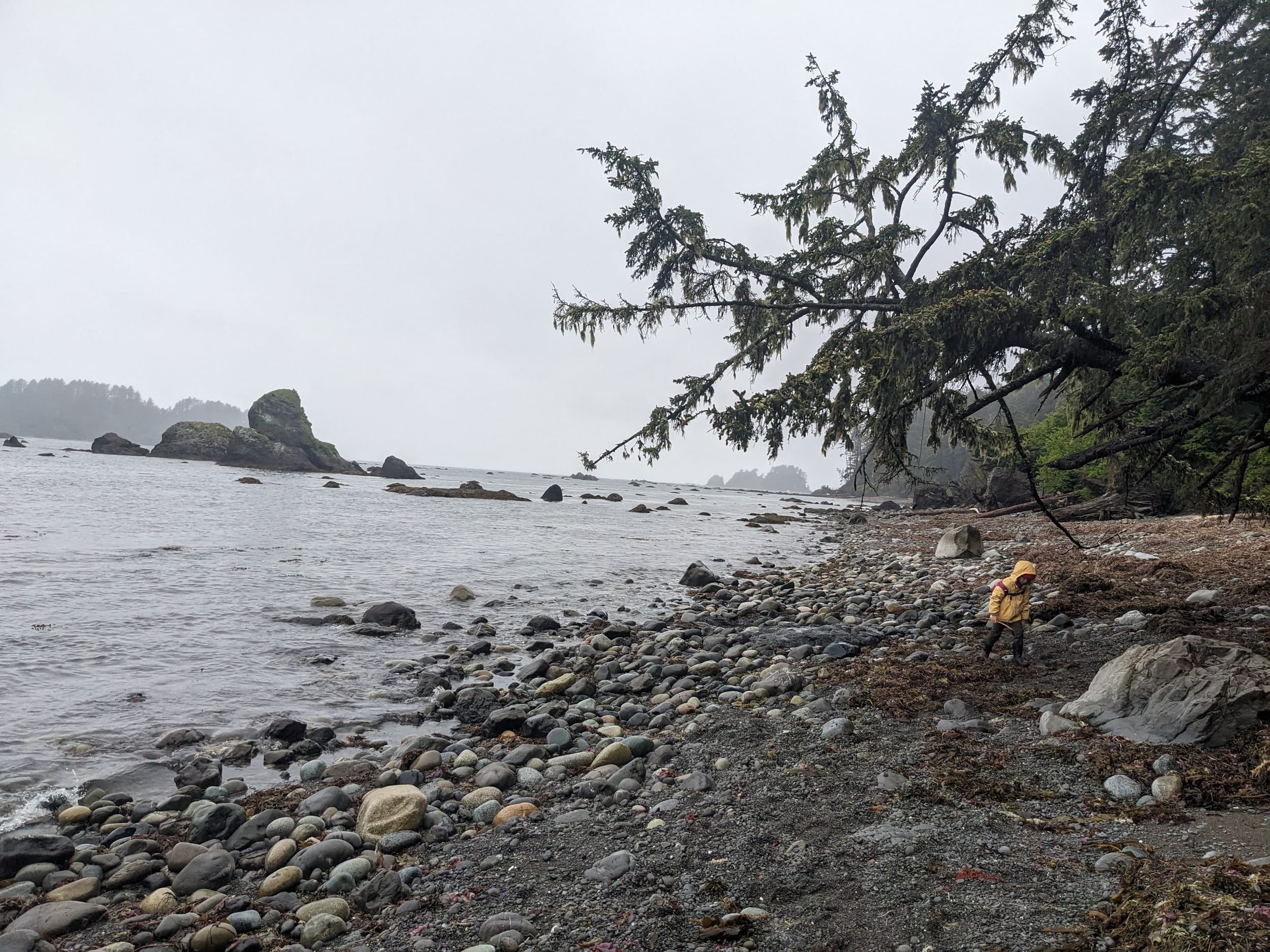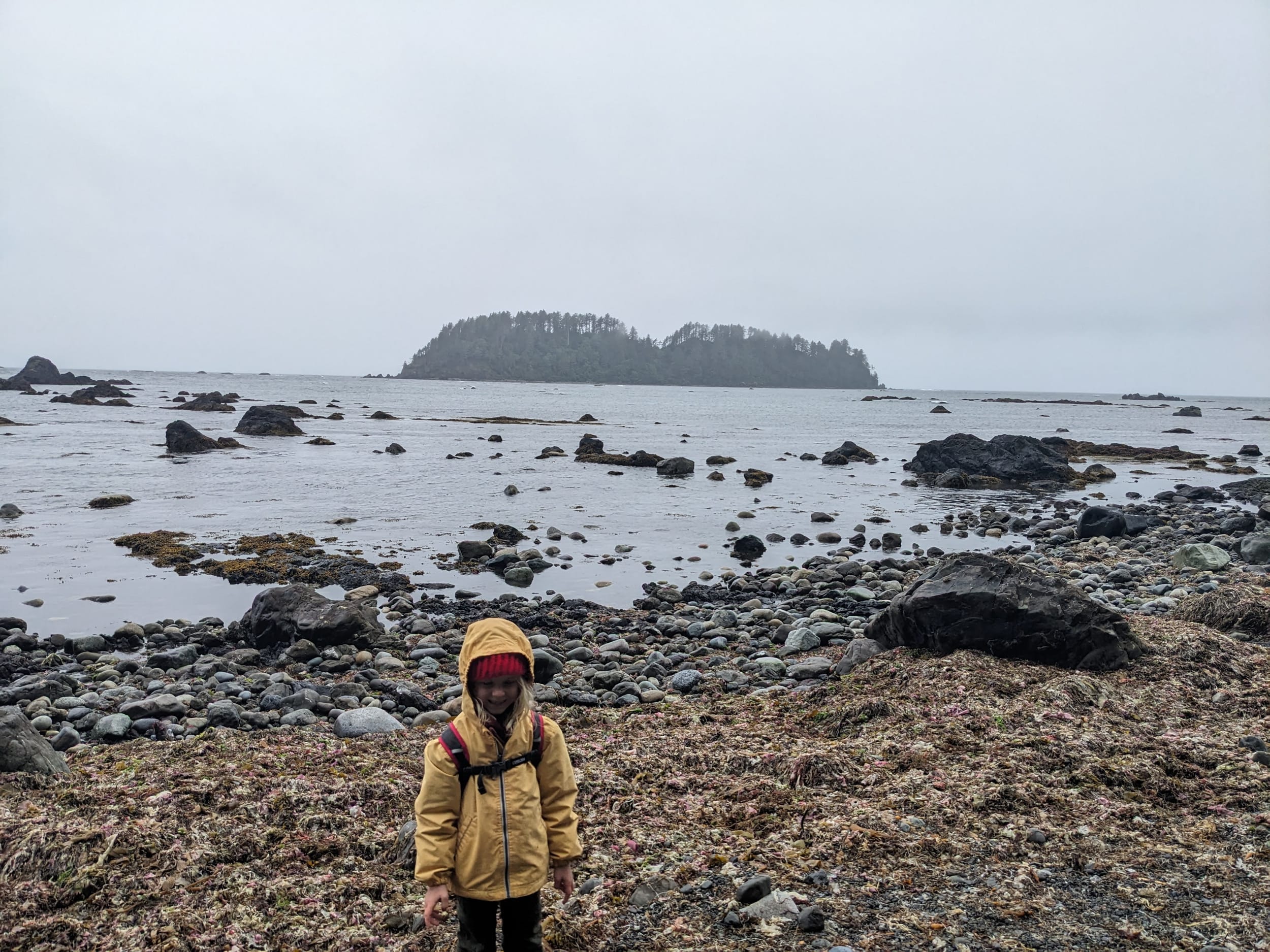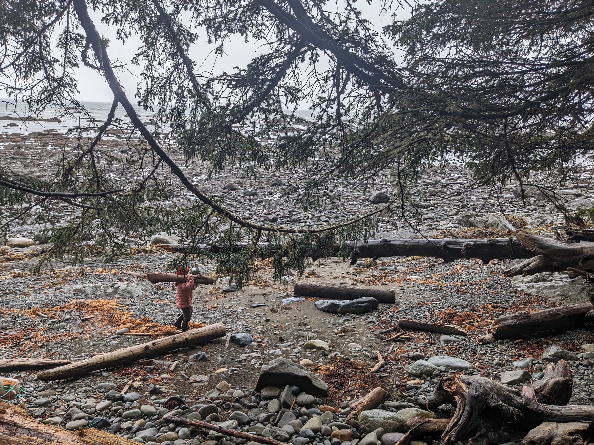 We got to the beach in the early afternoon and started to make our way from Camp Alava down to Wedding Rocks where we had our permit to camp for the night. The beach transitioned between sand and rocks/scrambling as we made our way down the coast. The tide was mostly in, so there was only small pockets of tidal land where we could go tidepooling. There were quite a few downed trees that we had to climb over/under, which would have been easier with the tide a little bit more out.