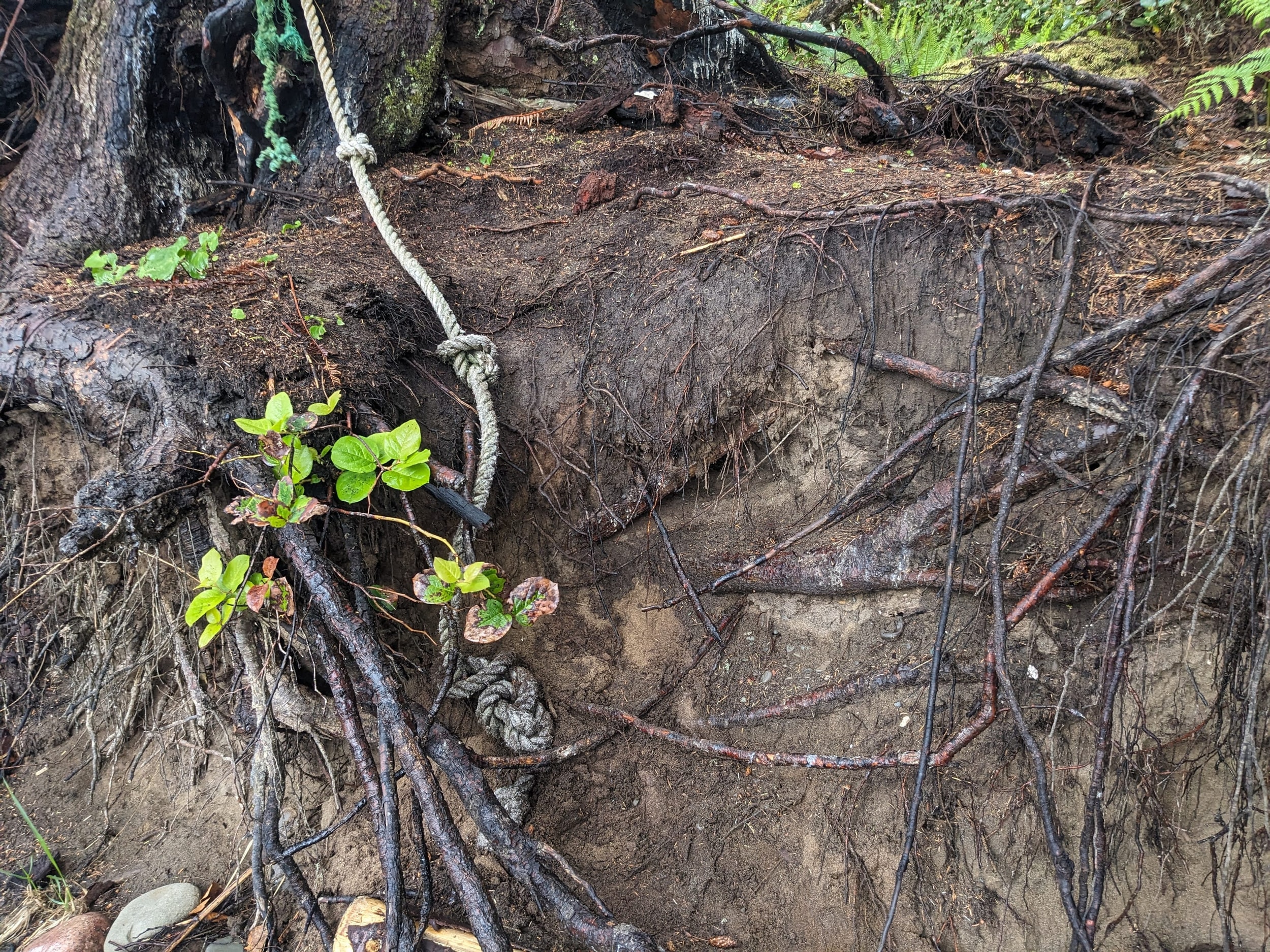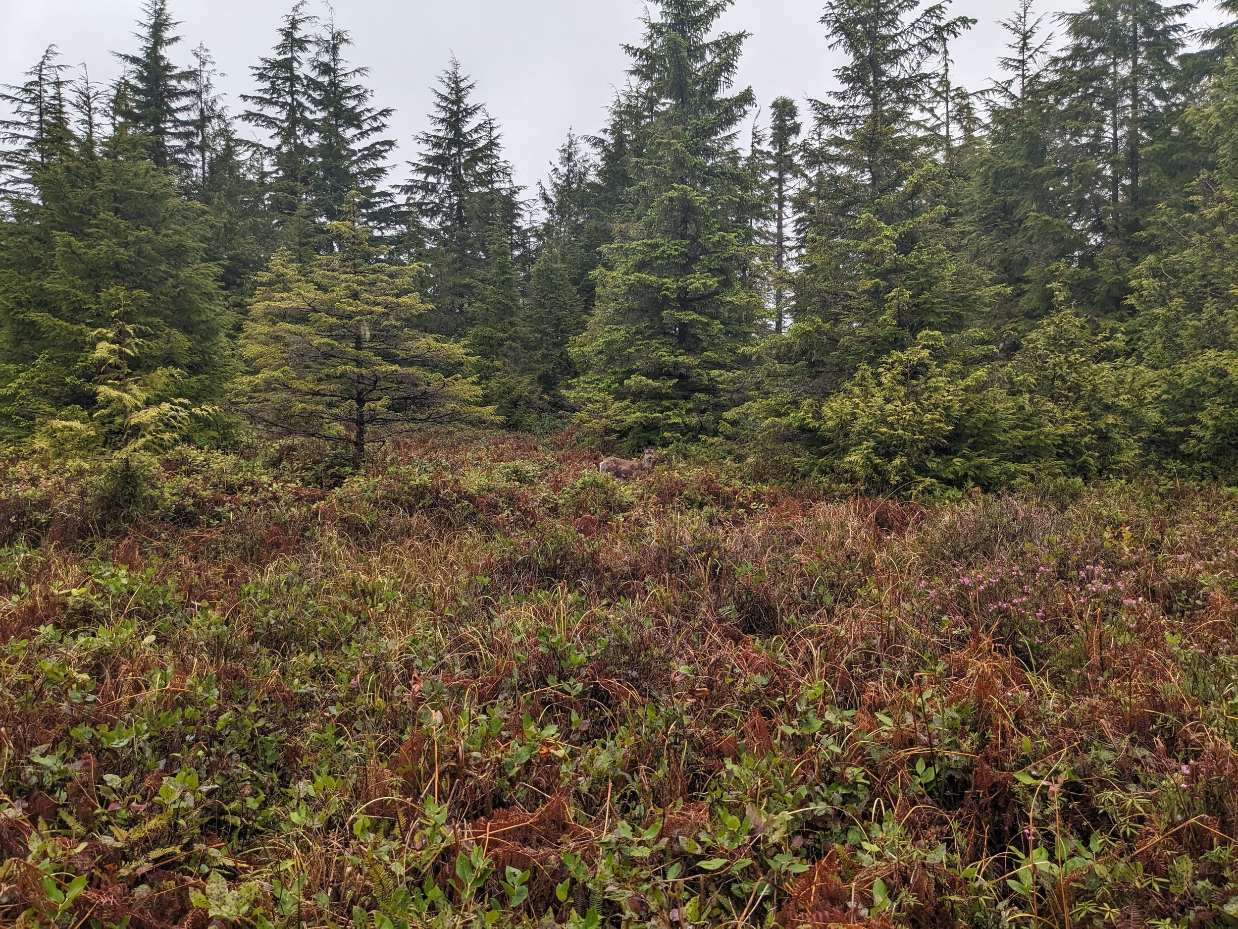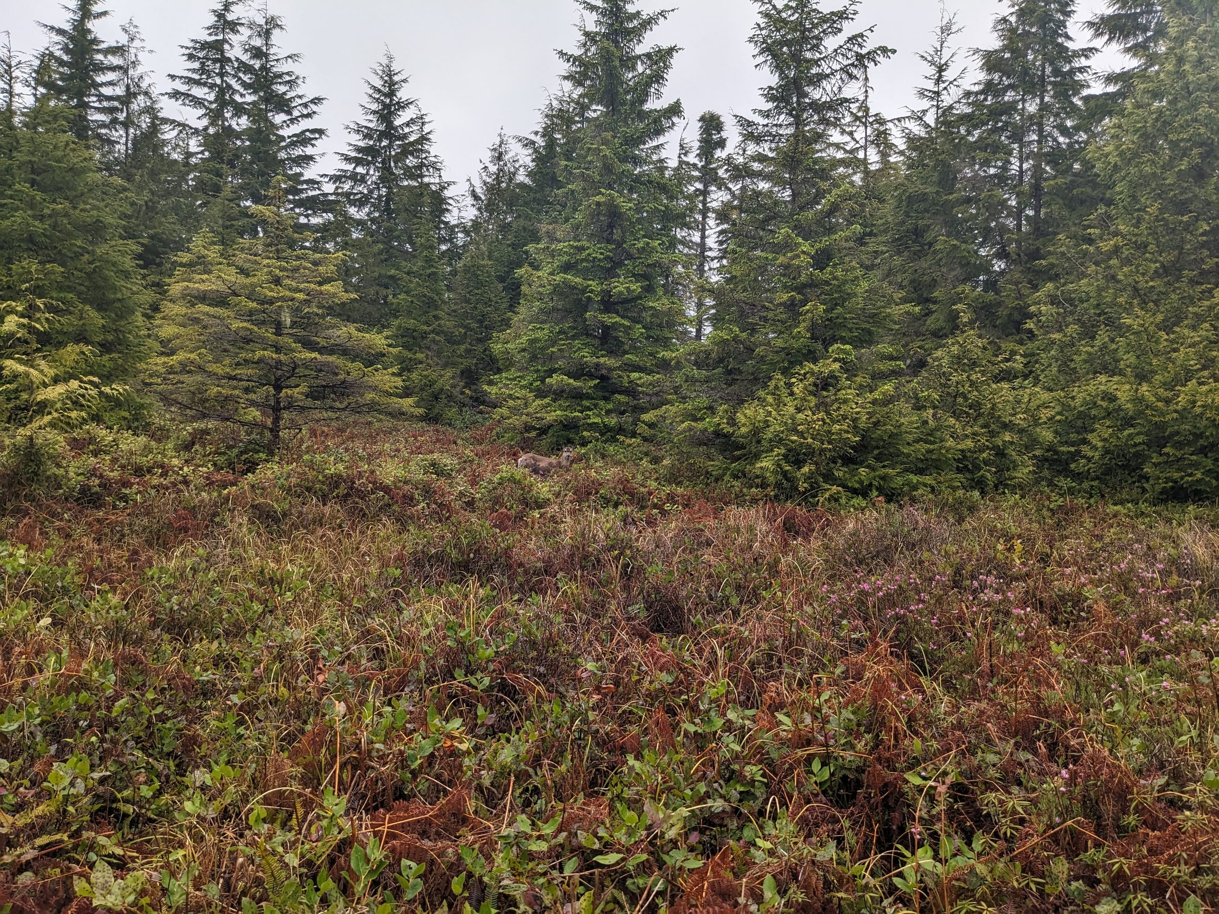 Gradually the thick forest gave way to some small meadows as we got closer to the coast. I’m not sure if it actually had anything to do with proximity to the coast vs some micro-effect like an old fire, but the effect was the gradual emergence into the open coast.