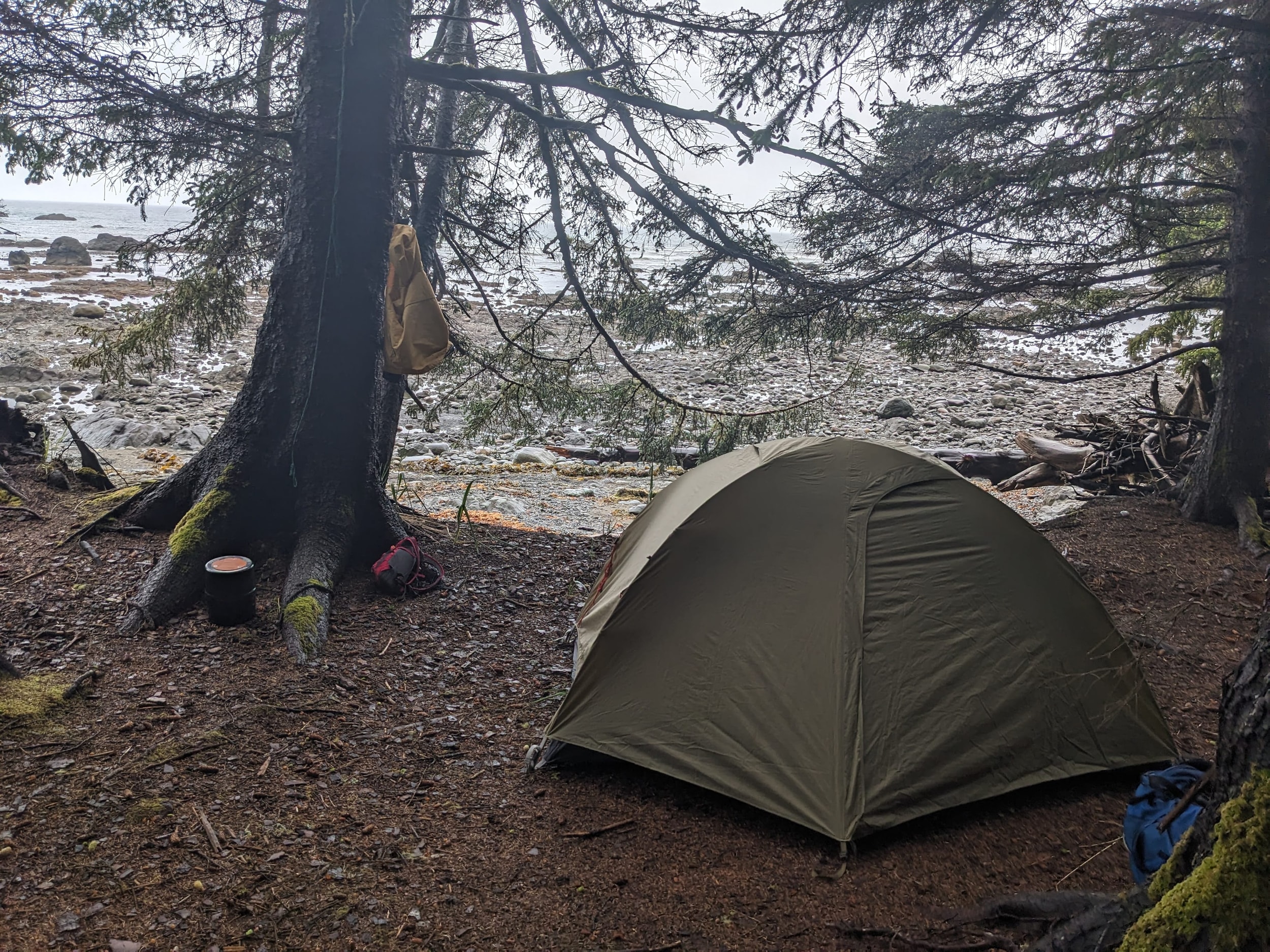 We found a camp just past wedding rocks that was 5-6 feet above the sand. We had to climb up a short rope to get into camp (adding to the adventure) and we ended up with a beautiful view of the coast from our tent window. I got to work setting up the tent and getting ready for dinner while…