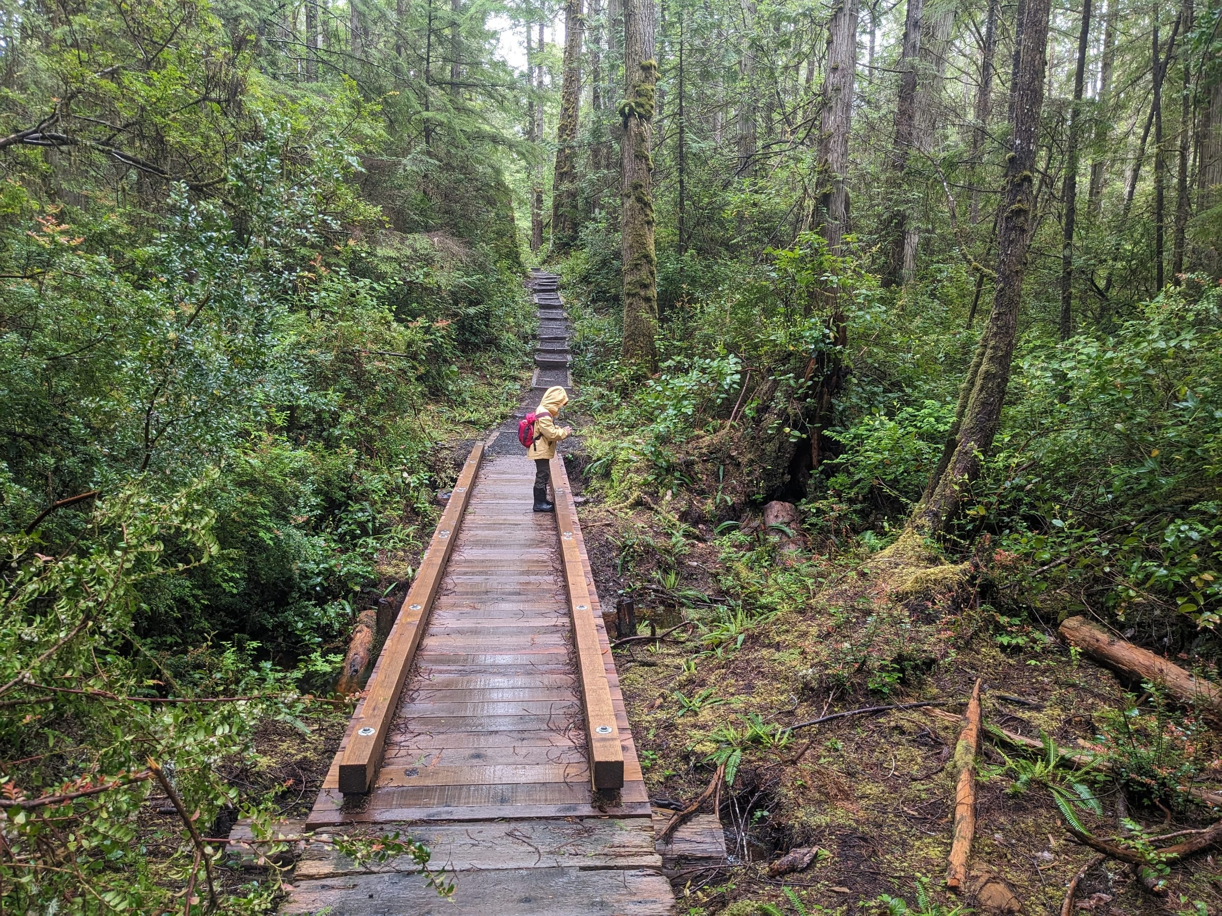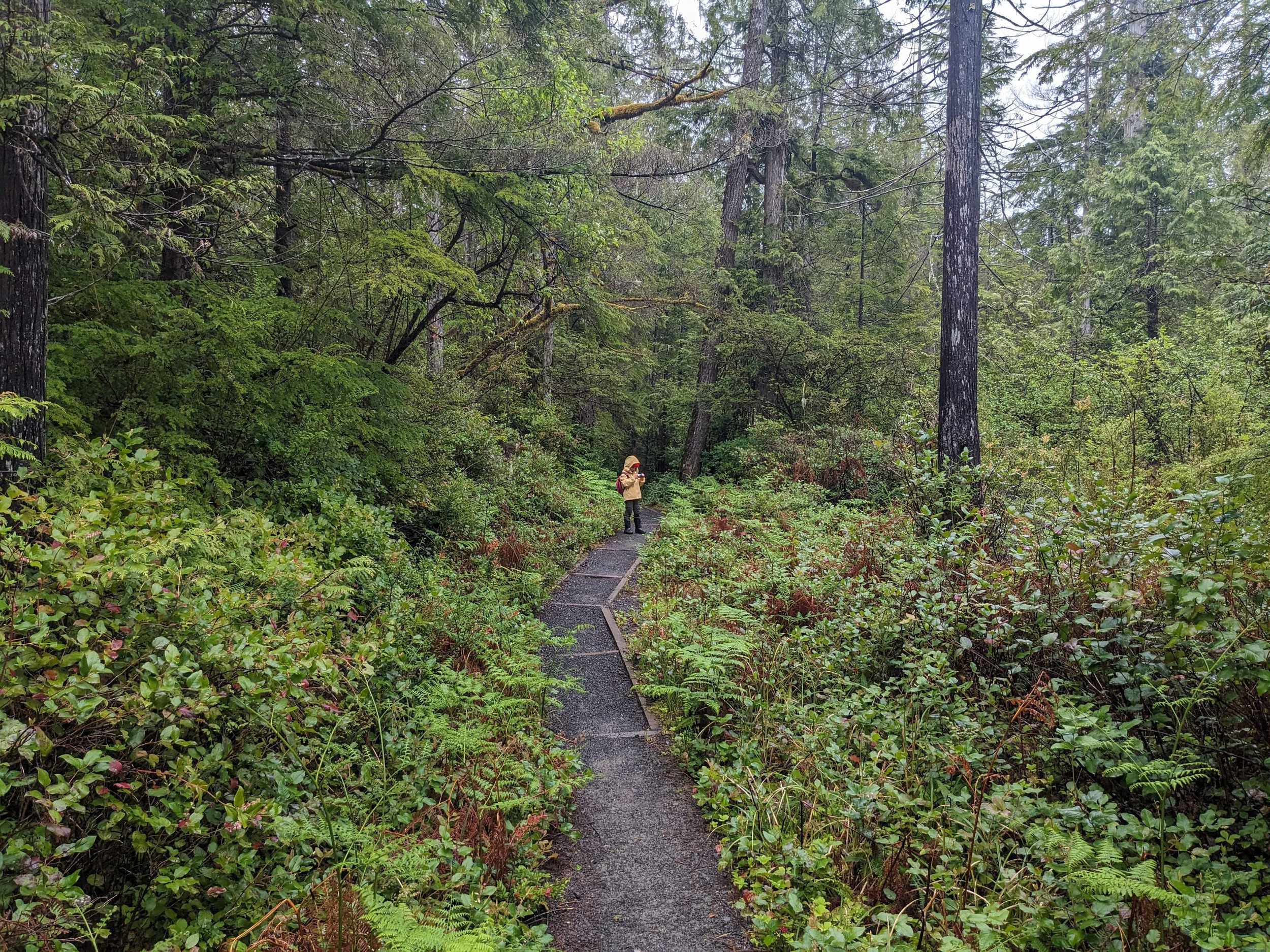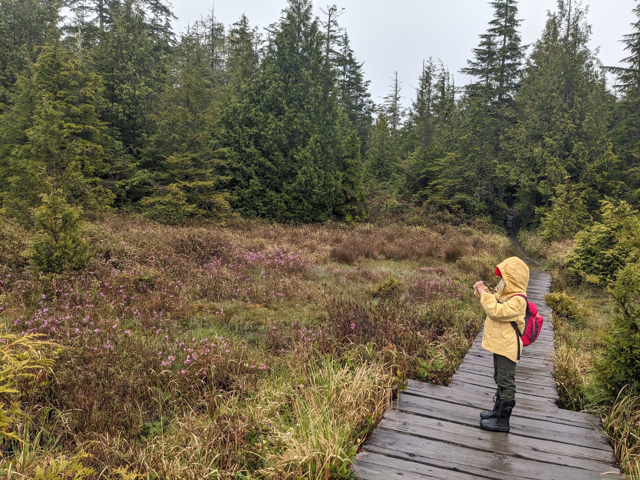 The first leg of the trail is through the dense rainforest - with about half the trail on boardwalks over wet bog/swamp land. As it’s still early in the season, we didn’t see any berries but we found blueberry, salmonberry, and salal berry plants all along the trail with the little flowers that will become the berries in a few months.