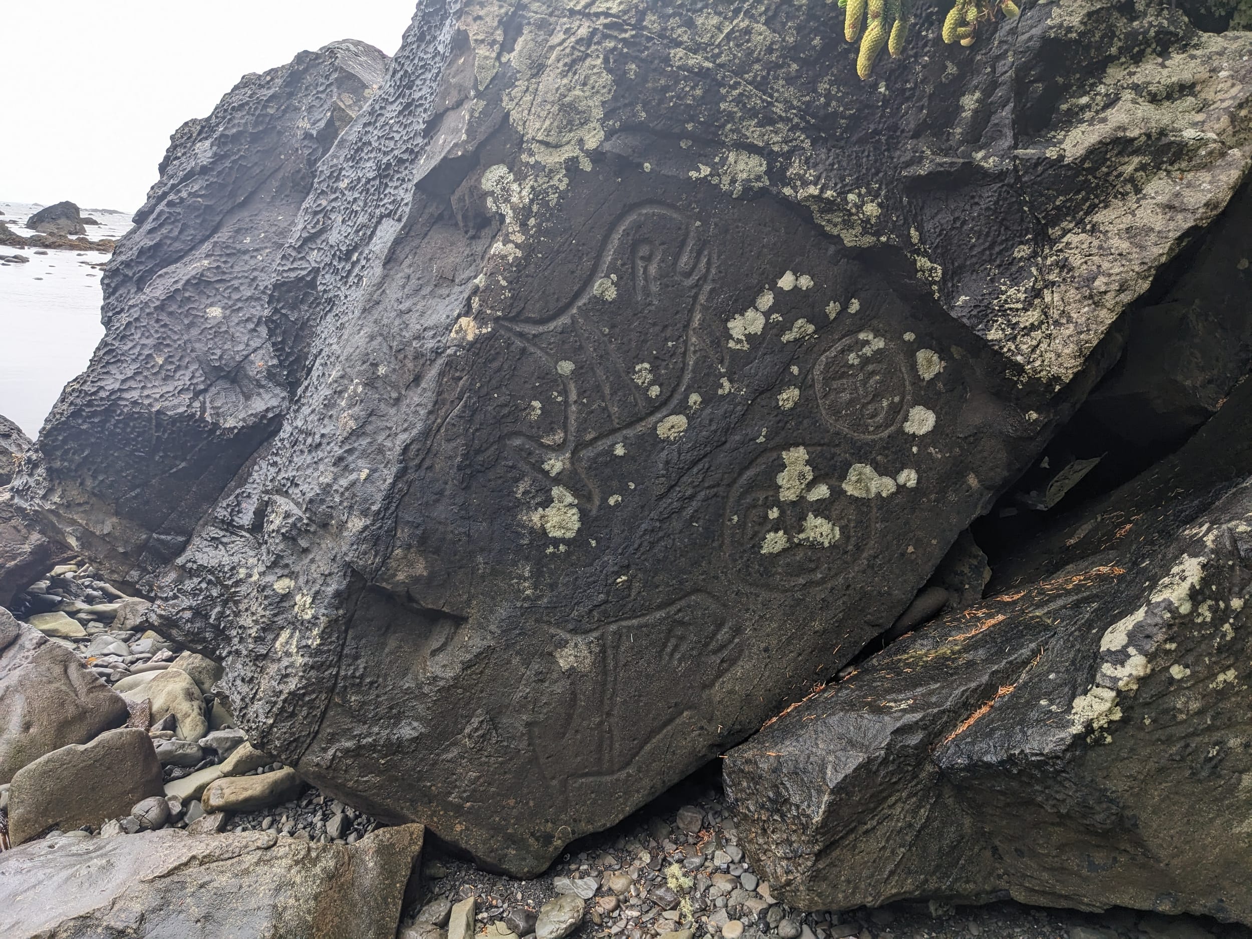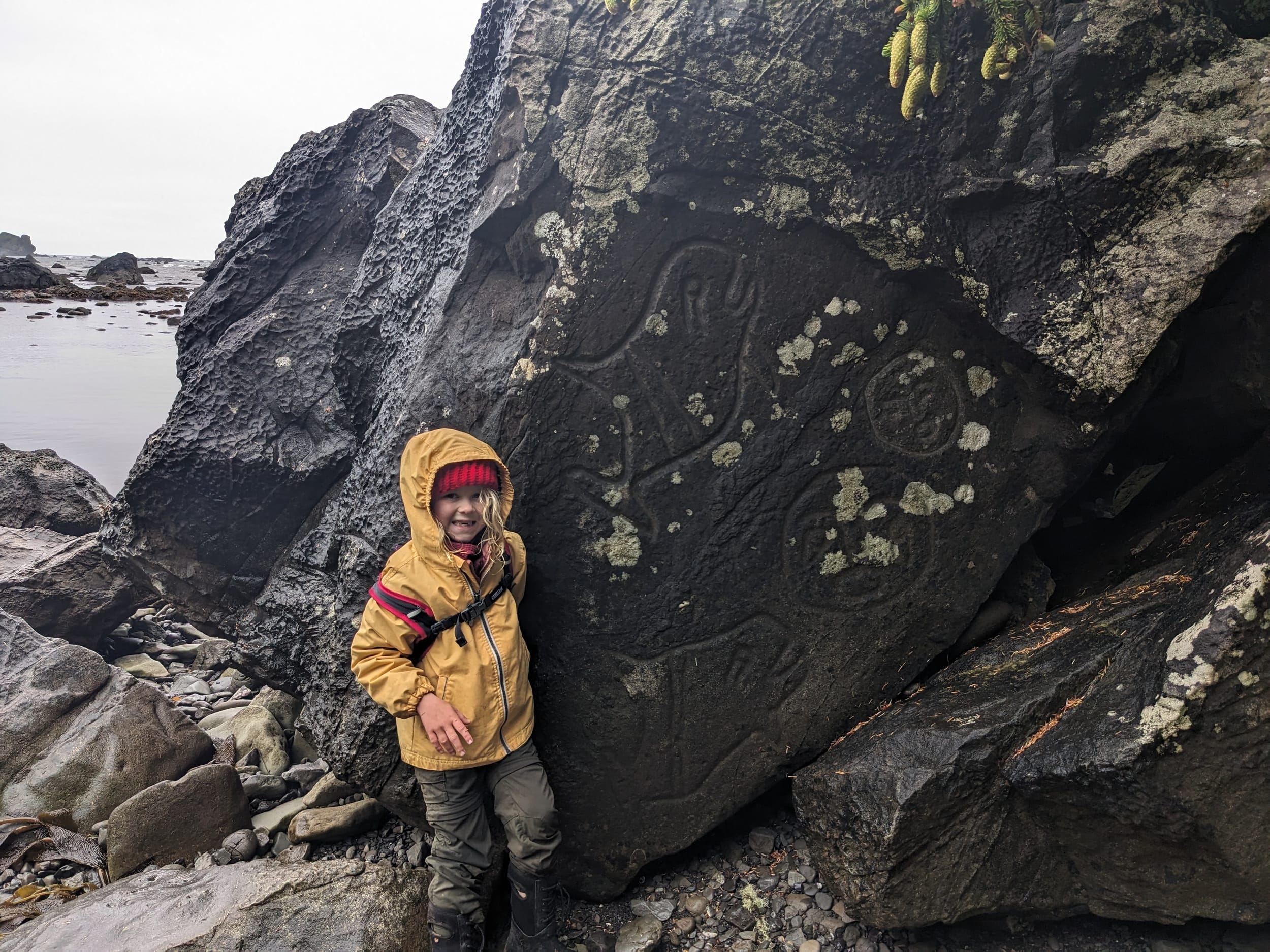 Wedding rocks was supposed to have petroglyphs on it and we were able to find them just before we made camp. They reminded me a bit of the petroglyphs in Wrangell AK. We learned there that carbon dating doesn’t work for the coastal/tidal petroglyphs so experts sort of guess when they were made. My guess was that these were not actually that old (I had the same suspicion in Wrangell), but you just never know…