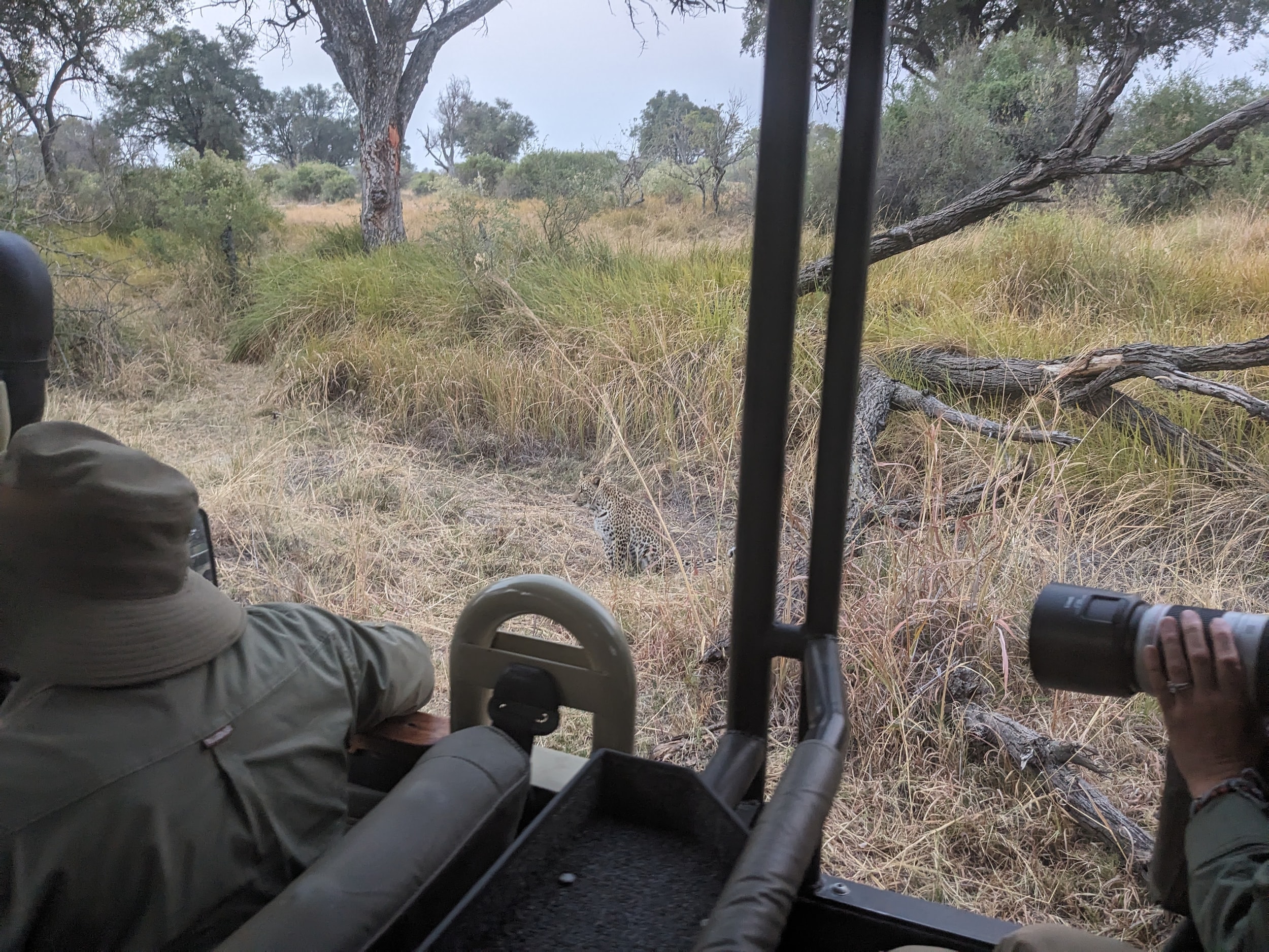 On our way back to the camp, we found another Leopard - this one was only a couple of hundred feet from our camp. He was stalking some bush buck who had wandered into our camp. We watched him for a bit, and then he crossed under the fence and started heading towards the tent we were staying in. Our guide drove us around and then drove in between our tent and the leopard. True to form, the leopard didn’t care about the truck, but the moment we put our feet on the ground - he was off like a light!